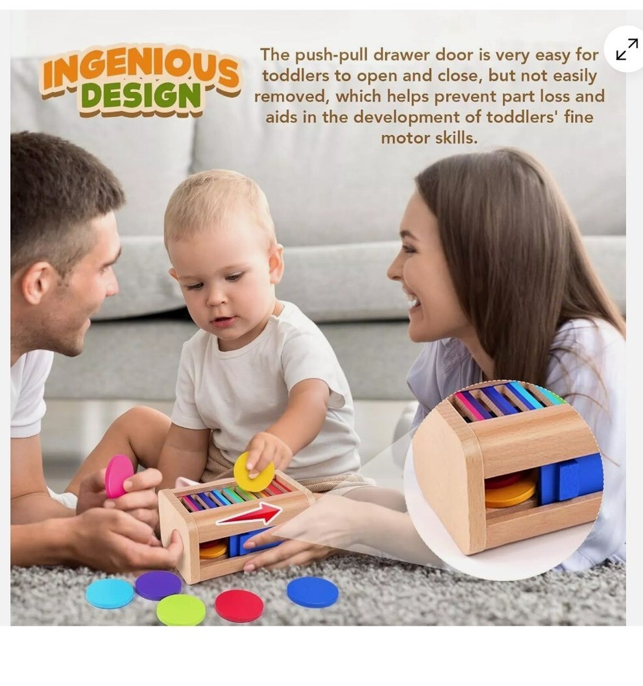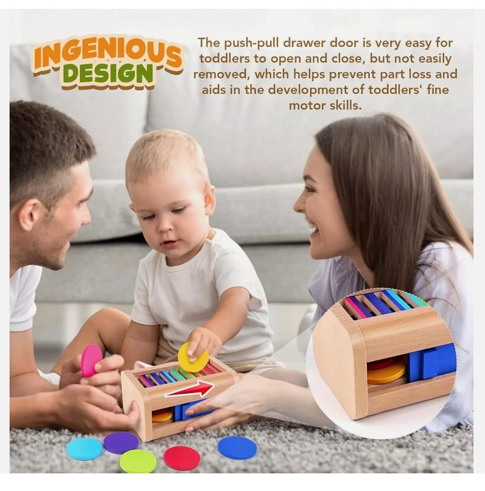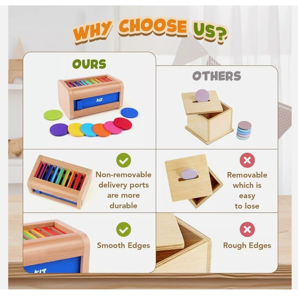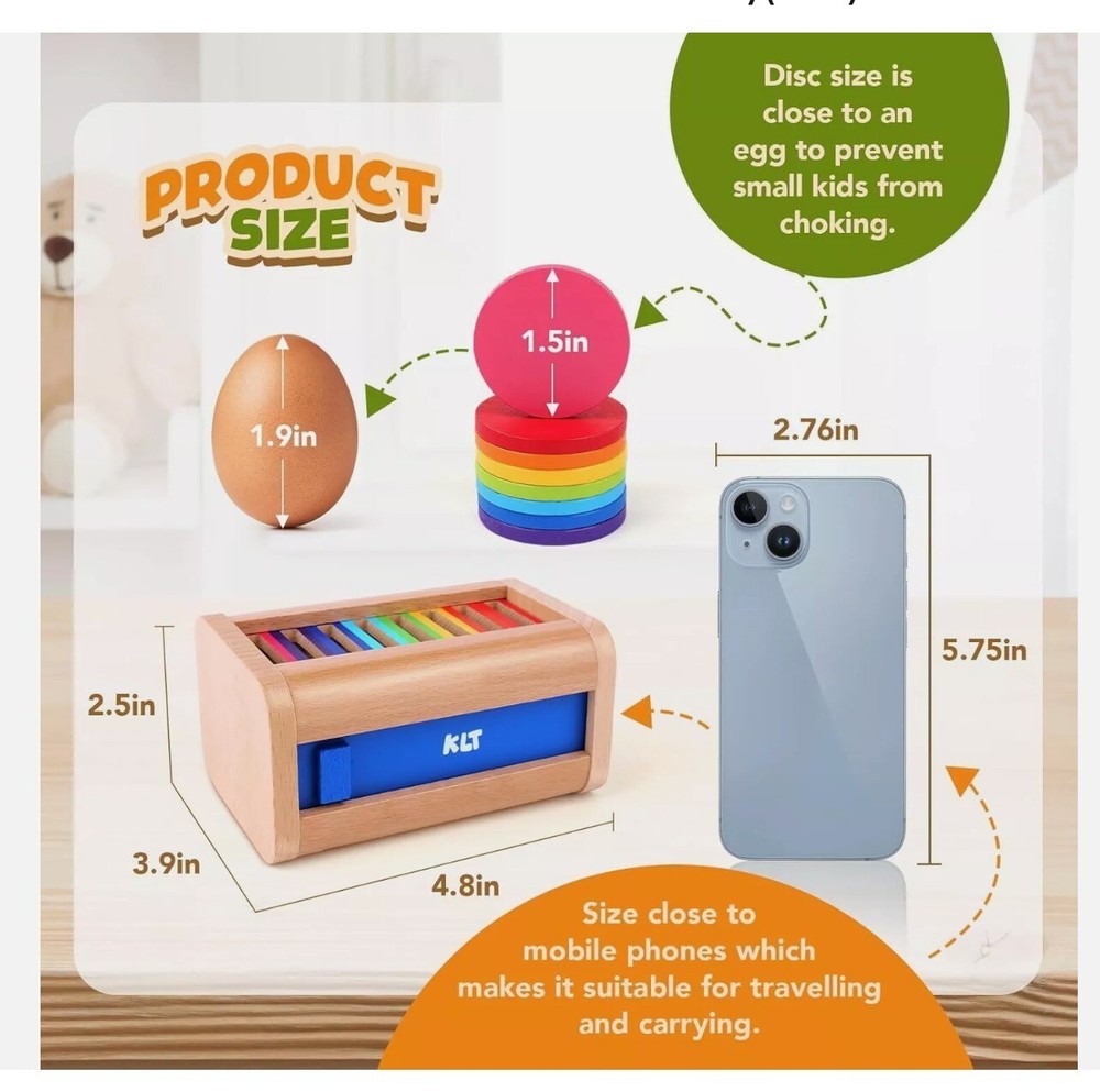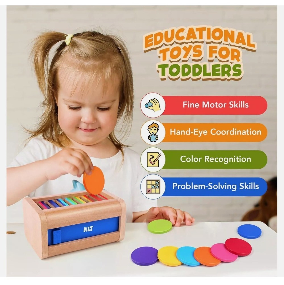KLT Montessori Toys for 1-3 Year Old: Wooden Learning Color Sorting Drop box Product Details Product Dimensions: 5.9 x 3.9 x 3.9 inches Item Weight: 8.8 ounces Country of Origin: China Manufacturer recommended age: 12 months - 10 years Manufacturer: KLT Wooden Coin Box for Toddlers: Montessori Toys for 1+ year old with 8 colored discs and a slide door to lock and keep all pieces together! These color sorting sensory toys are fantastic for engaging and educating children. It enhances fine motor skills, hand-eye coordination, color sorting, and problem-solving abilities, offering double the fun and learning for children aged 1-3 years Safe and Durable Construction: Crafted from premium-quality, durable beechwood. All surfaces are carefully polished with smooth, burr-free edges, ensuring a safe playtime experience for toddlers. This color sorting toys fot toddler meets U.S. safety standards, ensuring a choking-hazard-free play experience for toddlers. The top screwed on, and the front slide door is non-removable to prevent parts from being lost Perfect for Montessori Education: The compact size specially designed for little hands makes the montessori toys easy to hold, and the vibrant rainbow colors grab toddler aged 1+ attention for a long period. The disc slide through the holes easily which is of course important for toddlers baby who can get frustrated easily. Keep toddler away from electronics as they enjoys playing with it for hours Portable travel toys: The activity is portable because of the size is small enough to chuck in your bag and bring on the goand. It's a good one-to-one activity, enabling toddlers to enjoy the toy at home, in the classroom or on road trips. Great little educational toys for 2 year old, exercising toddlers pincer graspto to keep their hands busy and distracting them from being fidgety on the road Ideal Early Learning Gift: The color matching toys is not only fun but also helps in developing color recognition, fine motor skills, and problem-solving while enhancing the parent-toddler relationship, making it a great gift for boys and girls on birthdays, Easter, Children's Day, Christmas, and more. Perfect preschool toy for parents and teachers who hope to promote learning and development through play. Contact us: We can be contacted at any time through eBay messages if you have any questions, comments or product requests. We will respond to you within 24 hours and do our best to help you out! We encourage our customers to contact us with any questions or concerns! We'd like to be sure you are completely satisfied with your purchase.