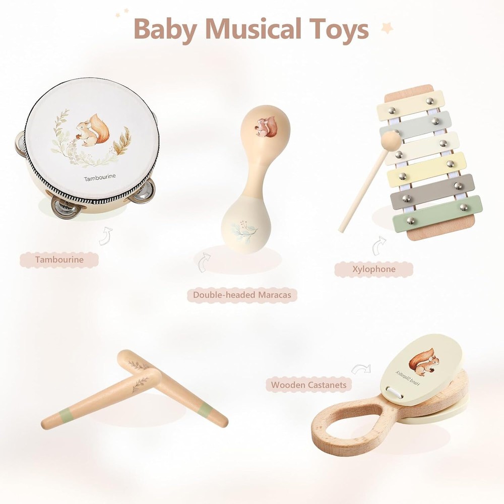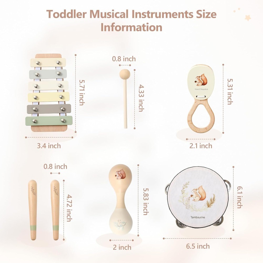This adorable wooden musical set is a hit with my little one! The bright xylophone, fun tambourine, and rattle-like sand hammer keep her engaged while developing rhythm and coordination. The pieces are perfectly sized for tiny hands, made from smooth, safe wood, and produce lovely soundsβno annoying plastic noise! She loves shaking, tapping, and discovering different tones, and I love the Montessori-inspired learning. Great quality, endless entertainment, and a wonderful way to introduce music early. Highly recommend!