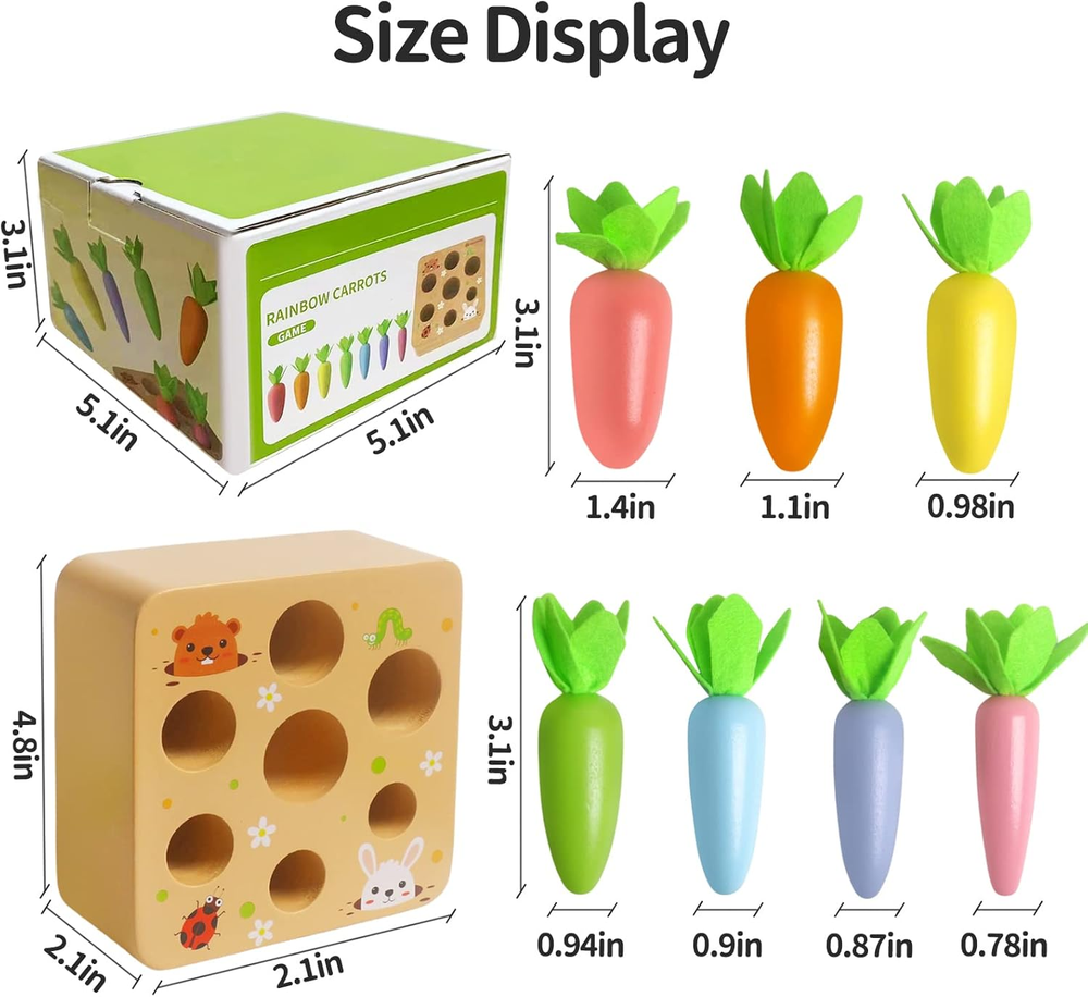Safe Material of Sorting Carrots: The wooden carrot toys is made of wood, dyed with water-based paint. Colorful printed pattern with rounded corners and smooth edges and will not harm the baby's skin. It can ensure that your boys and girls play safety. Wooden Carrot Harvest Game: The Montessori Toys is a new kind of learning toy for toddlers. Develop your children's sorting skills through carrot sorting wooden toys. 7 different sizes of cute carrots of different sizes to match with holes for your child to explore, help your child exercise his intelligence and size exercise, and put it into the correct size slot. Help build strong fine motor skills and hand-eye collaboration. Educational Montessori Learning Toy: Carrots are very cute and easily arouse toddlers' interest. By playing with carrot sorting toys, you can develop good motor skills, hand-eye coordination, shape recognition, size and concentration. Very suitable for proficient in motor skills, sizing and finishing. It is a great toy for preschool learning and training personal skills. Cute and Realistic Design: Take the wooden carrots out of the holes, try to reinsert them into the correct slots, or plant them, harvest, etc. Lovely farm landscape with cute rabbits and bugs on it to make them look more real. Use these carrots in the imaginative game of the garden/farmer market, or in the pretend kitchen. Toddler Festival Gift: The carrot harvest game is a great fun and educational montessori toy, the cute design will always catch babies' eyes, suitable for your baby boy and girl. The perfect ultimate gift idea as a Christmas/birthday/holiday toy for baby boys and girls 1 2 3 years old. Product Description Carrot Harvest Wooden Matching Puzzle, Shape & Size Sorting Game for Developing Fine Motor Skill, Montessori Preschool STEM Educational Toys for Kids Toddlers Boys Girls ADVANCED FEATURES Improve your intelligence Improve the hand-eye combination Improve your thinking IQ level Improve color perception It‘s a good item to get the children off the video games. FUN SORTING GAME The Montessori Toys is a new kind of learning toy for toddlers. The wooden toys have 7 different size carrot and 1 base which has 7 different holes to match carrots. Size: 5.1*5.1*3.1 inches, Weight: 15.87 oz. EDUCATIONAL MONTESSORI LEARNING TOY Carrot harvest matching toy helps developing memory skills, hand-eye coordination , size, shape recognition and concentration. Perfect for preschoolers, kindergarten, toddlers and older kids. Let kids trying how to match the carrots to the correct sized holes. helping build strong fine and gross motor skills. HIGH QUALITY&SAFETY MATERIAL Montessori wooden toys with vironmental and high quality wood, Non-toxic water-based paint. The edges of the Montessori wooden toys for toddlers are smooth and won't hurt the baby's skin. Suitable blocks size, large enough to avoid accident swallow. CARROT HARVEST MATCHING Chunky carrots make it easy for baby to grasp, simply put the carrot into the hole. each an features a different, pair with size and shape, let your kids love the challenge of finding where the carrot fit. GREAT GIFT CHOICE Chunky carrots make it easy for baby to grasp, simply put the carrot into the hole. each an features a different, pair with size and shape, let your kids love the challenge of finding where the carrot fit.