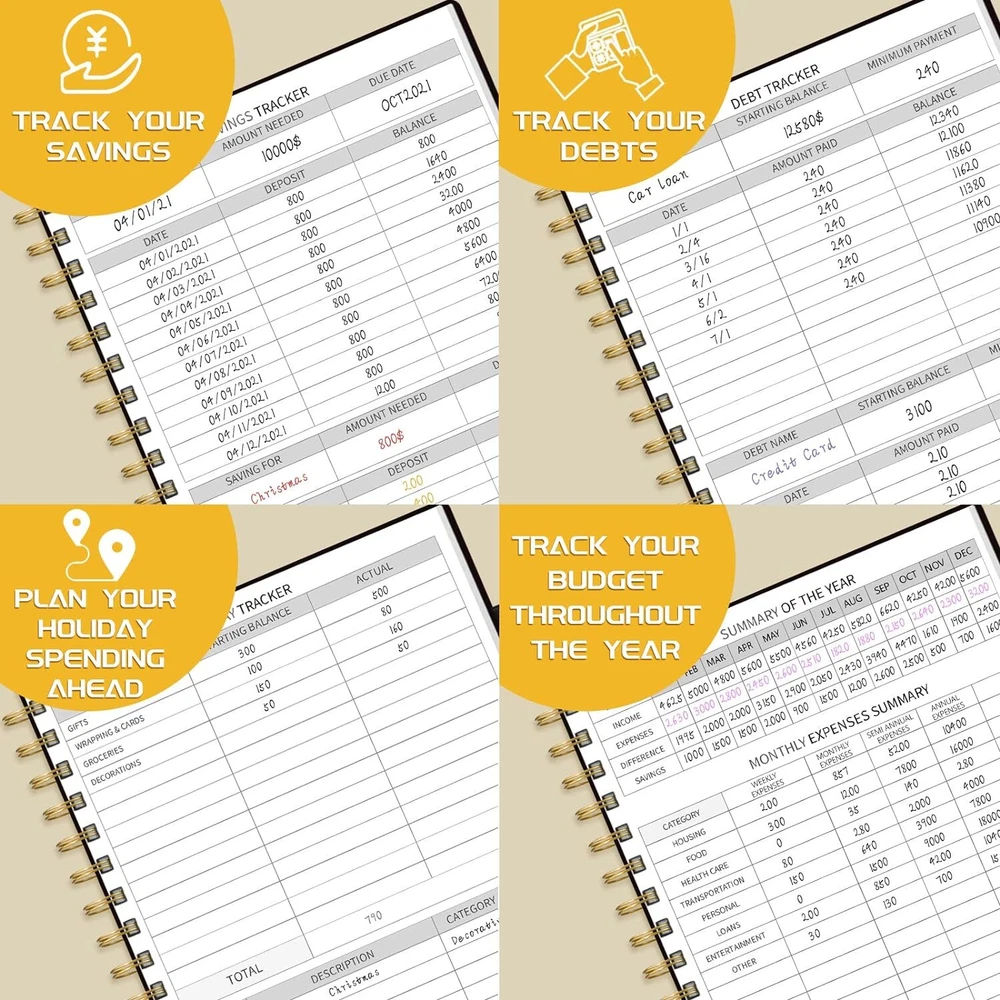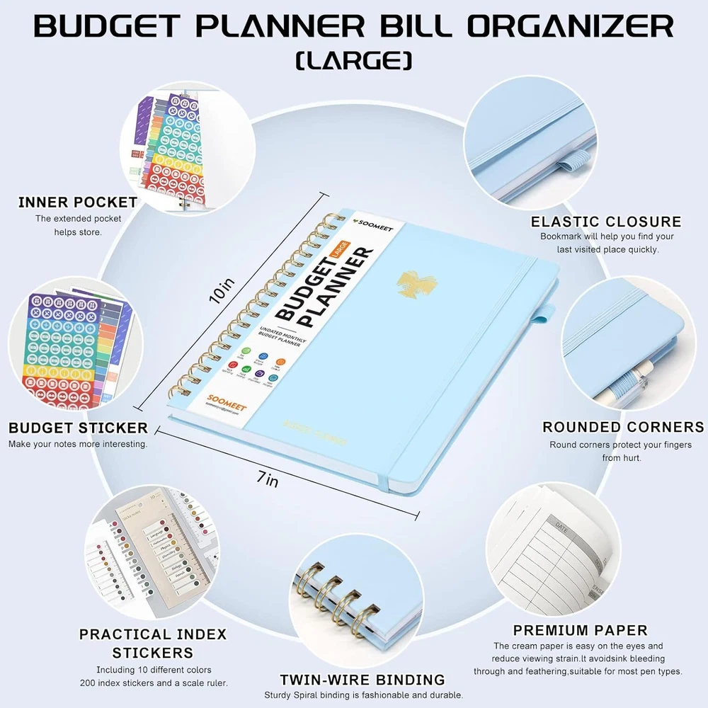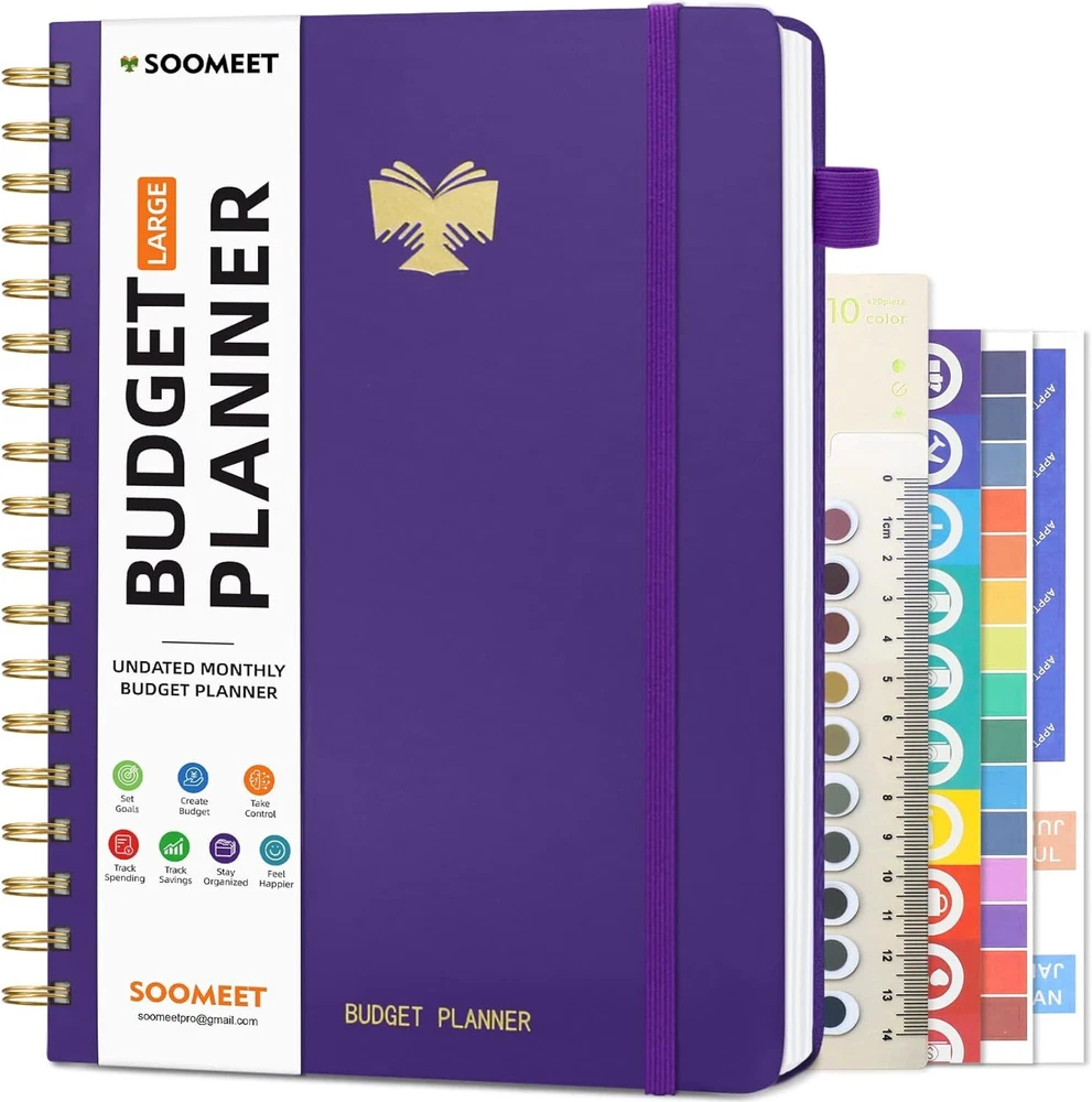 About this item MANAGE YOUR MONEY EFFECTIVELY TO ACHIEVE YOUR FINANCIAL GOALS: This budget plan contains personal finances, savings, budgets, debts, payments, bills due, cash flow, and expense tracking. help you organize your money, by using this budget planner, you can become a personal finance and budgeting expert. SET GOALS AND STAY ON TRACK: The 12-month budget planner helps you set monthly goals, create a budget, review and develop monthly habits, monetary strategies, and action plans. plan your monthly budget with predefined expense categories, review your monthly budget at the end of the month, reflect on your achievements, and think about how to improve next month. ELEGANT AND FUNCTIONAL PERSONAL FINANCE: The financial ledger starts with 1 page of financial goals, 1 page of categorized financial strategies, 4 pages of expense tracker, 1 page of monthly reflection, 1 page of notes, through the 12 month plan, additional multiple layouts combined with annual summary to track progress throughout the year. PREMIUM QUALITY: Budget Planner is 7 x 10 inches, suitable for carrying, vegan leather hardcover with an elastic band, a pen holder, a pocket for bills and receipts at the back of the money planner, and thick 100gsm no-bleed paper. this budget plan and account book comes with 1 set of index stickers and 1 set of currency navigation stickers to help you use them better. Take control of your finances Do you try so hard to stick to your budget, often only to find that you’ve overspent again? You just need the right guidance to keep you on track. Use Budget Planner & Bill Organizer is designed to cover all of your financial bases so that you can set goals, spend well, and start saving. Keep important documents safe Set monthly goals, create budgets, review and develop monthly habits, monetary strategies, and action plans. 12 monthly bill pockets keep all your documents organized and always with you. Master money management and budget with ease Prepare for your financial future Start putting your finances in order today, a 12-month, undated financial plan. The 7" x 10" layout is full of planning prompts, leaving plenty of room for detailed planning. Exquisite Inner Pocket Hard Cover and Premium Paper Currency Budget Stickers 200 Index Stickers and A Scale Ruler Elastic Closure Rounded Corners Detail Protection Set financial goals Choose the financial goals you want to achieve in each segment over the next 12 months and outline the strategies and tactics that will help you achieve it. review your progress at the end of each month and find new ways to keep it going. Practical financial management It all started with a plan! Write down your monthly financial goals each month. Record reminders for bills and payments on your calendar. Before you spend, make a monthly spending plan. Plan your monthly budget with predefined expense categories. During the month, track your daily expenses. At the end of the month, review what happened, spot bad spending habits, and think about how to improve next month. Funny auxiliary stickers Fun stickers add spice to your financial projects, and whether you buy one for yourself or as a gift, it will feel like a treat.