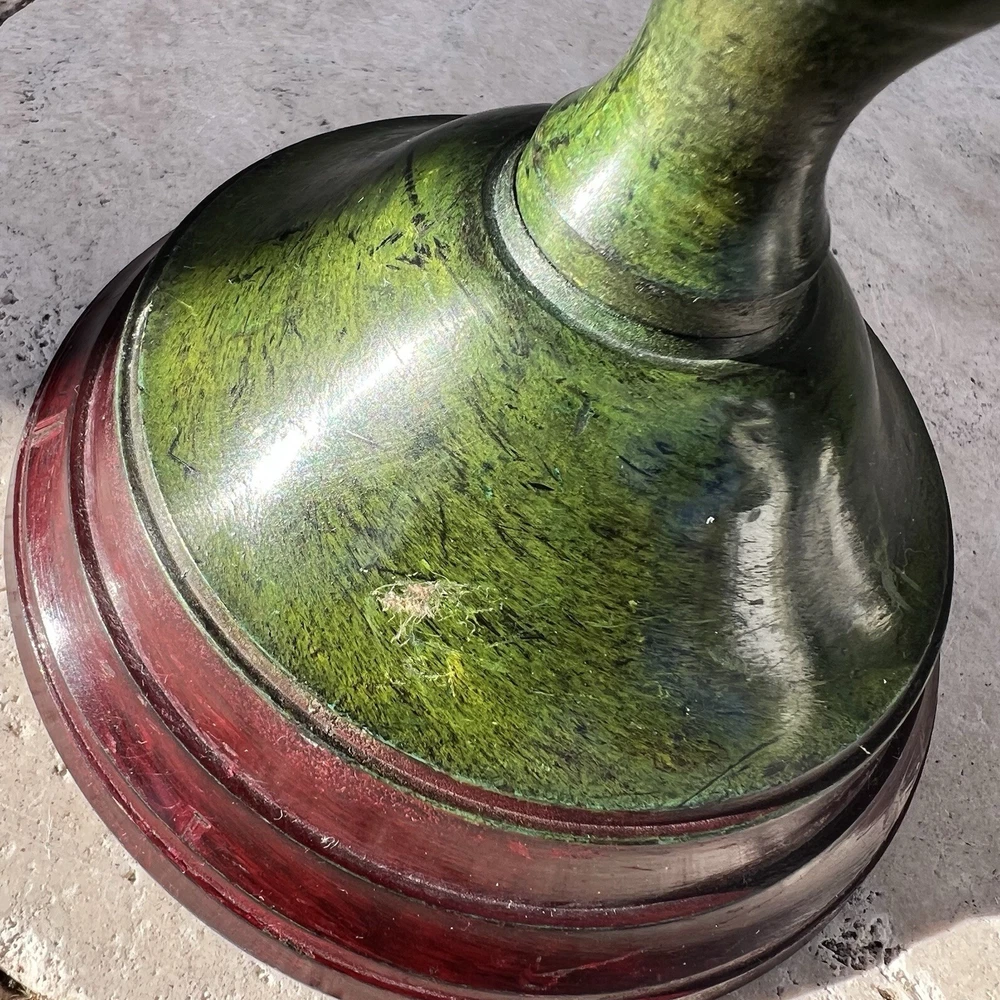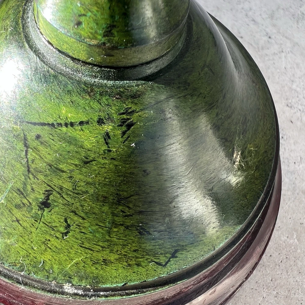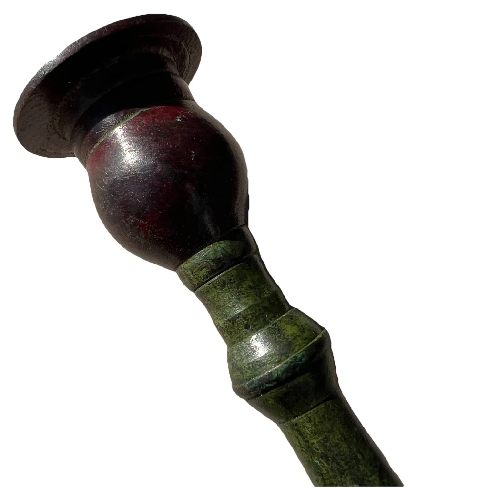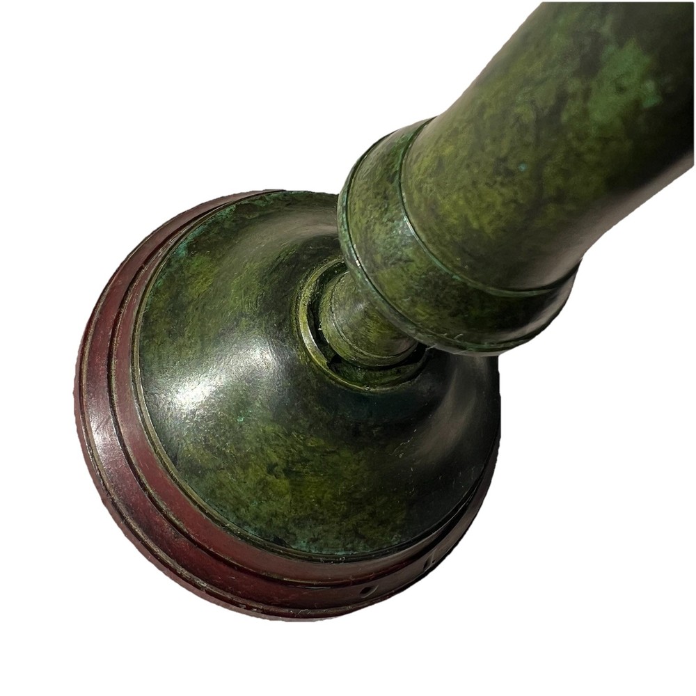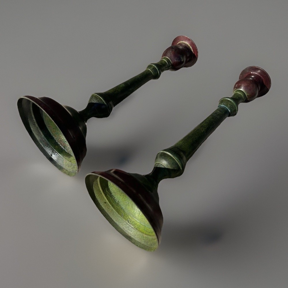 Striking vintage graduated candlestick set featuring a rich faux-verdigris green finish over heavy cast metal construction. This pair has a classic Colonial Revival silhouette with stepped round bases, tapered column stems, and wide drip plates — substantial statement pieces for mantel, console, or dining table styling. These are solid and heavy, with a quality feel and strong presence. The aged green patina gives depth and character, complementing traditional, eclectic, and Hollywood Regency interiors. Measurements: • Taller: 12” H • Shorter: 10.5” H • Base diameter: 5” Material: Heavy cast metal (likely cast iron) with applied antiqued verdigris finish. Slight magnet attraction present, consistent with iron or mixed metal construction. Condition: Good vintage condition with surface wear consistent with age. The verdigris finish shows natural variation and minor rub areas that enhance the aged character. No structural damage noted. Threaded assembly intact and stable. If you would like to see additional photos, please don’t hesitate to ask. I accept returns within 14 days of delivery; buyer must contact me within 3 days. Buyer pays return shipping with tracking; full refund issued once item is received in same condition. Colors may vary due to lighting/screens; buyer should check measurements. I do not launder pre-owned clothing before shipping; recommend following care labels. I remove lint but some may remain. Purchases Fri–Sun ship Monday; weekday purchases ship next day. I offer bundle discounts and direct buyers to my other listings at Layersburg. I pack items carefully to ensure safe delivery.