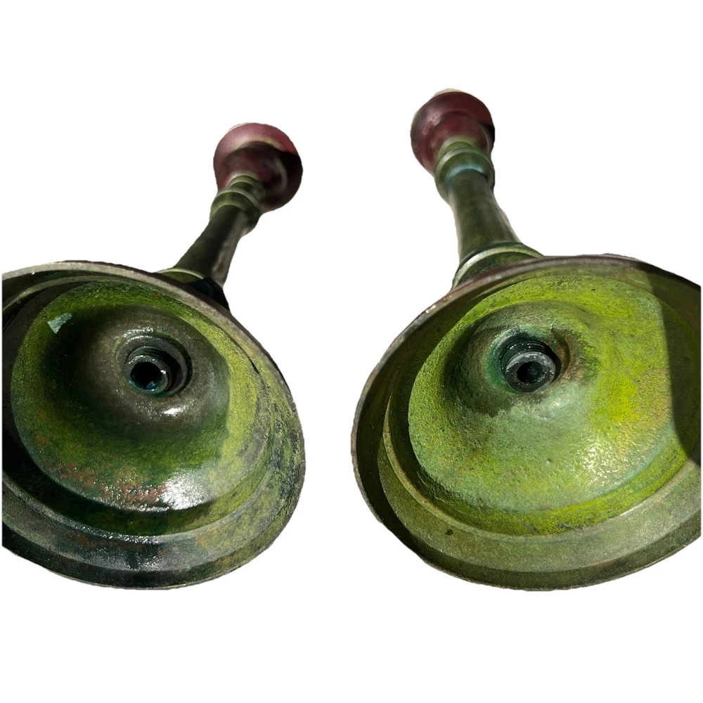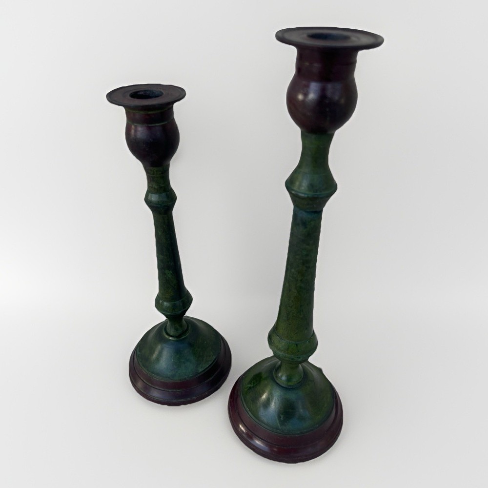 Moody Green Verdigris Cast Metal Candlestick Holder Pair Revival Decor