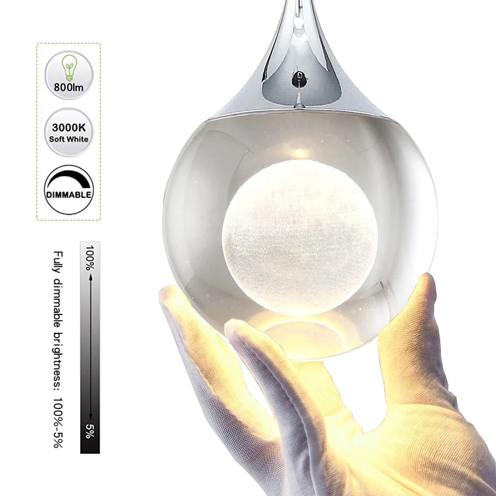Premium LED Pendant Light with ETL Certification, using high-quality iron, aluminium, and crystal materials and advanced laser-engraved pattern and surface plating treatment for a high-quality chrome finish, this crystal pendant light has good light transmittance, refraction effect, hardness, and texture. With a 3D moon inside the crystal, it's beautiful when the light is on; you will see the shining moon, which can bring an elegant and unique decoration to any room. Just like a waterdrop or teardrop, creating an elegant atmosphere in your room can be installed in the living room, dining room, bedroom, kitchen island, study room, foyer, etc. It'll be better for you to decorate your home with 1 or 2 or 3 of these pendant lights.Four colors: please note that the light is tinny; please Free Shipping Over $49.99* Details Moon Crystal 1-light Single Globe LED Hanging Pendant Light in Gold/ Product Description: Premium LED Pendant Light with ETL Certification , using high-quality iron, aluminium, and crystal materials and advanced laser-engraved pattern and surface plating treatment for a high-quality chrome finish, this crystal pendant light has good light transmittance, refraction effect, hardness, and texture. With a 3D moon inside the crystal, it's beautiful when the light is on; you will see the shining moon, which can bring an elegant and unique decoration to any room. Just like a waterdrop or teardrop, creating an elegant atmosphere in your room can be installed in the living room, dining room, bedroom, kitchen island, study room, foyer, etc. It'll be better for you to decorate your home with 1 or 2 or 3 of these pendant lights. Four colors please note that the light is tinny; please check the size before purchase Gold (dimmable brightness) Chrome (dimmable brightness) Black (dimmable brightness & 3 color temperature) Coffee (dimmable brightness & 3 color temperature) Features: **Customizable Length** The 4.72" canopy and 63" cord offer flexibility to adjust the length to suit your lighting needs, making it suitable for various locations and preferences. **Sophisticated Craftsmanship** Crafted from high-quality K9 crystal, this pendant light boasts a solid, heavy crystal ball that reflects light beautifully **Eye-Friendly Feature** The crystal is not only aesthetically pleasing but also gentle on the eyes, ensuring long-lasting use. **Efficient & Long-Lasting** ETL-certified, this pendant light can provide 50,000 hours of illumination with just 5W of energy, emitting 400 lumens of brightness. **Adaptable Design** Perfect for creating ambient or mood lighting, this small, modern pendant light is ideal for decorating the kitchen, above the island, sink, or counter, as well as in the bedroom and bathroom. Specifications: Fixture DesignSingle Fixture ShapeGlobe CanopyYes Number of Lights1 Adjustable Hanging LengthYes Number of Light Tiers1 Light DirectionMultiple Directions Shade IncludedYes Shade MaterialCrystal Shade ColorWhite Fixture MaterialMetal Metal TypeAluminum Crystal ComponentYes Real CrystalYes Crystal Colorclear Crystal TypeEgyptian Dry, Damp or Wet Location ListedDry Integrated LEDYes Integrated LED Wattage5 Watt Integrated LED Brightness (Lumens)500 lm Integrated LED Color Temperature3000K Integrated LED Rated Lifespan50000 hours Integrated LED Color Rendering Index (CRI)90 DimmableYes Voltage120 Volt Maximum Wattage (Per Bulb)10 Watt Power SourceHardwired Product CareWipe clean with a dry cloth Supplier Intended and Approved UseResidential Use; Non-Residential Use Hanging MethodWire Craftsmanship TypeHand Carved Cable / WiringClear / Standard Plastic Cord UL ListedYes
