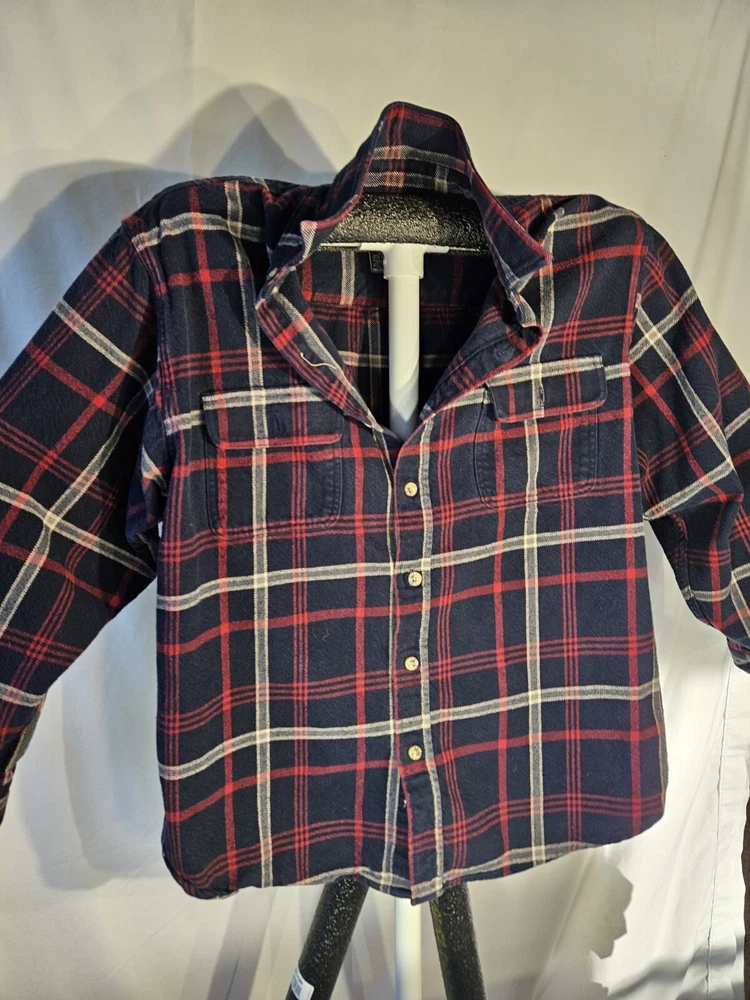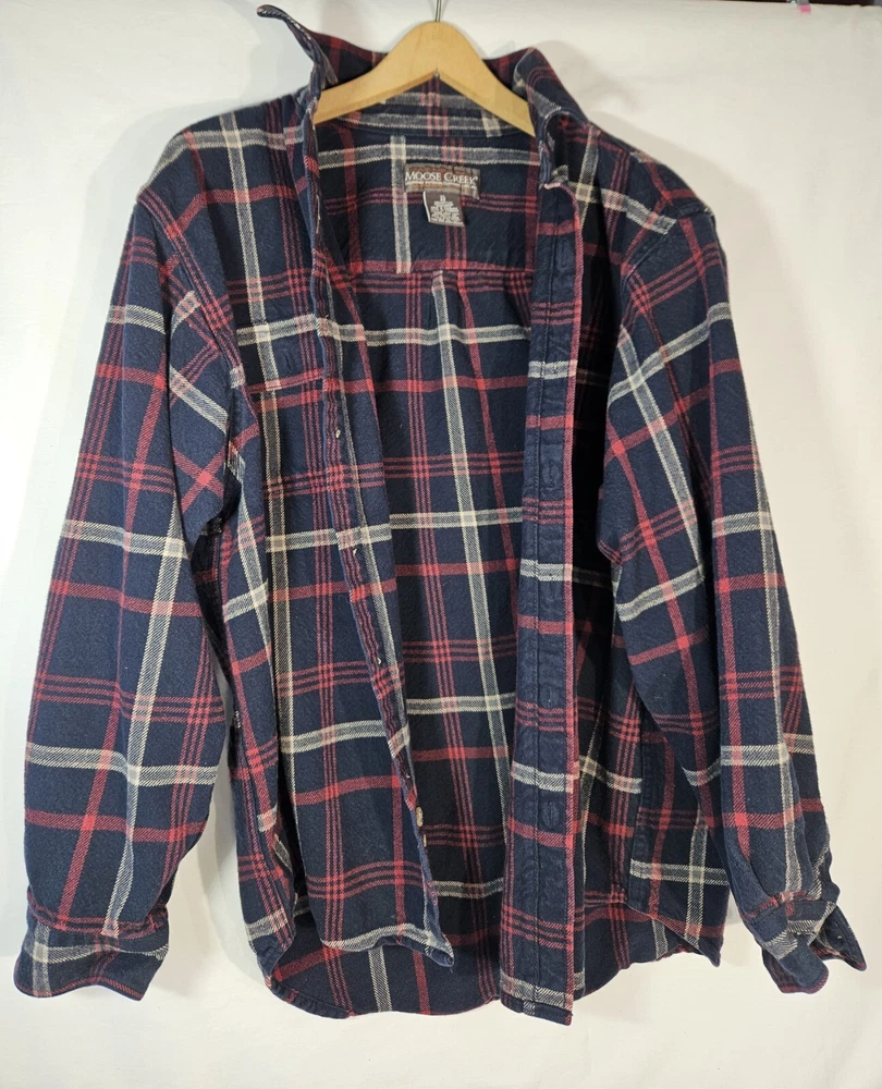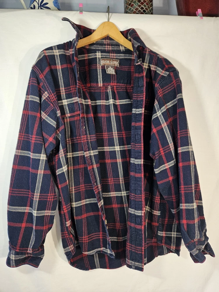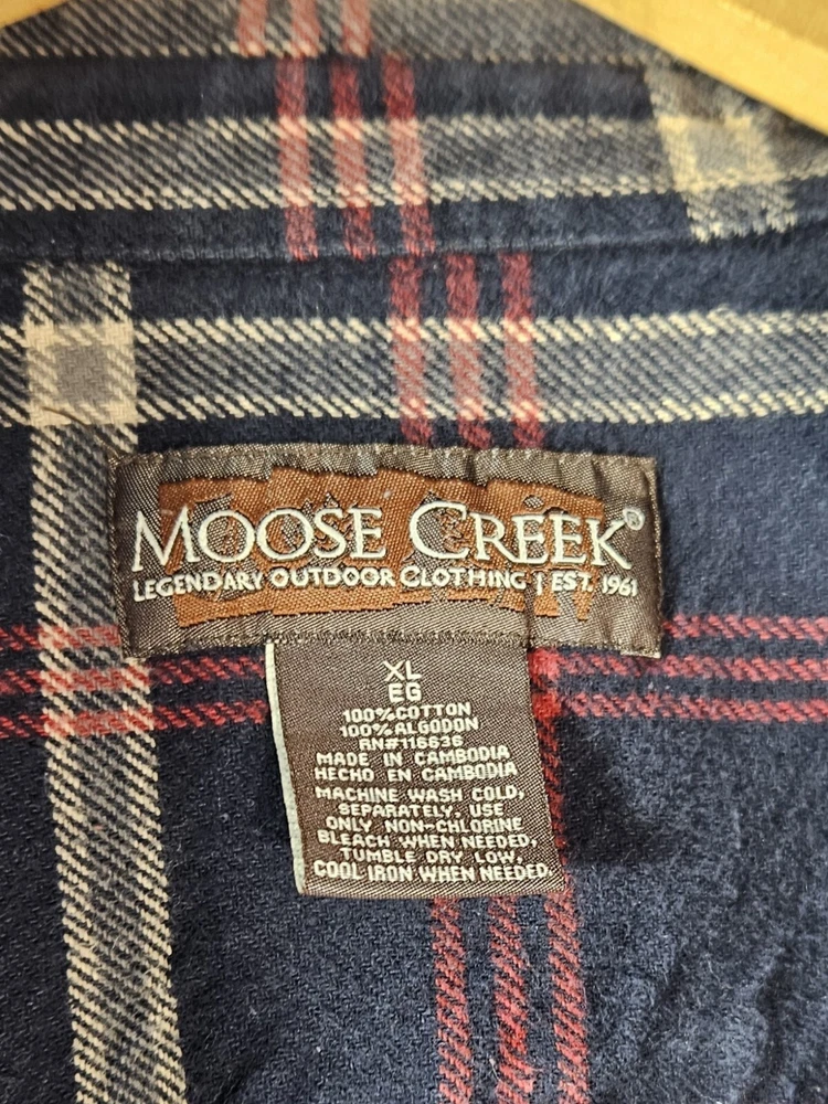 This is a Moose Creek Legendary Plad Long Sleeve shirt for men. It has a striped pattern with a collared neckline and button closure. The shirt is made of heavyweight cotton fabric with a wing collar style. It is designed for big and tall men with an extra large fit. The shirt is multicolored and has button accents. It is part of the Moose Creek product line and is suitable for outdoor and designer themes.