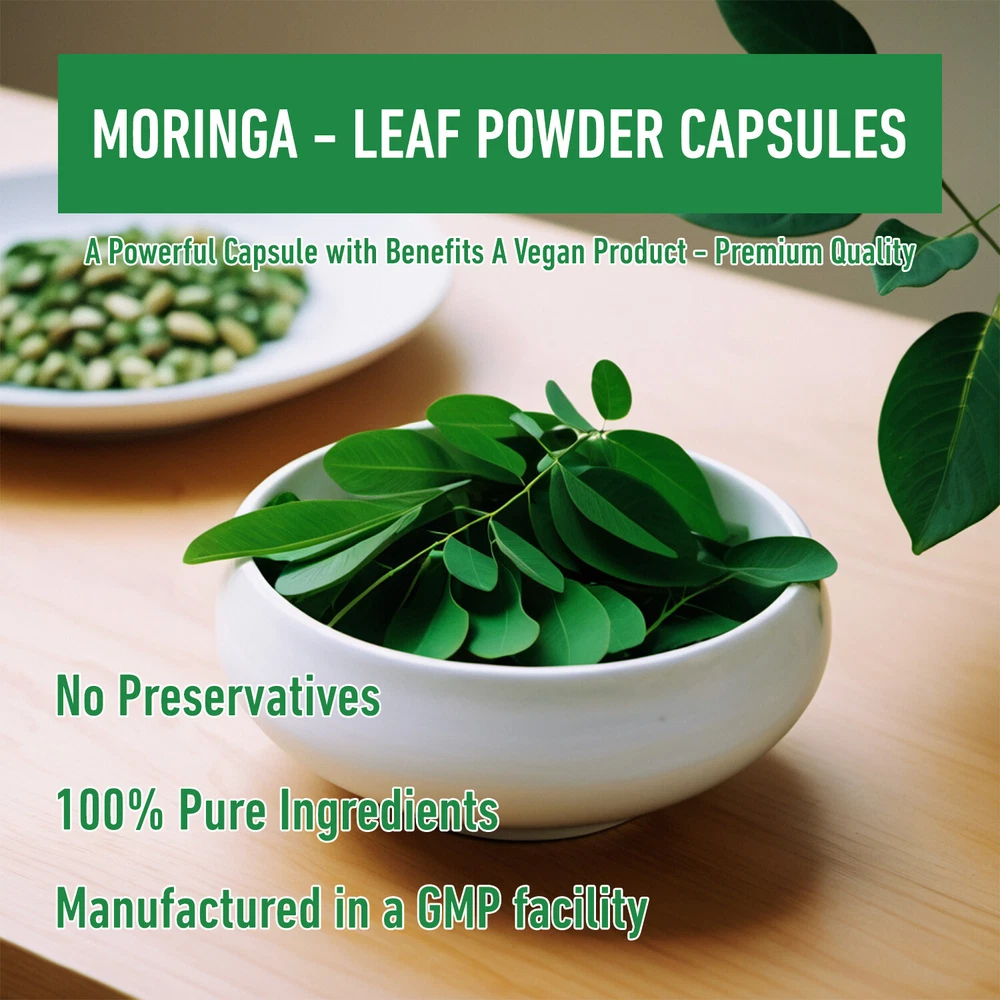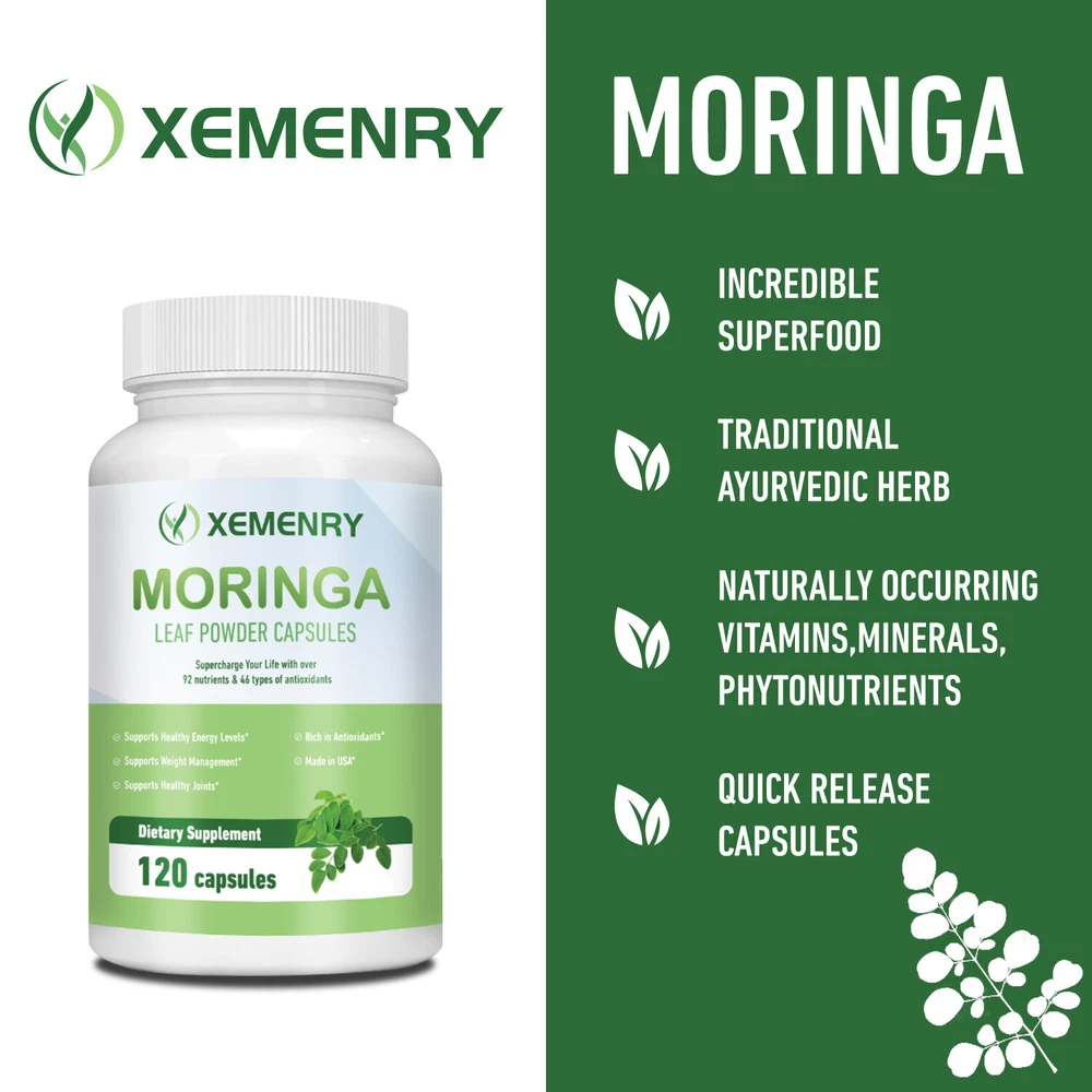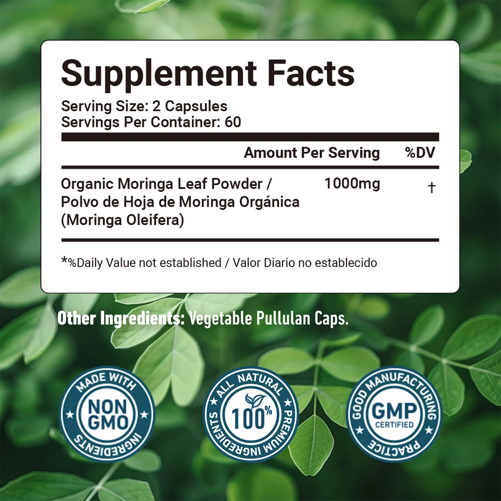 Effects: Weight Loss, Antioxidant Ingredients: Moringa Leaf Directions: Take 2 capsules once daily after a meal. Shipping: Ships within 48 hours on working days. Shelf life: 2 years Description: NATURAL SOURCE OF NUTRITION: Our Moringa capsules are sourced from Moringa leaves and contain a variety of vitamins such as Vitamins C and B, minerals and protein to provide your body with the extra rich nutrients it needs every day! Boosts metabolism and overall health: Moringa also helps support the body's oxidative balance, thereby boosting metabolism, energy and overall health. Moringa's active ingredients include beneficial plant vitamins that help support cardiovascular and digestive health. Non-GMO, pure ingredients, and free of soy, dairy, gluten, preservatives, wheat, fish, eggs, and peanuts. All products are tested by third-party laboratories for safety and efficacy. Document