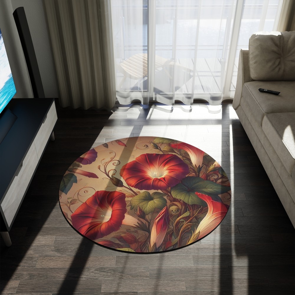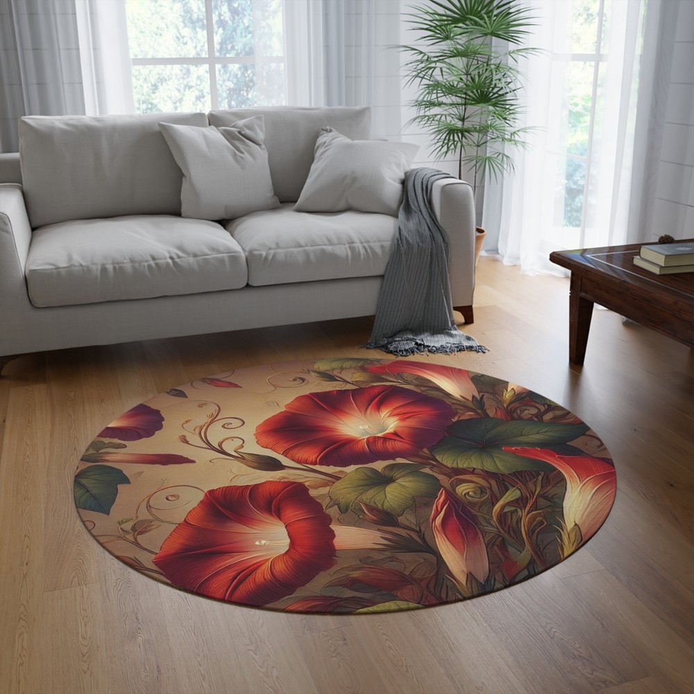 Transform your space with the "Morning Glories" Round Rug , a stunning decorative accent that brings the beauty of nature indoors. Featuring richly detailed red morning glories intertwined with lush greenery , this 60" ร— 60" polyester chenille rug creates a warm and inviting atmosphere in any room. The intricate floral design, printed in picture-perfect quality , adds a touch of elegance and charm, making it a perfect statement piece for living rooms, bedrooms, or creative spaces. ๐Ÿ–ค Features: โœ” Vibrant & Eye-Catching Design โ€“ Gorgeous red morning glories and swirling vines for a bold artistic touch. โœ” Soft & Durable Chenille Fabric โ€“ A cozy, textured surface thatโ€™s gentle underfoot. โœ” Coated Backing & Hemmed Edges โ€“ Ensuring durability and a polished finish. โœ” Perfect Size (60" ร— 60") โ€“ Ideal for adding a natural element to your dรฉcor. โœ” Ultra-Thin Profile (0.2") โ€“ Sleek enough to fit under furniture while still making an impact. ๐ŸŒฟ Bring the beauty of nature into your home with the "Morning Glories" rugโ€”where art and comfort meet! โœจ