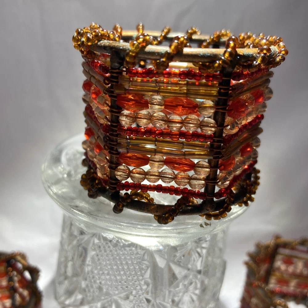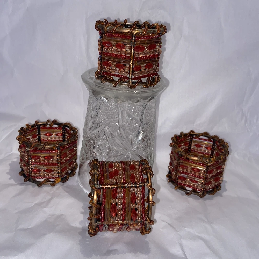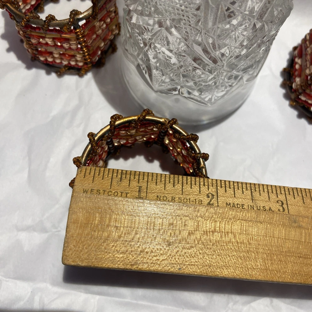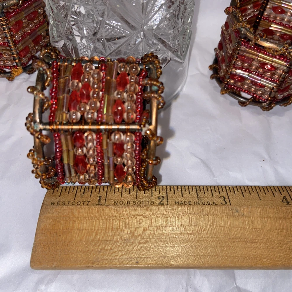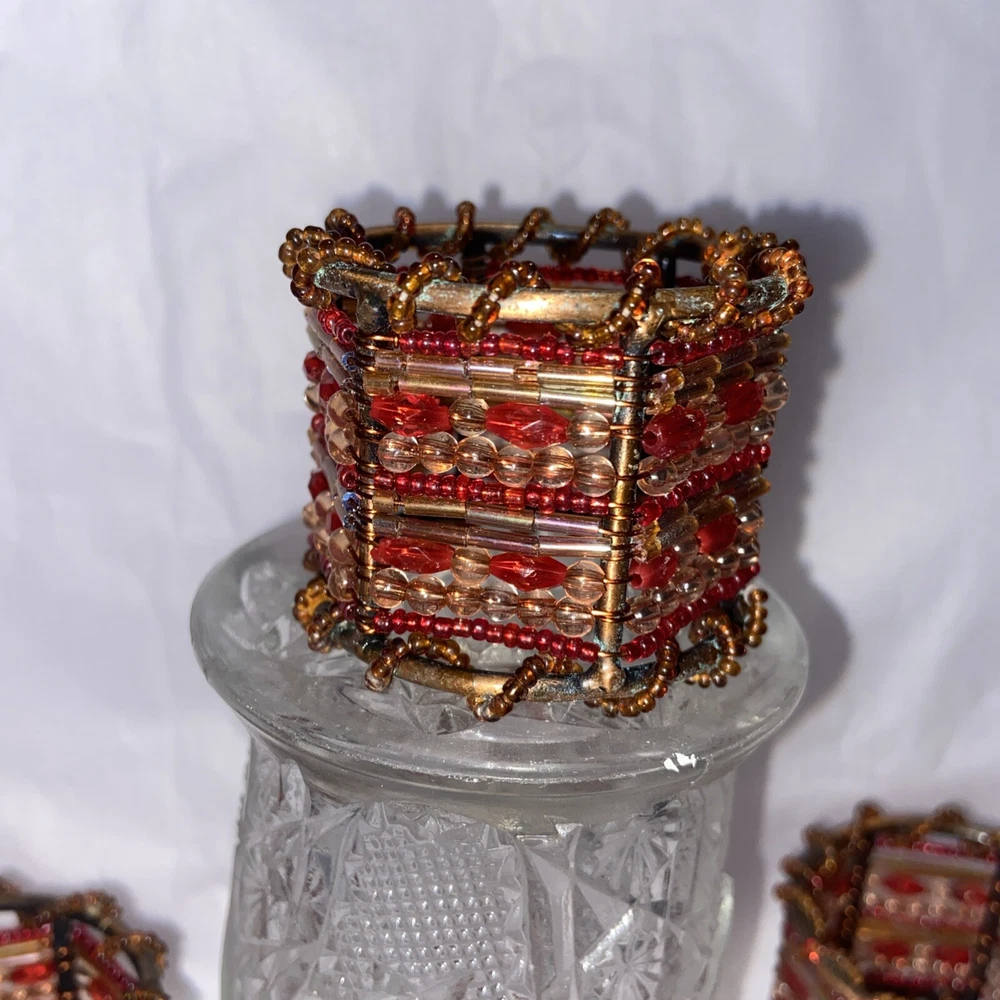 Moroccan Napkin Rings in red, gold, and brown tones, featuring a Bohemian fashion / theme. This set of 4 beaded napkin rings from Pier 1 is ideal for Christmas or multipurpose use, adding a festive touch to your table decor. Perfect as a host gift or for parties.