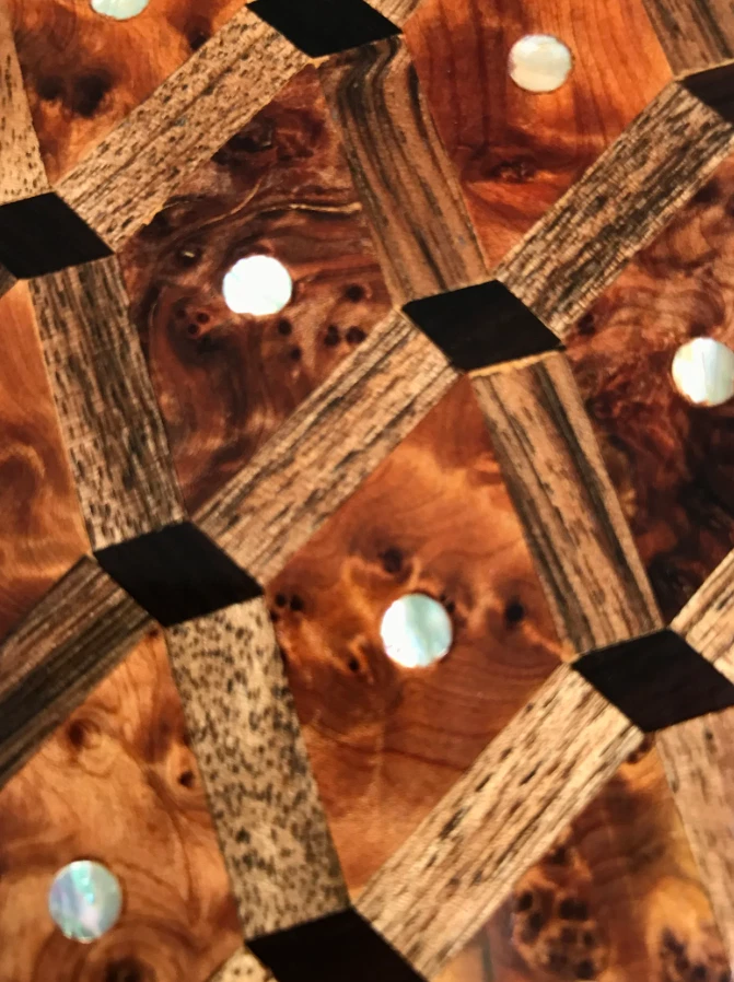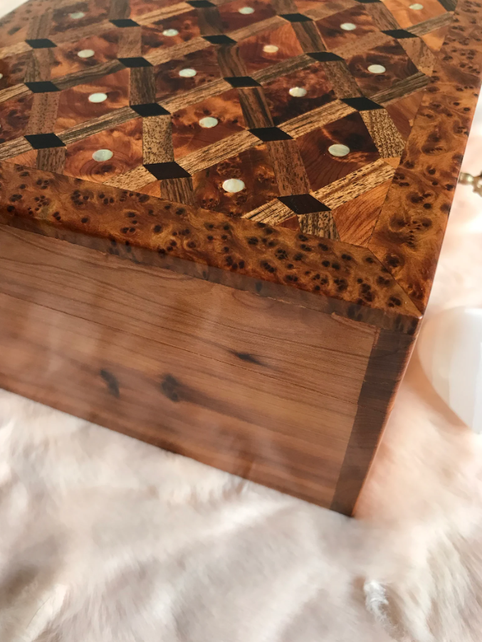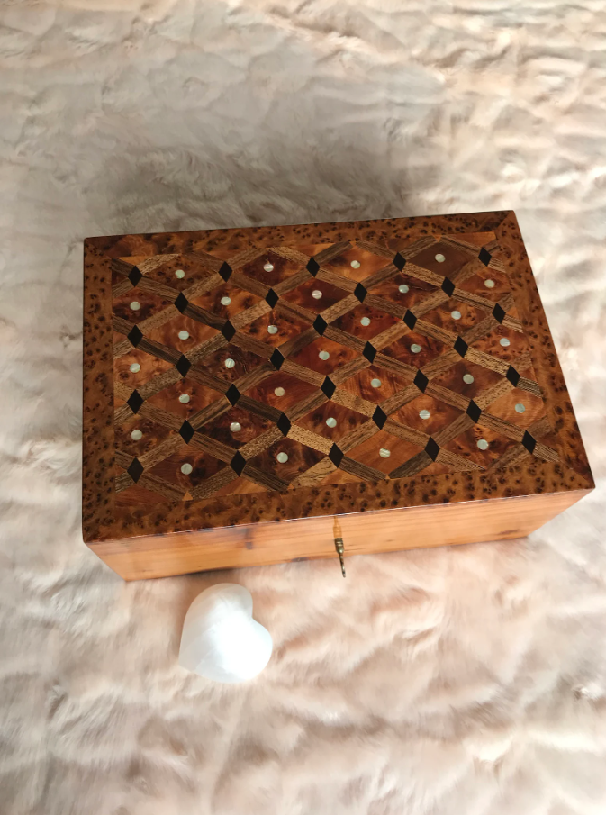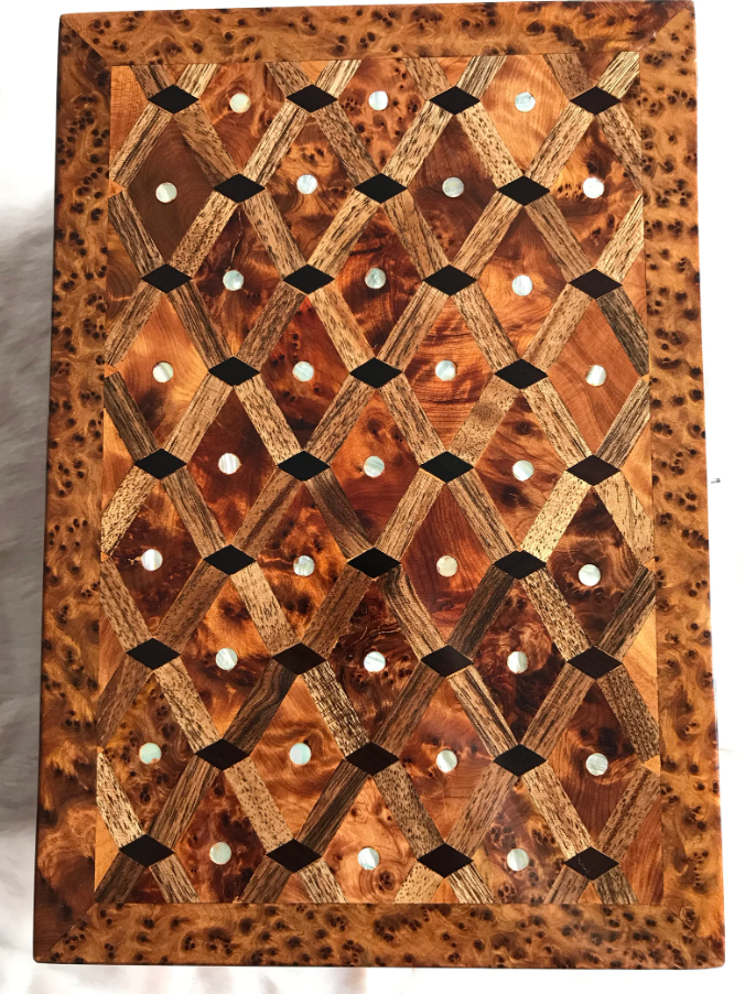 Moroccan Thuya wood jewelry box with mother of pearl and walnut wood inlay