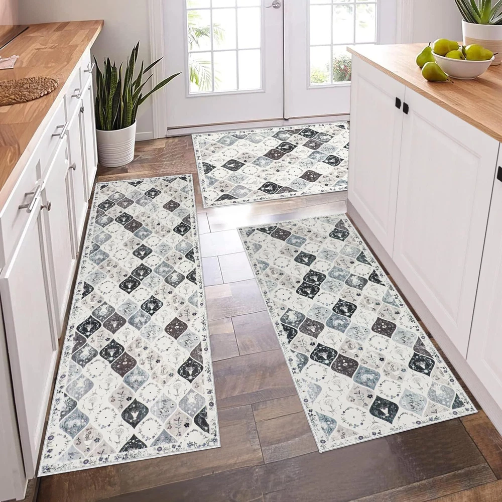 Kitchen Rugs Sets 3 Piece with Runner: This vintage moroccan trellis kitchen rugs set includs 3 pieces,the size is 20"x32"+20"x47"+20"x59", Which is perfect for your kitchen, laundry room decor. This no slip kitchen mat rug set with runner will be very comfortable to stand on when you are cooking or baking or working. Non-slip Washable Kitchen Rugs Set: The floral kitchen floor mat set made of premium washed cashmere fabric material, TPR and Cotton Non-skid Backing, Which is very non slip and durable. Eye-catching design: This washable kitchen rug runner has a trendy fade style and floral pattern, the vintage elegant tones blend perfectly with different home designs, and the material of the surface is so soft and delicate, your feet will be very comfortable on it. Easy to clean and storage: This washable kitchen rug runner is very easy to clean, you can use hand-held vacumm to clean the dirt, for deeper clean, machine wash separately in cold water, using mild detergent. After machine cleaning,please hang it to dry or air dry. When you don't need to use it, just roll it up and put it in the utility room without taking up space. Versatile and Ideal for gift: The Farmhouse Kitchen Rugs Sets of 3 widely used for home decor, it can be used as kitchen rugs for floor, laundry room rug, indoor door mat, entryway rug, hallway runner rug, bathroom mats bedroom rug and etc. It is perfect as a gift for newlyweds or housewarming, as well as a birthday gift, holiday gift.