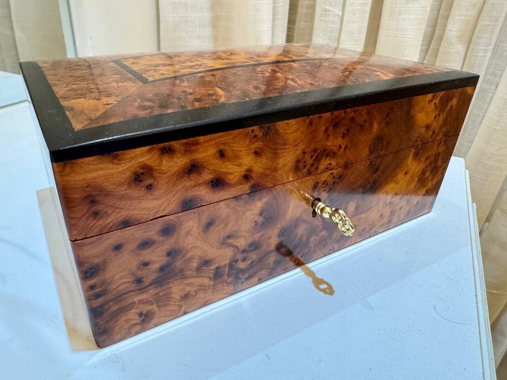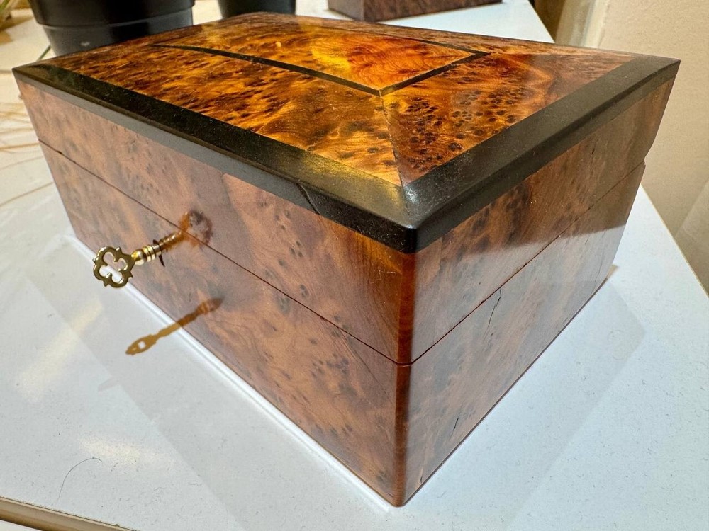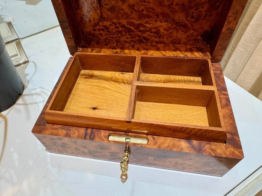AtlasMuse Handmade Thuya Wooden Box β Crafted with Love by Moroccan Artisans ThuyaCrafts proudly presents its exquisite Thuya wooden box, meticulously handcrafted by skilled Moroccan artisans. Ideal for storing jewelry, cherished belongings, and important documents, this box combines functionality with timeless elegance. π‘ Quality Assured: Each box is crafted using the finest Thuya root burl wood, with careful moisture management to prevent deformation over time. β¨ Key Features: Three separated compartments inside, with spacious storage underneath (Two Storage Levels). Secure lockable design with a brass key. Customization available: engrave/print text on the lid, leather, or velvet interior lining. π Dimensions: Length: 20 cm / 7.9 inches Width: 13.5 cm / 5.3 inches Height: 8 cm / 3.1 inches π Shipping Details: Your order will be shipped within 1 day of purchase, with express shipping delivering in 3-5 business days. Experience the elegance and craftsmanship of AtlasMuse!