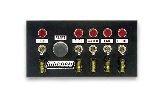 Moroso 74131 Drag Racing Switch Panel Drag Race Switch Panel, 4" x 7.75". Includes: Starter button, five on/off switches, five E-Z access fuse holders, five power indicator lights, 20 amp fuses Make custom wiring of your vehicle much easier and professional Face constructed of rugged .050" thick aluminum All have power indicator lights and front mounted, E-Z access fuse holders with pigtails attached, features not found on other manufacturer's switch panels Heavy-duty on/off switches are 12 volt single-pole, single-throw with screw terminals rated at 25 amps lamp load and 35 amps inductive load Heavy-duty fingertip starter controls are waterproof and dust-proof, and include screw terminals rated at 12 volts and 35 amps A selection of custom labels is included so you can customize each panel to your individual needs Black anodized finish prevents corrosion