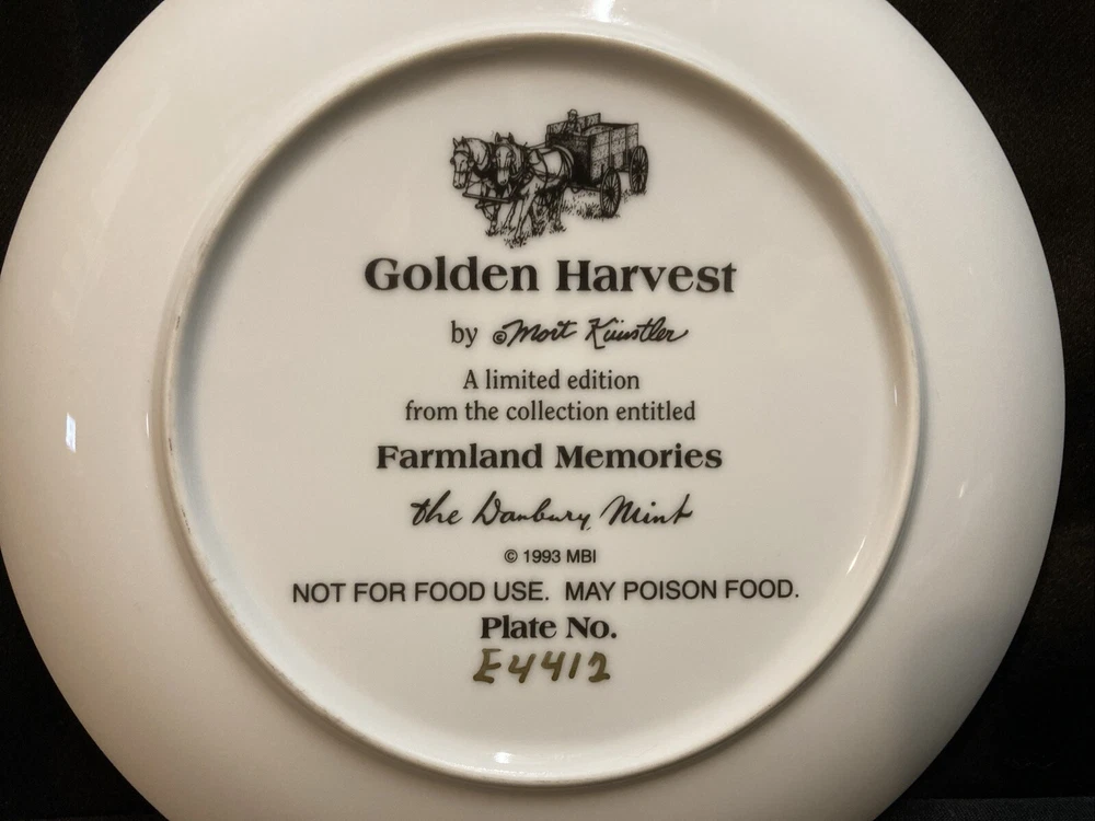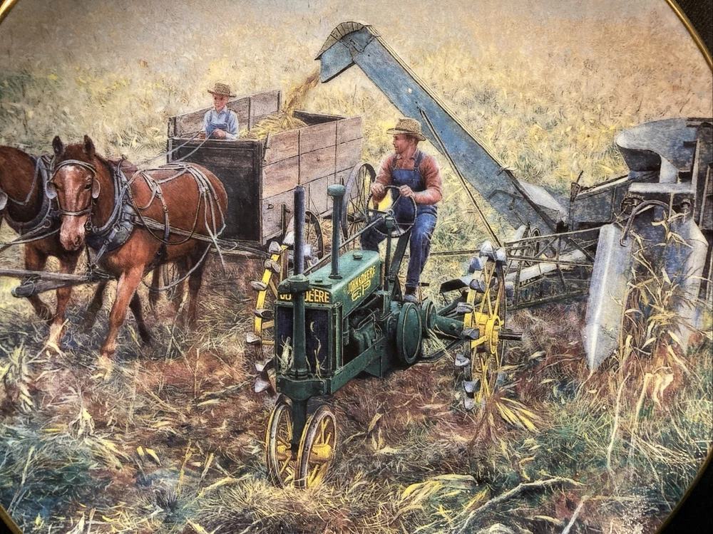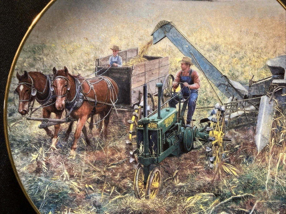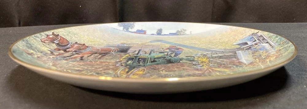 This 8” round collector plate titled "Golden Harvest" by Mort Kunstler captures a nostalgic scene of farming with a John Deere tractor and horses. The plate is pre-owned and comes in good, clean condition with no chips, cracks, or breaks. Please see pictures for details. If you have any questions or concerns, please do not hesitate to contact us. Check out our other items and message us if interested in more than one listing as combining items could save you money on shipping.