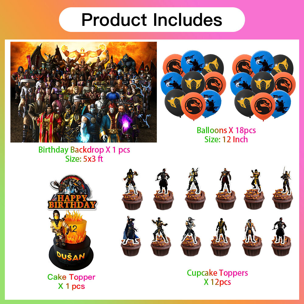 About this item 【Themed Sets of Matching Units】: ☰ Take this good favor for themed party to impress your kids and their friends. ☰ Enrich your kids’childhood dream well,giving them a fantastic surprise. 【Party Decor Is So Easy】 ☰ It contains all of your Mortal Kombat birthday party tableware needs and is completely disposable. ☰ You can save more time to enjoy this party with your guests. 【Real Savings For You】 ☰ The shiny large backdrop decor will attract you eyes and make everyone laugh.The banner cloth is printed in high definition, making it the perfect party background wall. It is made of thick cloth, not paper. ☰ You will save over 70% compared to buying 2 Mortal Kombat party supplies separately. 【Super Value Mortal Kombat Package】: ✪ 1PCS X Large Happy Birthday Banner 5x3ft(150x100cm) ✪ 18PCS Balloons. ✪ 1PCS X Cake Topper. ✪ 12PCS X Cupcake Toppers. 【After Sale Service】: ☰ We try our best to bring the best use experience to our customers. ☰ If you are not satisfied with the purchase of this set or have any questions about the product,please contact us at any time.We will definitely solve the problem for you in the first time. ☰ We can also custom backdrop other size or pictures you want. Any questions please contact us.