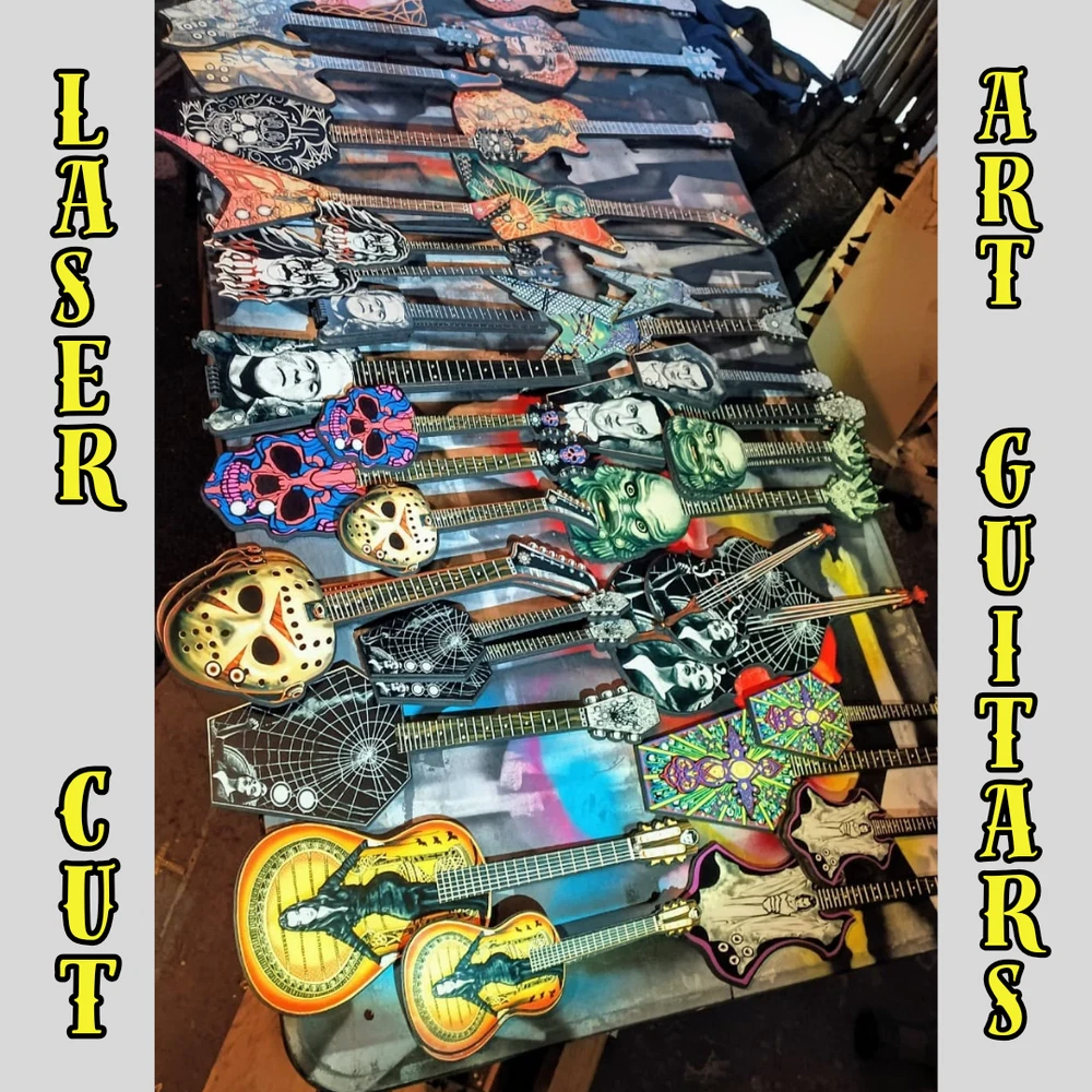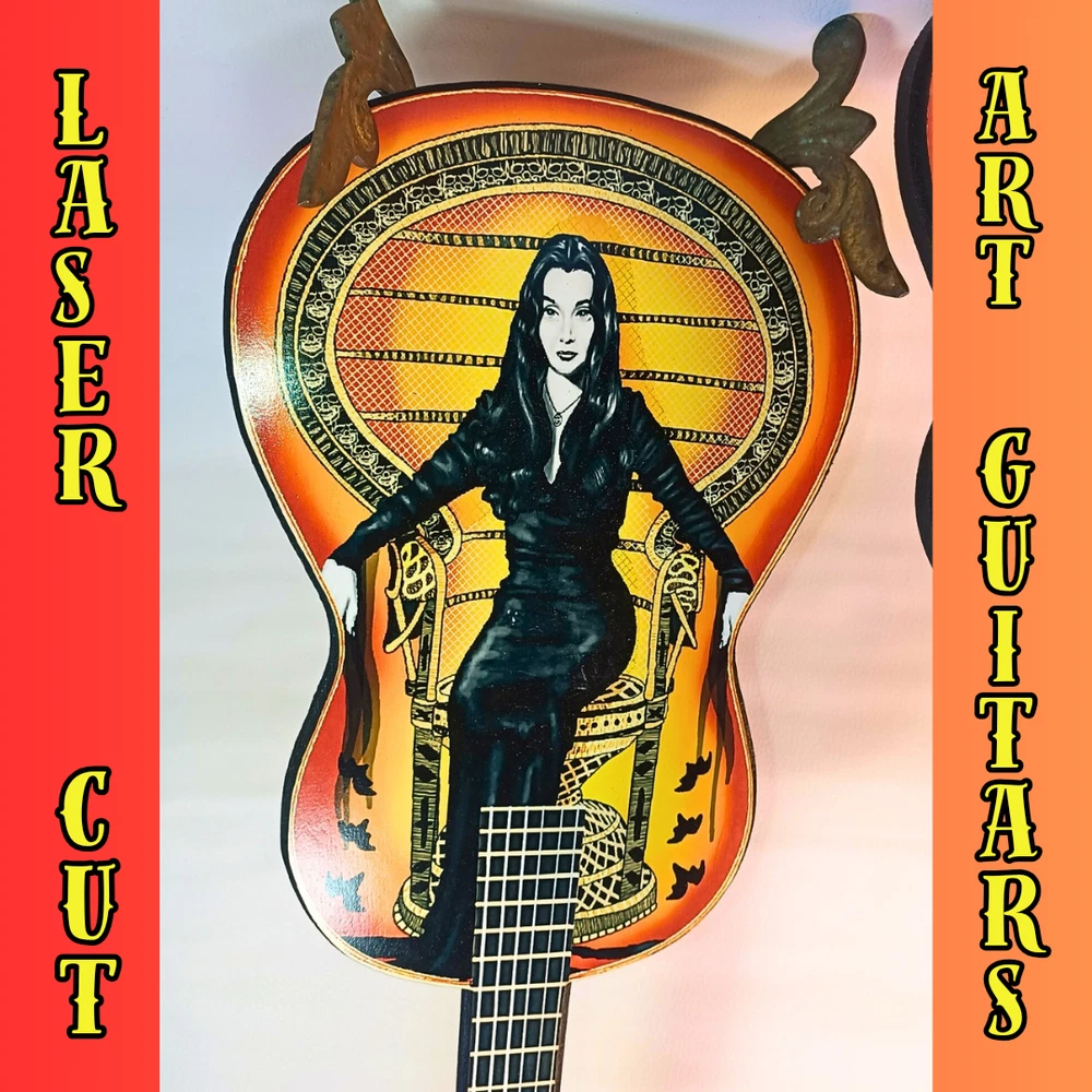 ***Treasure Suite offers you many pieces of my art prints now*** ###This section is for large sized laser cut art guitars,cellos,etc. Approximate measurements are 17"hx6"wx.25"d. ### This one is of the lovely and timeless Mortica Addams sitting in her wicker chair. Made illustration fit by flipping upside down. Like a bat. Notice Gomez' face on headstock. Welcome to my unique collection of digital art, where creativity meets craftsmanship! Each piece in this category features my original designs, heat pressed into vibrant sublimation prints on laser cut wood or polyester canvas material. These art pieces are not just decorations, they are collectibles that bring a touch of gothic, rock and roll, horror, pin-up, and lowbrow art into your space. Explore an array of striking designs on my mini guitars to other stringed instrument laser cut art pieces, available in 2 sizes and complete with custom laser cut foldable stands that I personally designed. These pieces are perfect for adding a distinctive edge to your home or office, and they make fantastic gifts for art enthusiasts and collectors alike. Looking for something truly one-of-a-kind? I may accept custom orders to bring your unique vision to life. Dive into a world of bold, expressive art that stands out and speaks to the rebel in all of us!