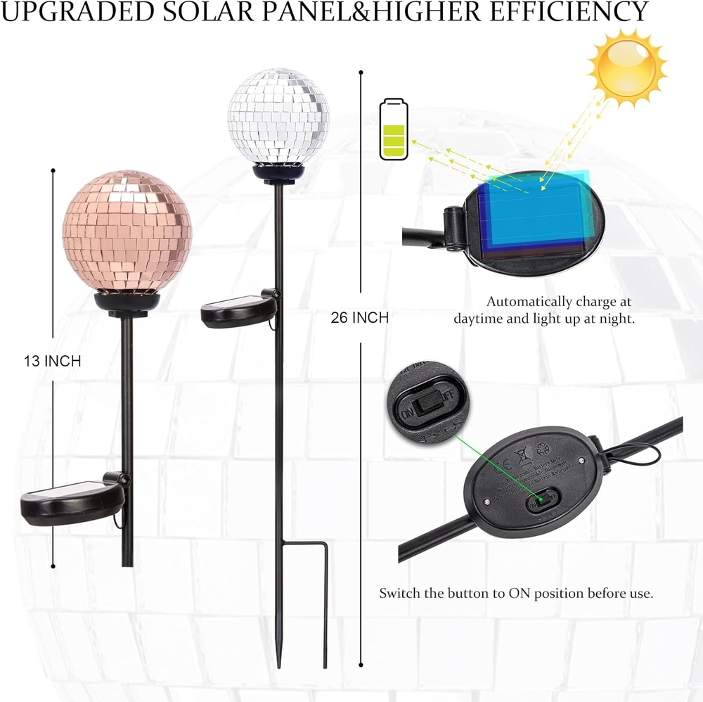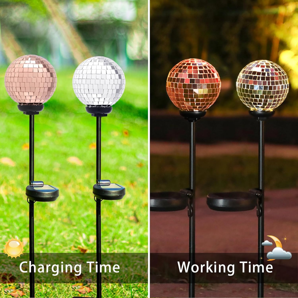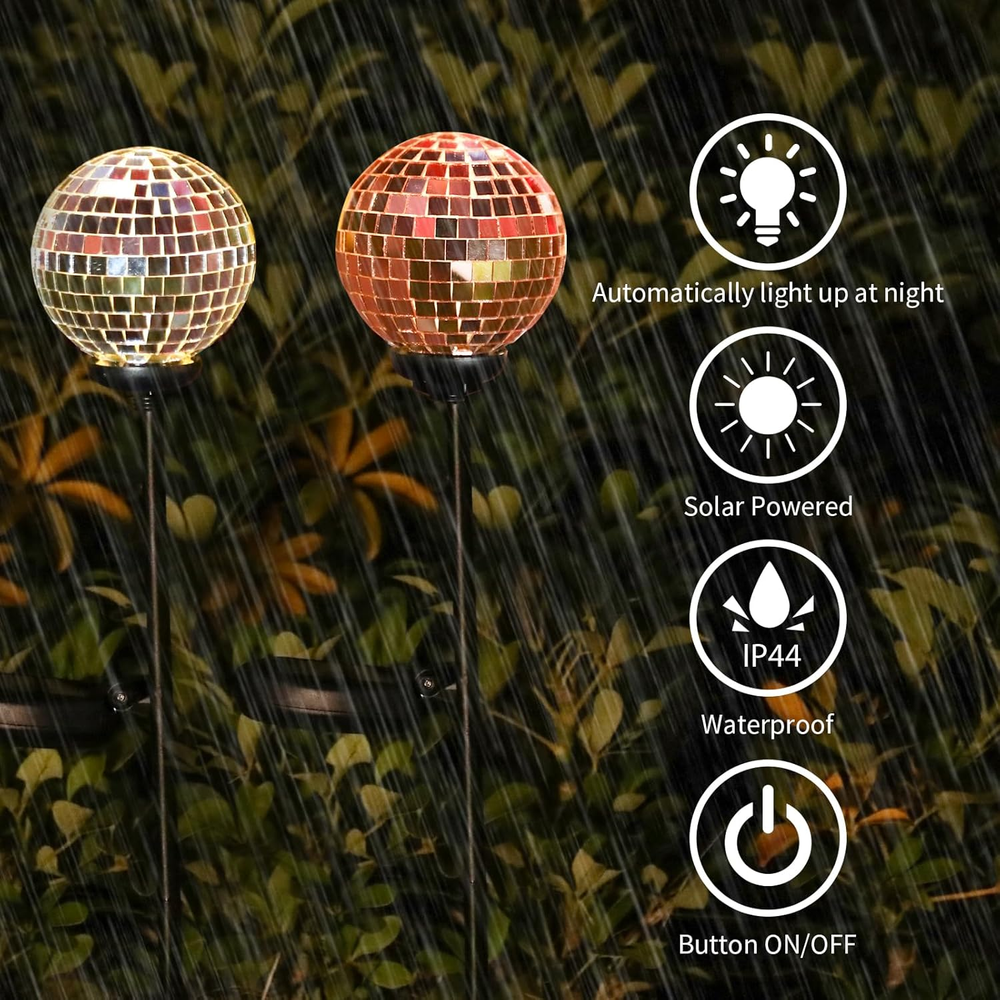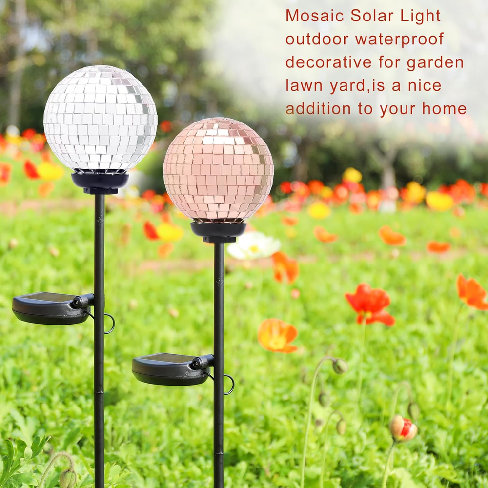Shade Color: Silver&Rose Gold Batteries Required?: Yes Brand: Does not apply Shape: sphere Water Resistance Level: Waterproof Efficiency: Energy Efficient Is Cordless?: Yes Connectivity Technology: USB Control Method: Touch Installation Type: Ground Indoor/Outdoor Usage: Outdoor Light Source Type: LED Base Material: Metal Style: Art Deco Room Type: Garden Material: Glass Item Weight: 2 Pounds Number of Pieces: 2 Product Dimensions: 3"D x 3"W x 26"H Special Feature: Energy Efficient Mounting Type: Floor Mount Specific Uses For Product: Garden Bulb Shape Size: B11 gtin13: 313116922938 Shade Material: Metal, Glass Included Components: solar panel, stake, mosaic glass globe Is Waterproof: true Power Source: Solar Powered Color: Silver&Rose Gold Recommended Uses For Product: Decoration Type: Does not apply Batteries Included?: Yes UPC: 313116922938 Special Features: Energy Efficient Number of Light Sources: 2 Lighting Method: Solar-powered LED