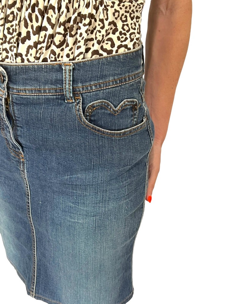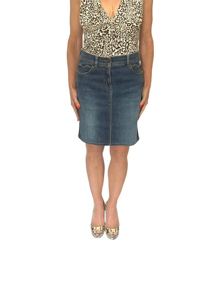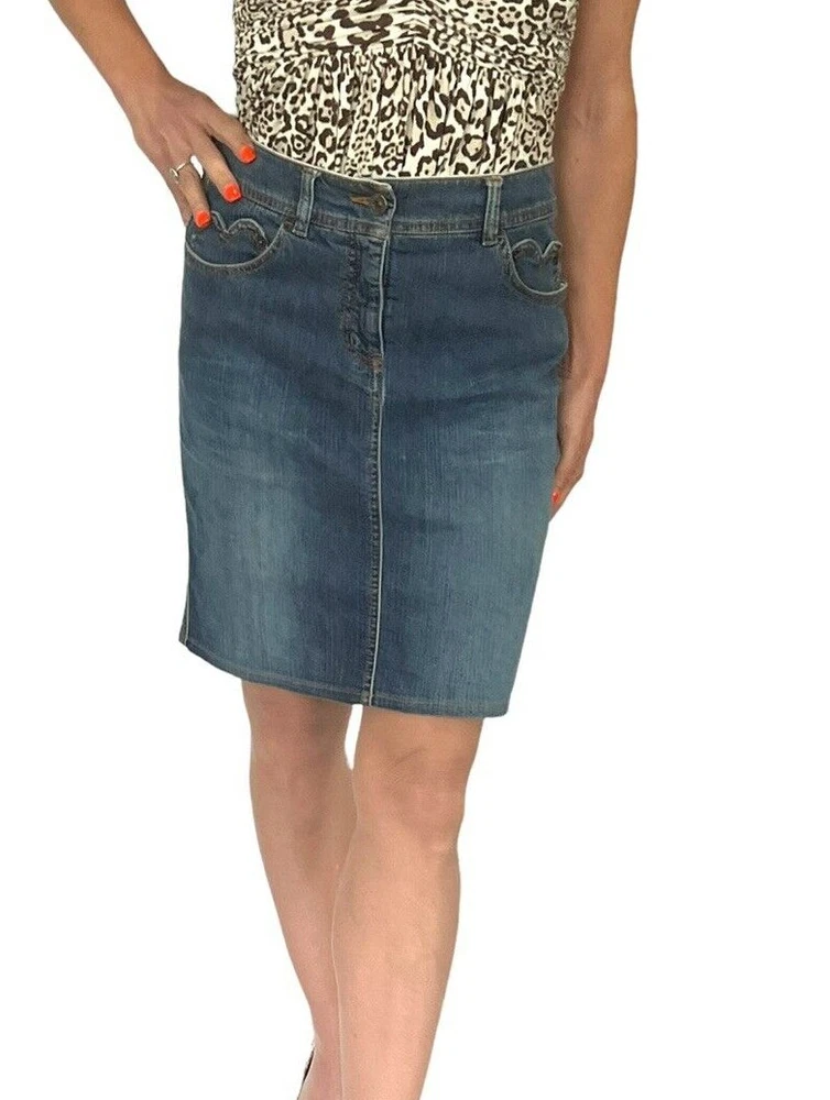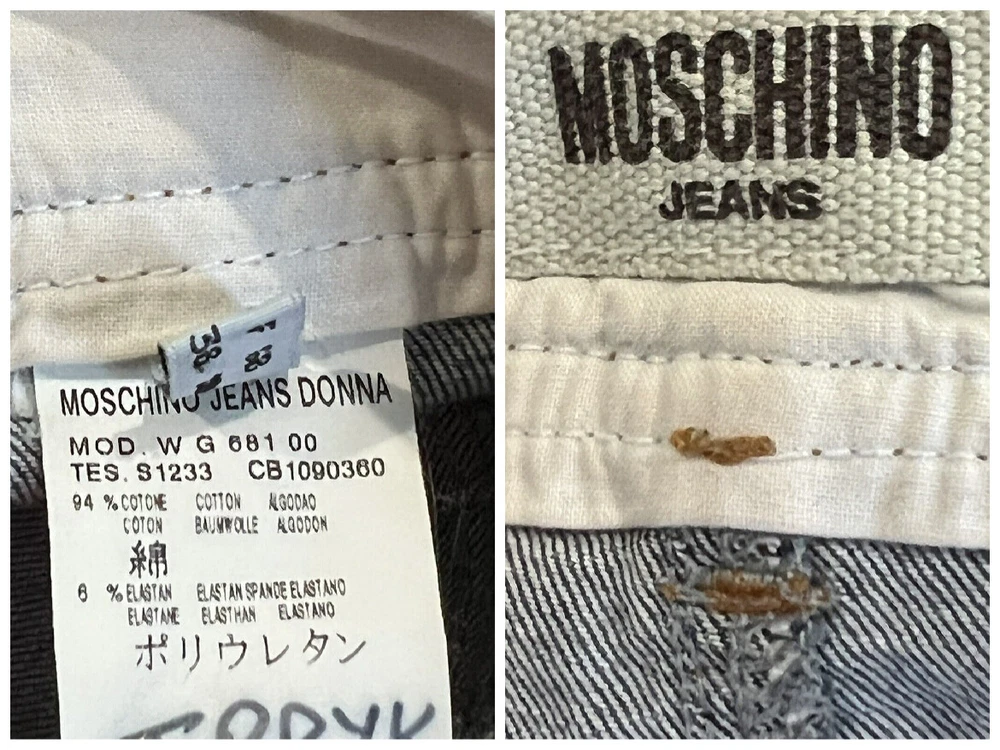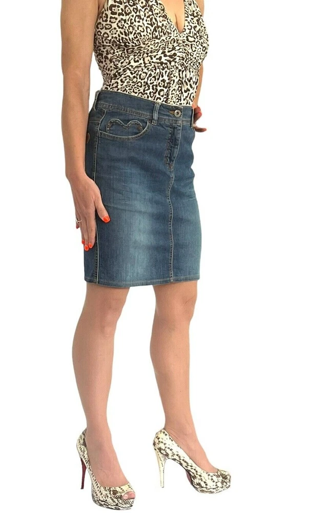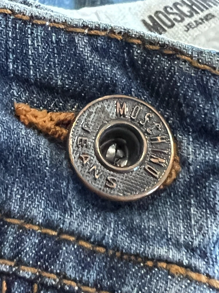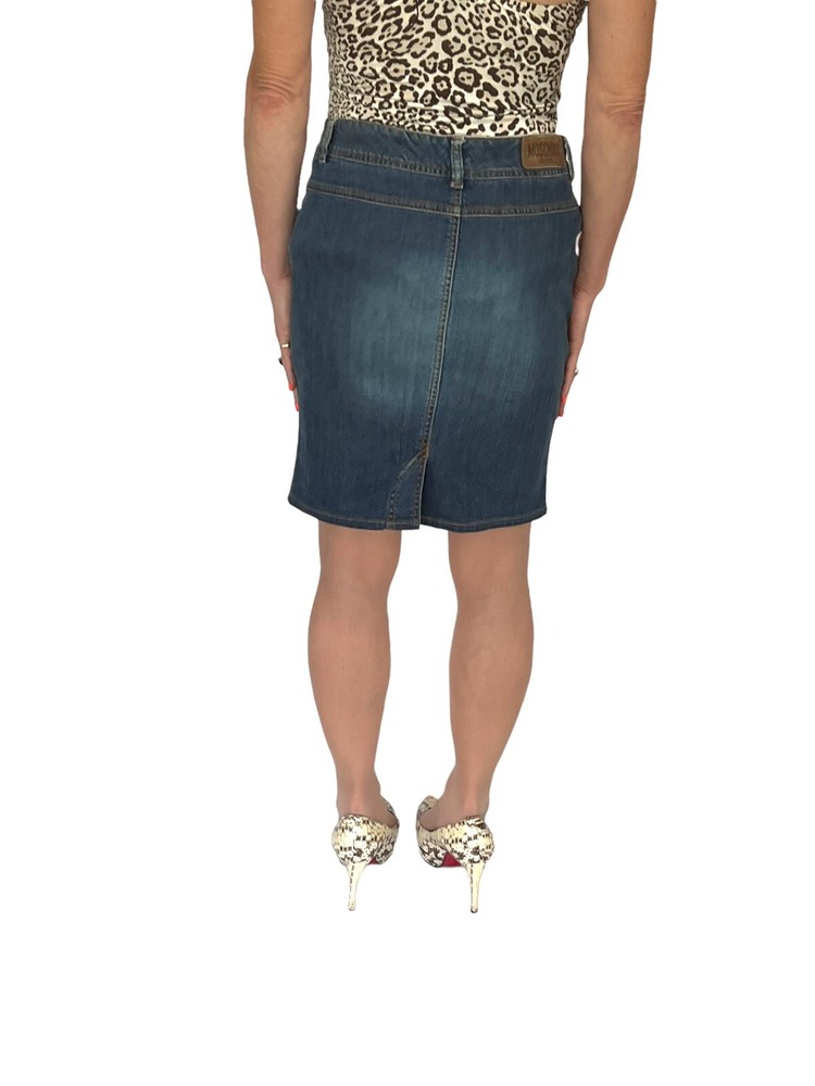 BRAND: MOSCHINO JEANS COLOR: MEDIUM BLUE DENIM MATERIAL: COTTON/ELASTINE-HAS A NICE STRETCH TO IT! DETAILS: AWESOME DENIM JEAN MINI SKIRT-HEART SHAPED POCKETS-LOGO PATCH IN THE BACK-ENGRAVED LOGO BUTTONS-BACK SLIT-HAS A DISTRESSED VINTAGE VIBE OOH LA LA TRES CHIC!! SIZE-TAG SAYS 8-RUNS SMALL-MORE LIKE A 6 SEE MEASUREMENTS LENGTH-18 WAIST-29 HIPS-35 CONDITION: GENTLY WORN-THERE IS SOMEONE'S NAME INSIDE I send out with a tracking number and you will get your items super fast. I have a smoke free home. Please feel free to ask me any questions and Thank you for looking! Payment is due within 3 days of end of auction. I ship within the United States only. NO RETURNS AS THIS IS A CONSIGNED ITEM.