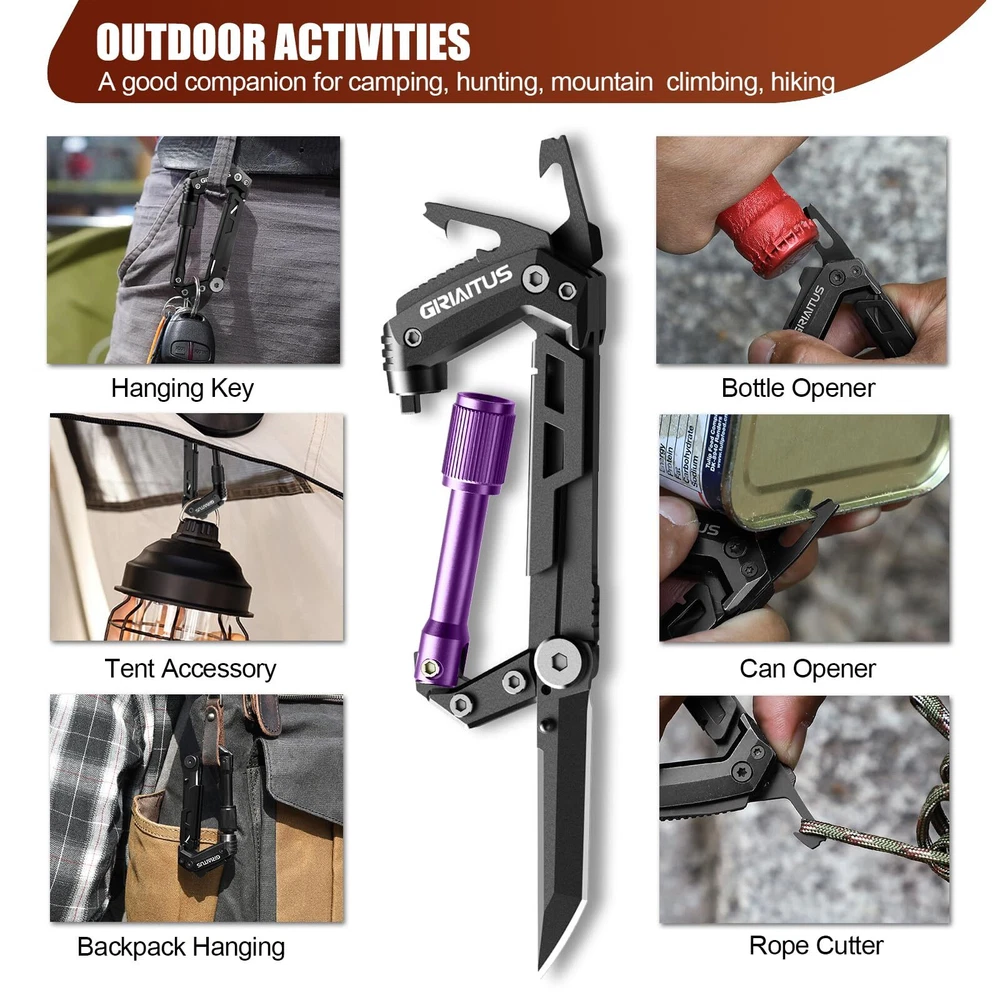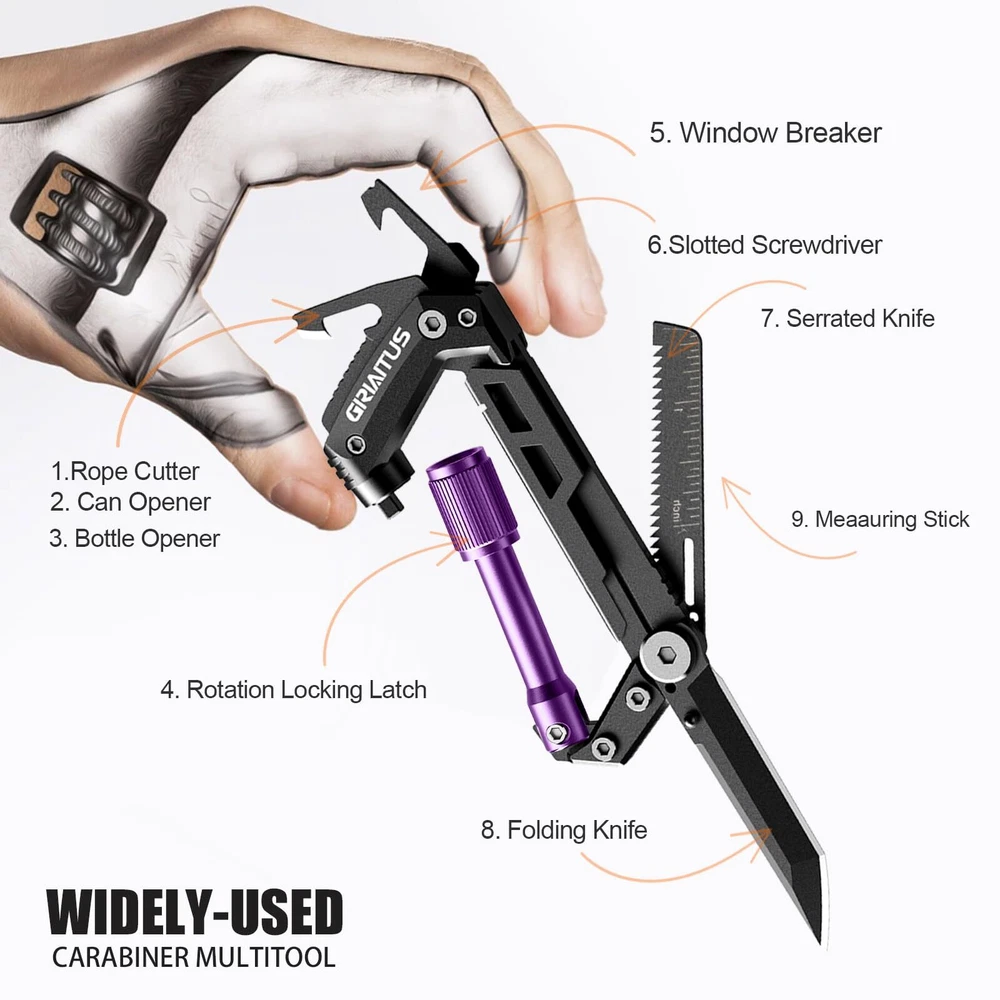 Multifunctional Design: Our Purple multi tool carabiner is not just for hanging keys or bags. It's a versatile tool featuring a pocket knife, serrated knife, rope cutter, slotted screwdriver, bottle opener, can opener, and a ruler. Strong Locking Carabiner Tool: Our climbing carabiner knife combines strength materials, this multitool is making it perfect for outdoor adventures, camping, hiking, and more. Portable and Compact: Despite its multiple features, our multitool carabiner is compact and lightweight, making it easy to carry in your pocket, backpack, or survival kit. Perfect for Outdoor Enthusiasts: Whether you're an avid camper, a hiker, or just someone who loves exploring the outdoors, this multitool is a must-have accessory that will come in handy in many situations. Everyday Use: Beyond outdoor daily use, this multitool is also perfect for everyday use. Use it to open packages, bottles, or cans, fix small items, measure things with the ruler, and more.
