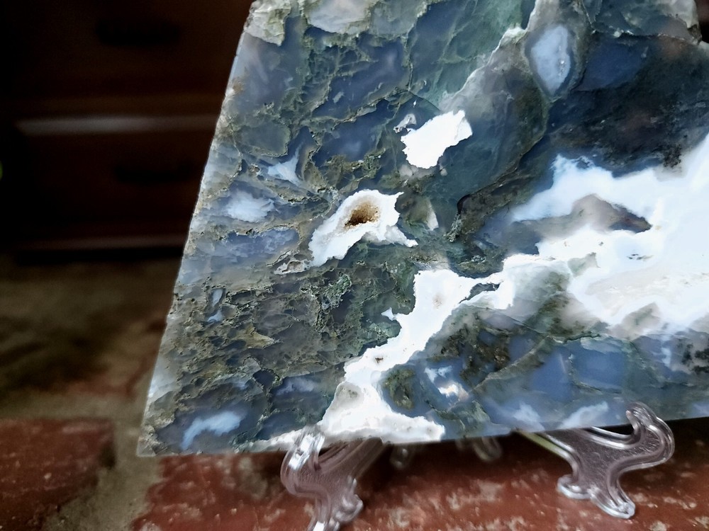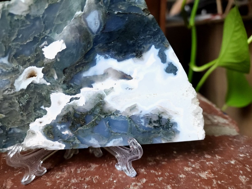 Moss Agate Crystal Slab Slice 8.8 oz 5.2 inches/ 3.3 inches Includes 1 clear display stand