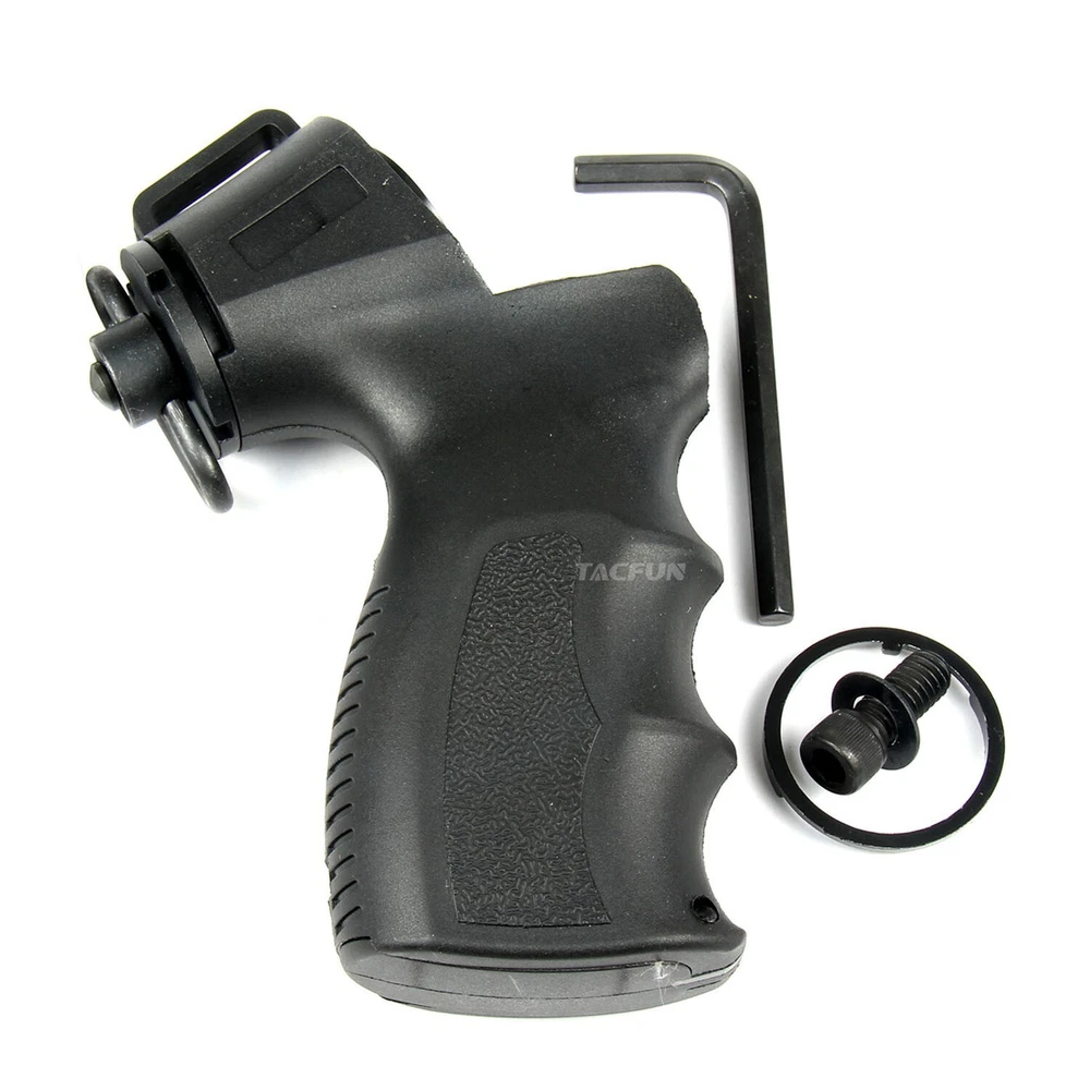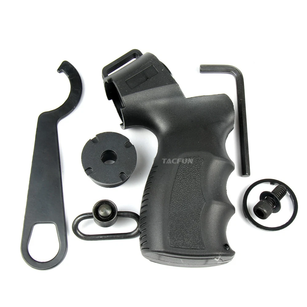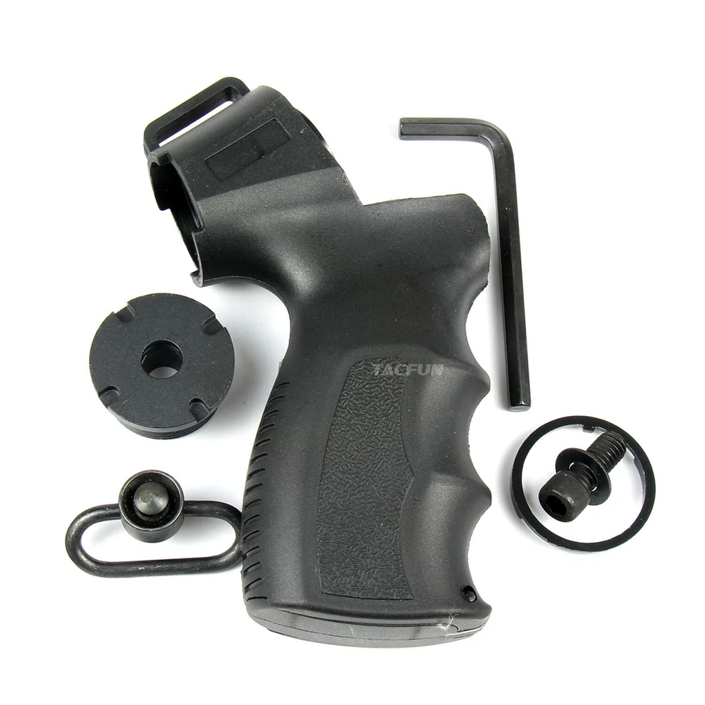 GRIP Description: Fit Mossberg 500 590 535 835 Maverick 88 12 & 20 Gauge Comfortable One Piece Design. Injection Molded Of Superior Glass Filled Nylon For Supreme Strength & Durability - Black Color All Assembly Hardware Included Easy To Install, No Gunsmithing Required Storage compartment inside pistol grip Made of high strength polymer CAP Description: High quality aircraft grade aluminum end cap screws into the Mossberg 500/535/590/Maverick 88 12 & 20 ga or Others 1 3/16"-16 TPI pistol grip that has the opening in the back to mount an optional adjustable stock. Want to run your shotgun with a more tactical and compact look Simply screw the end cap into the pistol grip and you are good to go. The sling swivel detaches with the simple push of a button, and allows you to attach a variety of tactical slings. Aircraft Grade T-6061 aluminum Black anodized finish Sling swivel: Detachable push button sling swivel