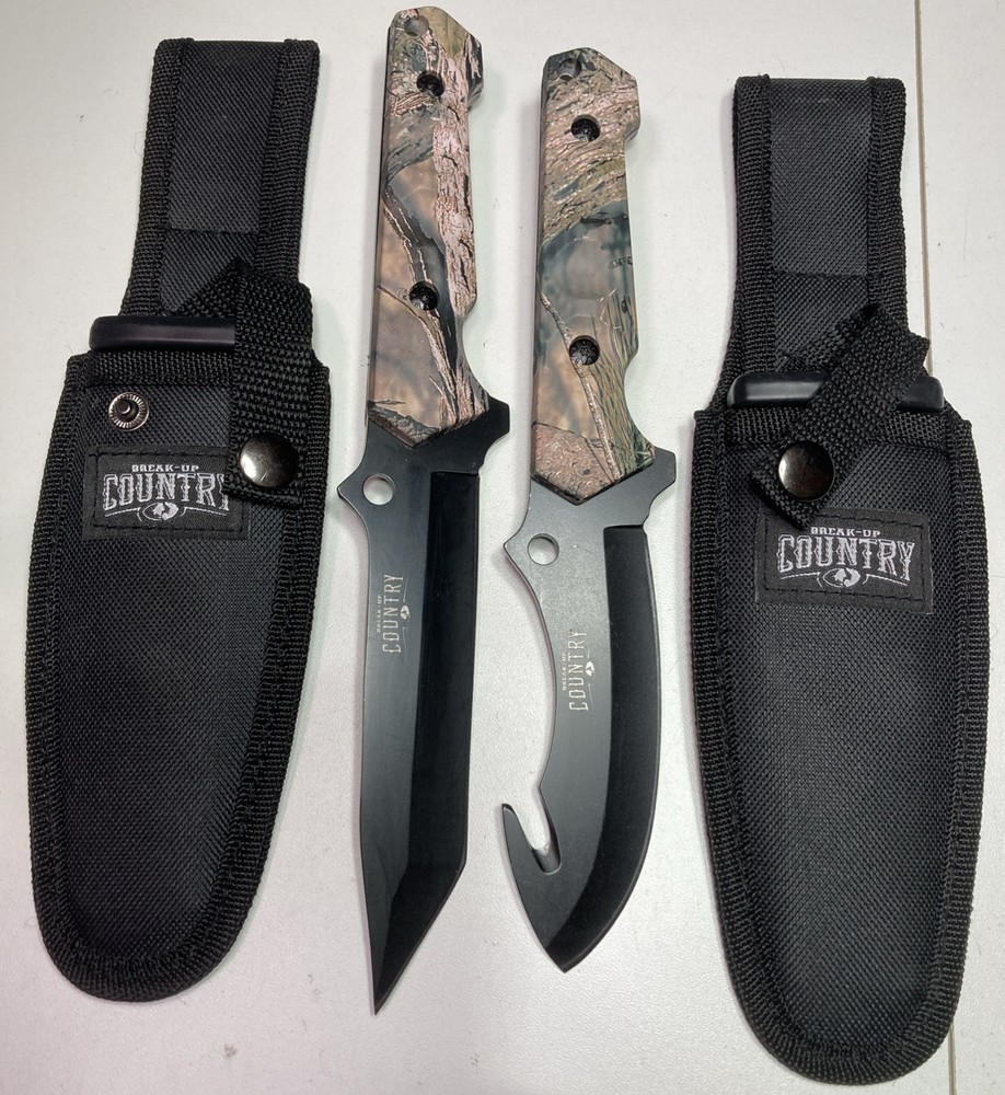 This 2 piece hunting knife set from Mossy Oak-Backup country features fixed blade knives made from durable stainless steel with a black tanto blade type. The full tang construction provides added durability and balance. These knives are perfect for any hunting trip or outdoor adventure. The set includes two knives, each with a unique design that showcases the Mossy Oak camo pattern. The brand is known for its high-quality outdoor products, making these knives a reliable addition to any collection.