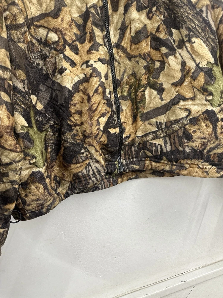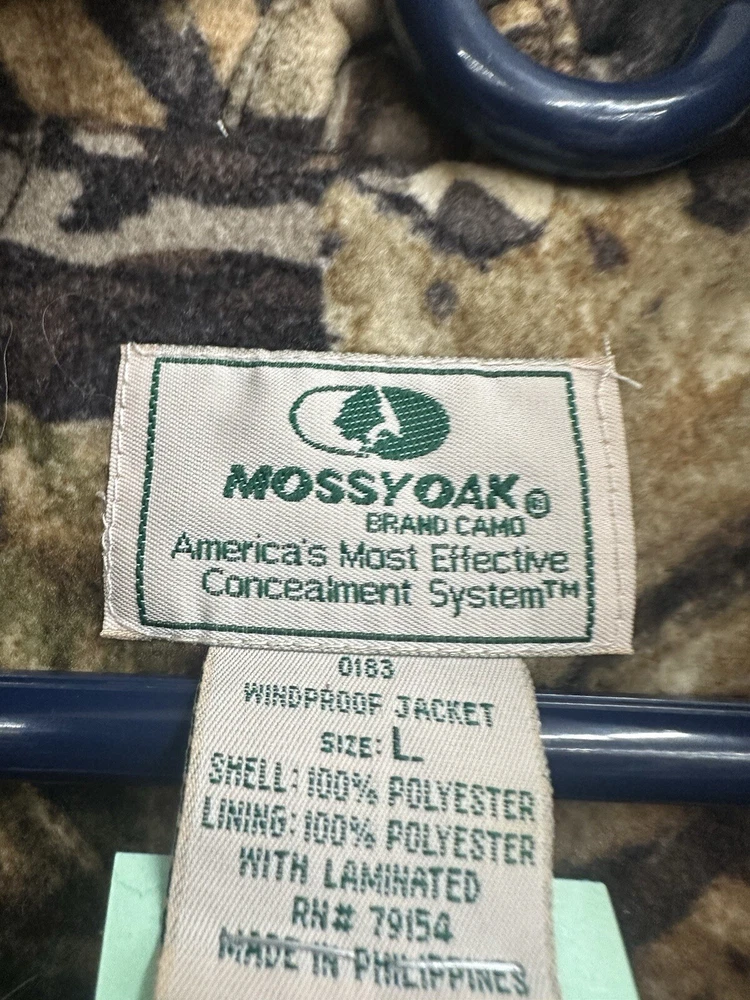 Mossy oak men’s Windproof camo jacket outdoor hunting Size large men’s 100 % polyester great quality materials Made in phillipines Outdoor sports activities related Perfect for hunting , turkey hunting , deer hunting , fishing , beach , work etc Condition is used but in great condition Vintage older mossy oak better material Shipped usps mail with tracking confirmation Thanks for viewing and have a great rest of your day