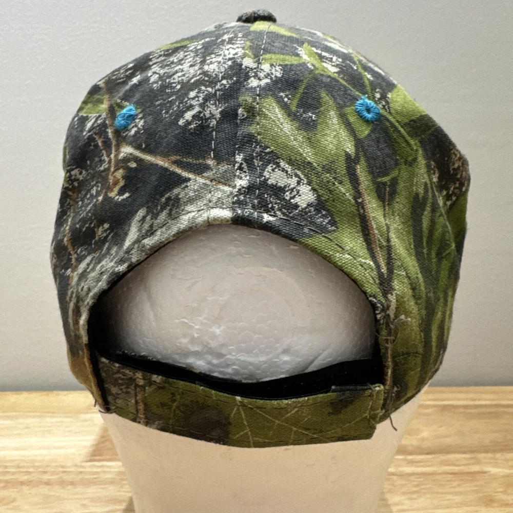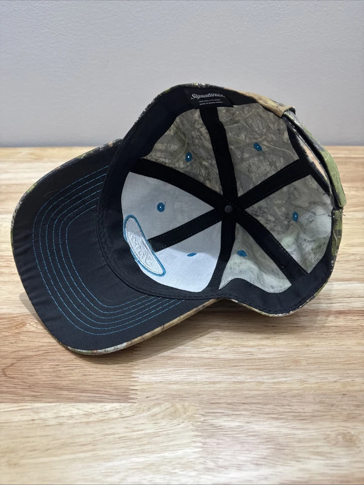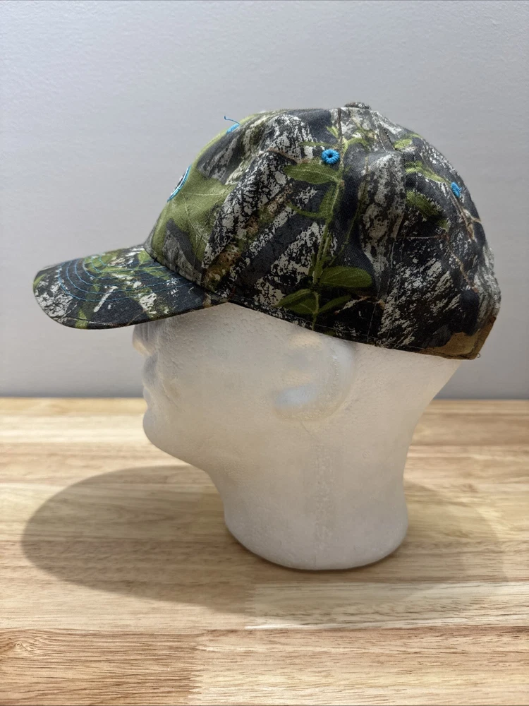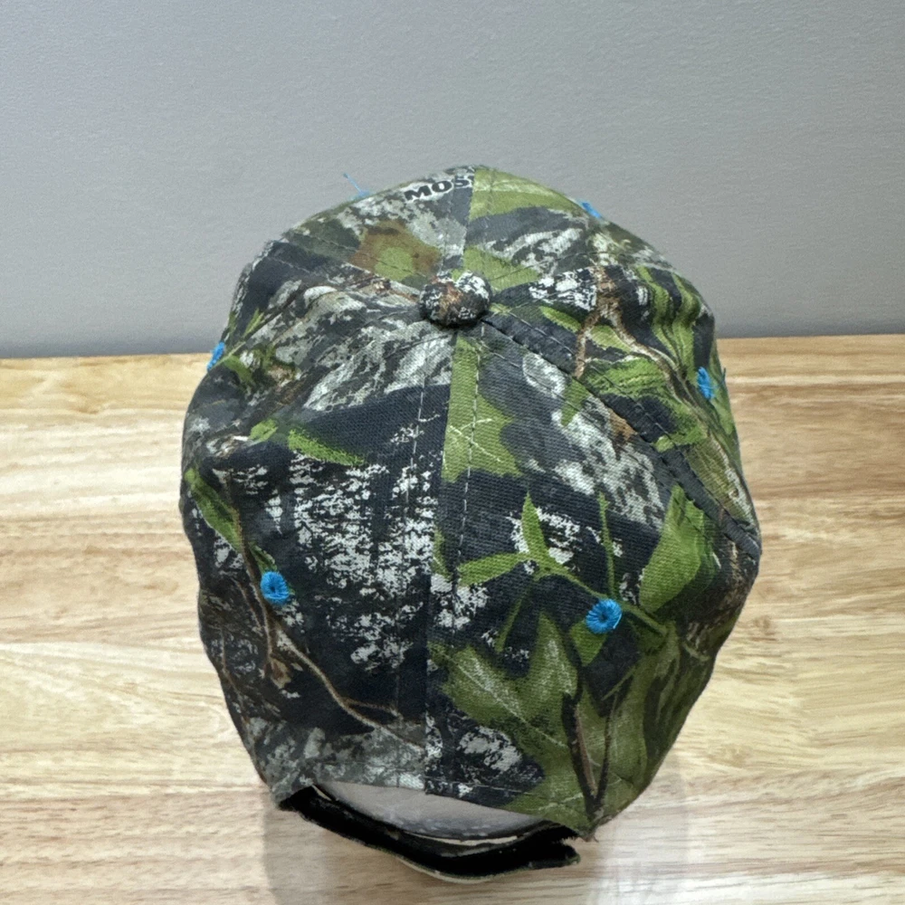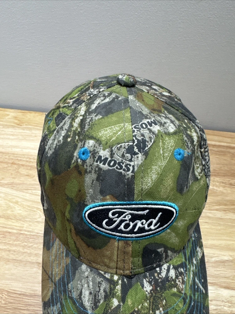 Mossy Oak Camouflage SnapBack Hat With Embroidered Ford Logo One Size Fits Most. Hook and loop closure. Light blue thread accents on the logo, the bill and the ventilation holes. Clean and in great condition.