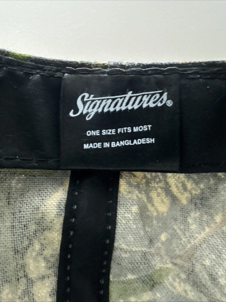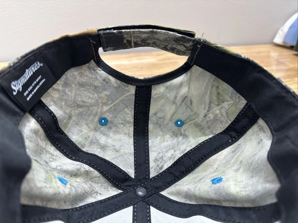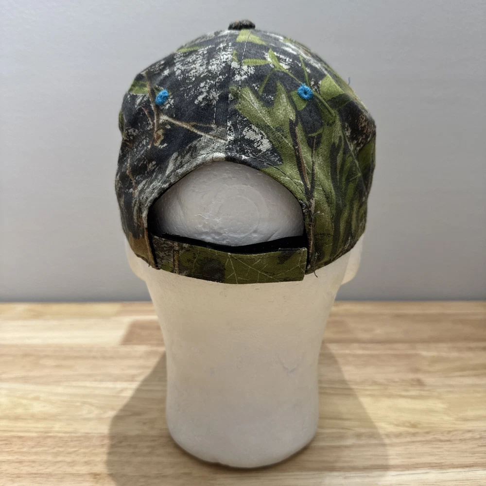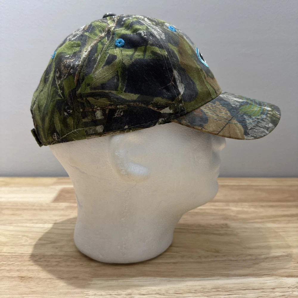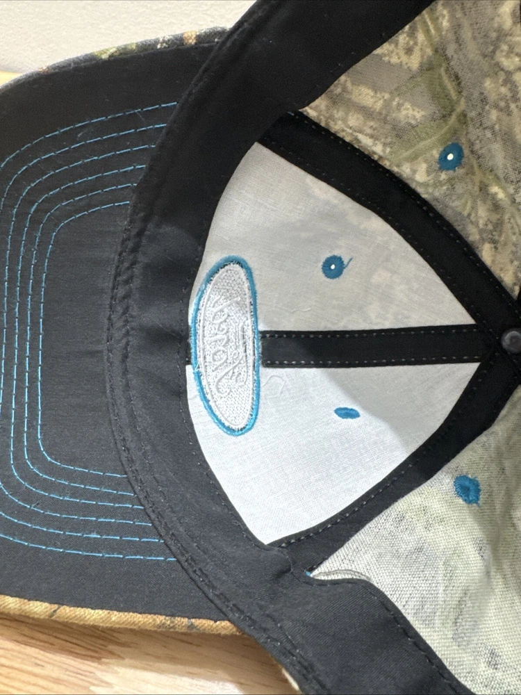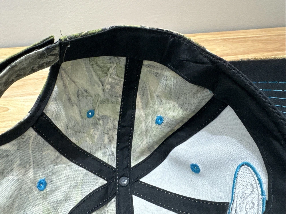 Mossy Oak Camouflage SnapBack Hat With Embroidered Ford Logo One Size Fits Most. Hook and loop closure. Light blue thread accents on the logo, the bill and the ventilation holes. Clean and in great condition.