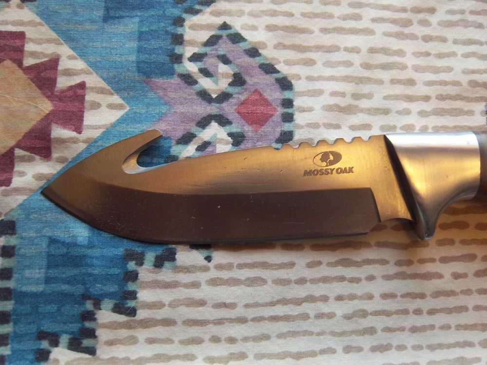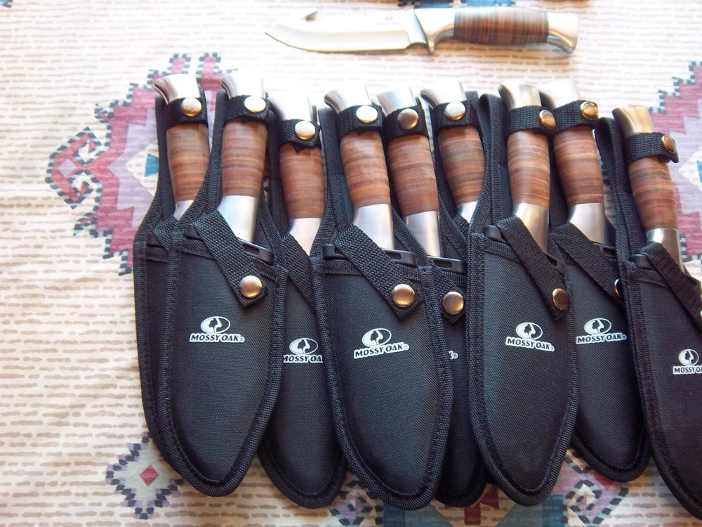 10 new Mossy Oak gut hook knives, 5 " blade, overall length 10 ", leather handle.You get all 10 knives shown in pictures. Shipping cost is $15.00