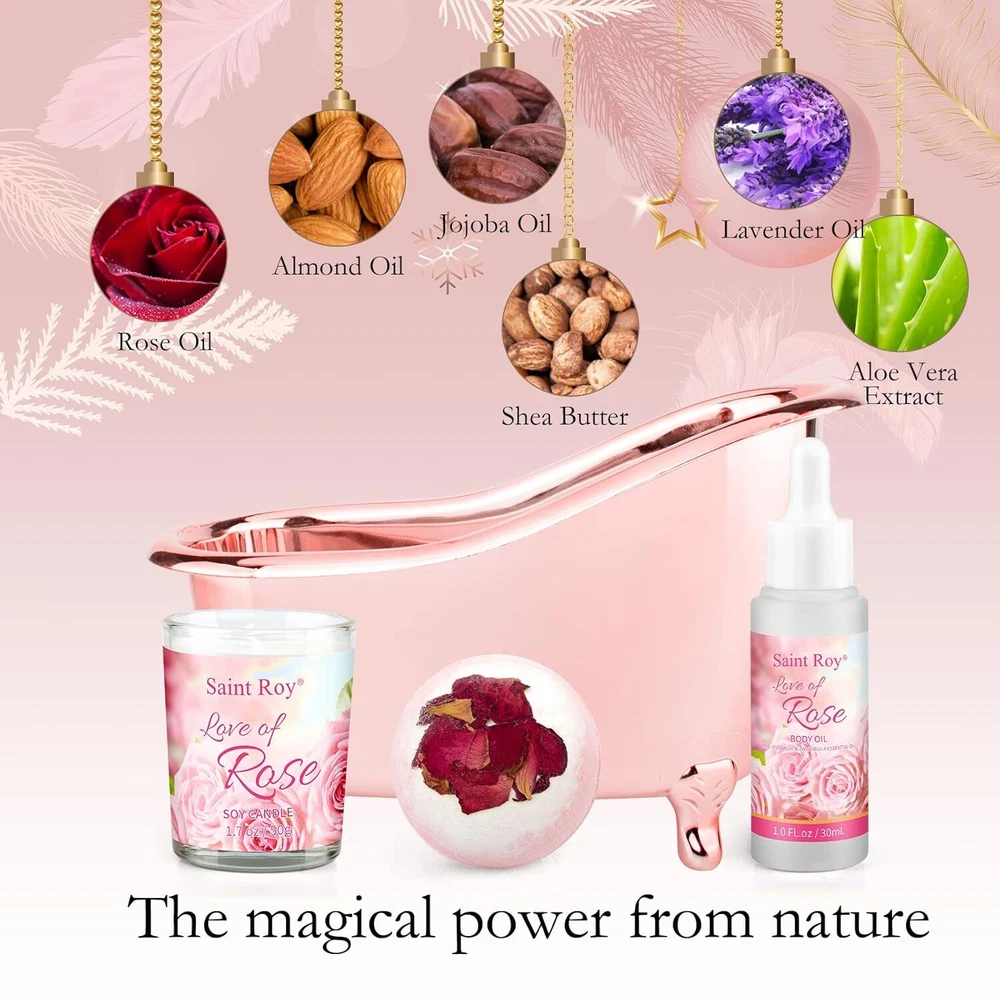 Rose Scent Spa Gift Basket Scent, 9pcs. 9pcs Bath Set for Women Gift: This relaxing women gifts includes: Shower Gel, Shampoo, Body Lotion, Spa Soy Candle, Bath Salt, Jojoba Body Oil, Bath Puff and Dried Flower's Bath Bomb, Bath Puff arranged in a reusable bath tub for attractive storage and display. Bath tub spa kit helps you at home spa Charming Rose Scent: 100% natural Organics Rose Essential Oil & Jojoba Oil can help moisturize and soothe the skin. When used with fresh aroma of Rose, its special and clean fragrance will be sure to give you the much needed relaxation you've been yearning for! Clean and Moisturize: We use safe, natural ingredients like Rose Oil and Jojoba Seed Oil for our spa gift basket. We add moisturizing Shea Butter and nourishing to help make your skin feel smooth and silky Perfect Gifts for Women on All Occasions: Our elegant packaging alone is enough to create an impression on Christmas, Birthdays, Holidays, Mother’s Day, Weddings, Anniversaries & All sorts of occasions. Bring a smile to your Girlfriend, Wife, Mother, Daughter or Beloved Ones Elegant Spa Set for Her: Our Bathtub Bath Set will be the perfect gift for holiday, birthday, anniversary,Halloween, Thanksgiving Day,Christmas, for your lover, friend or yourself