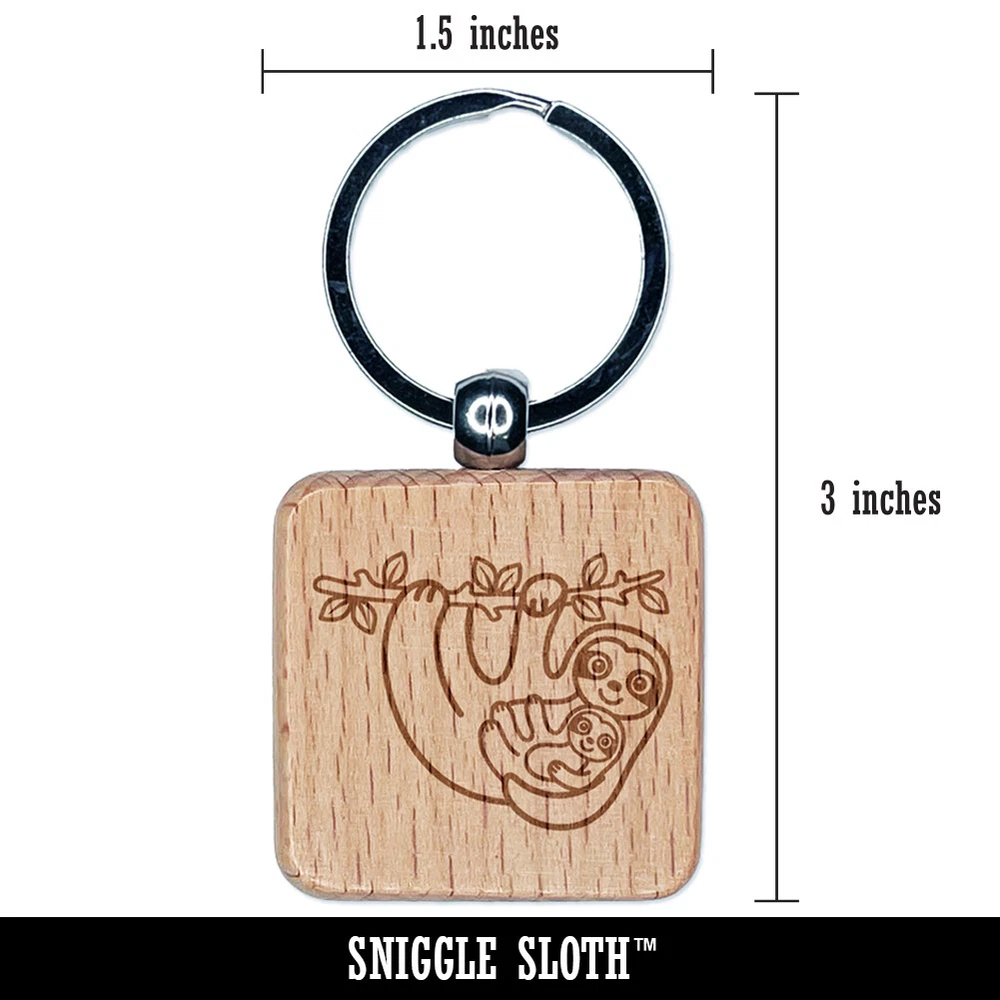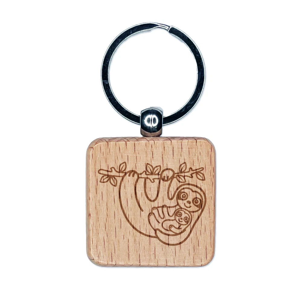 Mother and Baby Sloth Engraved Wood Square Keychain Tag Charm