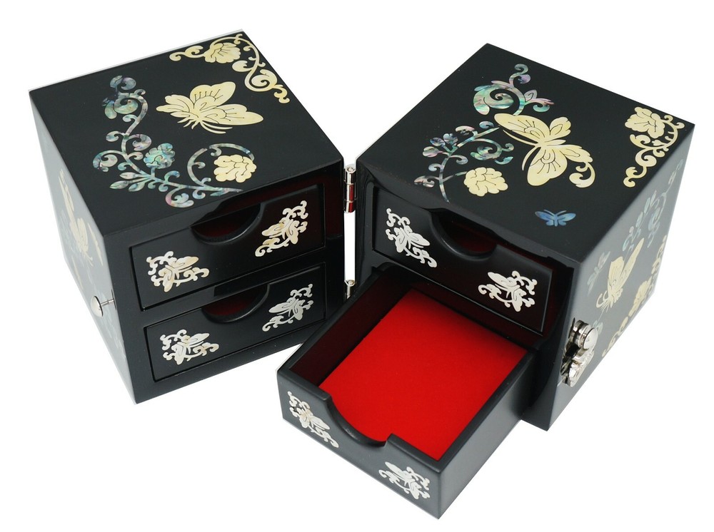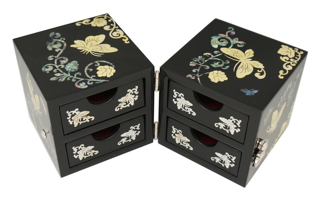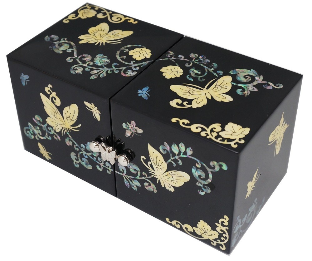 Korean Handmade Mother of Pearl I nlaid Nacre Dual Box 4 Drawer Jewelry Box Ring Necklace Earring Bracelet Brooch Case Storage Organizer Chest [Features] • High quality and Lots of drawer. • Korean traditional natural handicrafts made by a Master, Mother of pearl inlaid wood, Natural lacquer finish. • Butterfly & Flower patterns symbolizes bringing blessings and defeating disasters. • The Best Gift for You and Your Loved Ones. [Specification] • Design : Dual, 4 Drawer • Color : Black • Pattern : Butterfly & Flower • Material : Mother of Pearl(Nacre), Wood, Lacquer, Velvet • Dimensions(LWH) : 6.6 x 3.3 x 3.3 in (168 x 84 x 84 mm) • Country Of Origin: Korea, South [History and Transformation] The traditional Korean Handmade Mother of Pearl crafts is called 'Najeonchilgi'. It symbolizes eternal love and friendship and wishes for the harmony and prosperity of the family. It is made by craftsman through several manual processes. It is also a work of art that Korean kings and noblemen have loved for more than a thousand years, and today, various designs of Najeonchilgi are still being made. [Shipping] We usually use eGS, eBay's official overseas delivery program. • Standard shipping : 10 ~ 25 working days • Expedited shipping : 3 ~ 10 working days Please check if your address is correct. We only ship to the address listed on eBay. Unpredictable things, including weather conditions, shipping problems, customs policies, etc., can take more time than usual. Please understand. [Customer Support] We aim to provide fantastic purchasing experience and service to all customers with excellent Korean handicrafts. If you have any questions or information you need, feel free to send us a message and we'll answer as soon as possible. [Customer Feedback] Your satisfaction is our goal. Please give us feedback regarding our product and service. Your good feedback is valuable to us. Please help us to serve you better. We will do our best to resolve any issue for your complete satisfaction. [Note] Since these crafts are handicrafts, the design, color, decoration, size, etc. may vary, The color and design of mother of pearl may be different or reversed from the photos, and will be sent randomly. Accessories in the photos are not included and the price is per piece. Import duties, taxes, and charges are not included in the item price or shipping cost. These charges are the buyer's responsibility.