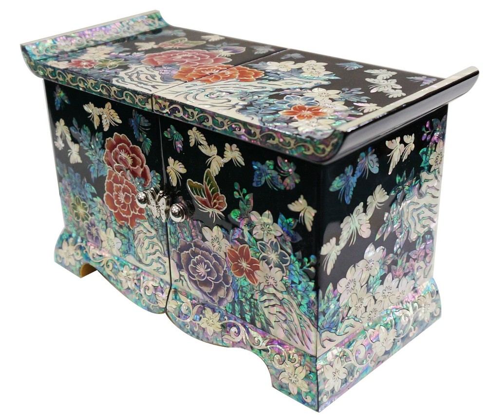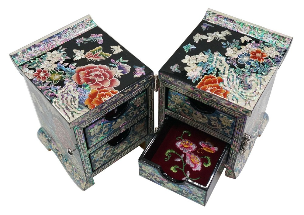 Korean Handmade Mother of Pearl I nlaid Nacre Dual Box 4 Drawer Jewelry Box Ring Necklace Earring Bracelet Brooch Case Storage Chest Trinket Box [Features] • High-end Design and Lots of drawer. • Korean traditional natural handicrafts made by a Master, Mother of pearl inlaid wood, Natural lacquer finish. • Peony and Butterfly patterns symbolize beauty and dignity. • The Best Gift for You and Your Loved Ones. [Specification] • Design: Dual, 4 Drawer • Color: Black • Pattern: Peony and Butterfly • Material: Mother of Pearl (Nacre), Wood, Lacquer, Velvet • Dimensions (LWH): 7.7 x 3.5 x 4.7 in (195 x 90 x 120 mm) • Country of Origin: Korea, South [History and Transformation] The traditional Korean Handmade Mother of Pearl crafts is called 'Najeonchilgi'. It symbolizes eternal love and friendship and wishes for the harmony and prosperity of the family. It is made by craftsman through several manual processes. It is also a work of art that Korean kings and noblemen have loved for more than a thousand years, and today, various designs of Najeonchilgi are still being made. [Shipping] We usually use eGS, eBay's official overseas delivery program. • Standard shipping: 10 ~ 25 working days • Expedited shipping: 3 ~ 10 working days Please check if your address is correct. We only ship to the address listed on eBay. Unpredictable things, including weather conditions, shipping problems, customs policies, etc., can take more time than usual. Please understand. [Customer Support] We aim to provide fantastic purchasing experience and service to all customers with excellent Korean handicrafts. If you have any questions or information you need, feel free to send us a message and we'll answer as soon as possible. [Customer Feedback] Your satisfaction is our goal. Please give us feedback regarding our product and service. Your good feedback is valuable to us. Please help us to serve you better. We will do our best to resolve any issue for your complete satisfaction. [Note] Since these crafts are handicrafts, the design, color, decoration, size, etc. may vary, The color and design of mother of pearl may be different or reversed from the photos, and will be sent randomly. Accessories in the photos are not included and the price is per piece. Import duties, taxes, and charges are not included in the item price or shipping cost. These charges are the buyer's responsibility.