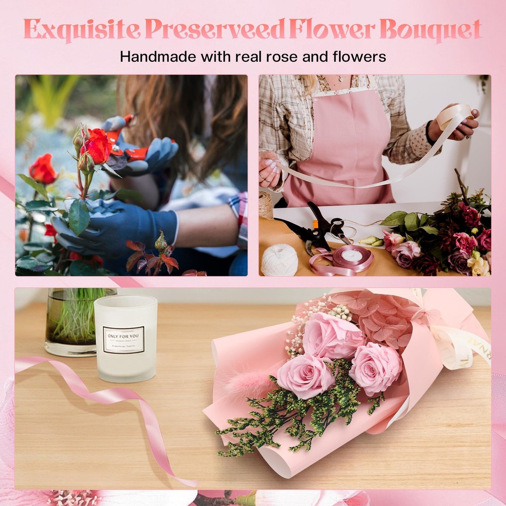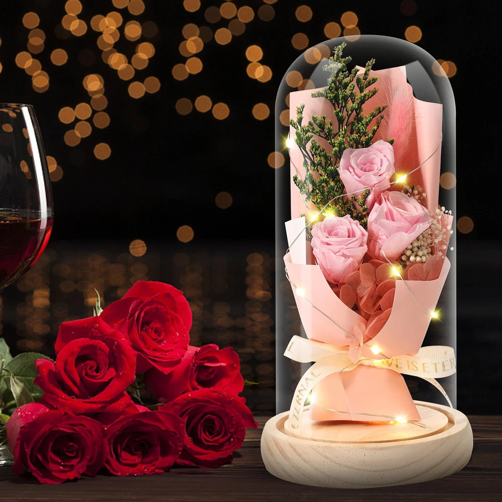 Preserved Flowers, Unique Rose Gift Forever Flower Bouquet in Glass Dome for Women and Mom, Home Decor Gifts for Birthday, Mother’s Day, Anniversary, Christmas, Wedding. 【One-of-a-kind Forever Rose Birthday Gifts for Mom】Mother' s Day Gifts Extend beauty and love, each preserved flower bouquet is made of unique roses, keep the original state for 3-5 years, same as the eternal love and beautiful her. Flowers bouquet for delivery prime 【Preserved Flower Bouquet Gifts For Mom】Mother' s Day Gifts Is not only the most popular gift in 2024 for her/wife/girlfriend/daughter/nana/mother-in-law/grandmother/godmother/sister/teacher/friend, but also a best decoration for room/home/bedroom/kitchen/aesthetic room/desk/office/table/indoor. It will be an unusual choice in your gift list on Mother's Day/Valentine's Day/graduation/anniversary/birthday/Christmas/Easter/wedding or other days when romantic is necessary. 【Special Valentine Gifts for Girlfriend Loved Ones】Mother' s Day Gifts No need daily maintenance, no cause pollen allergy, will not wither, just always beauty. Our preserved flower bouquet in glass dome are designed with warm and soft yellow LED lighting, as a decorative craft with natural elements, it can exert a positive effect on emotion and creative power, it's a gift to feel loved, choose the Forever flower for the special people, love and friendship. 【Express Your Love Mother Day Gifts for Women】Mother' s Day Gifts Roses are the symbol of love, friendship, courage, there is no better way to express your love than roses that last forever! It's an inspiring gift that will bring strength and good mood to the recipient. We offer 4 types of preserved flowers, red, purple, pink and yellow and orange mixed roses, choose gifts for your loved ones. 【Friendly Tips】1. The glass dome cannot be opened, cause that will damage the natural flowers. 2. Because it is purely handmade, the similarity of the actual objects is about 95%. 3. Avoid direct sunlight, keep dry, that will contribute to the extension of the shelf life of preserved flower.
