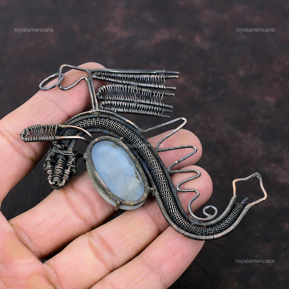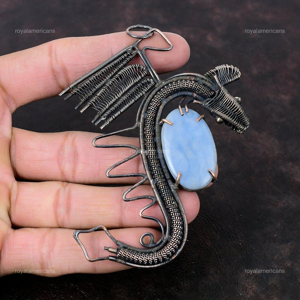 Note : Due to the natural formation of this gemstone. Slight variation in design and color are to be expected. Welcome to Royalamericans Mothers day Deal Copper Natural Angelite Dragon Graduation Wife Pendant Jewelry Handmade Pendant, Wire Wrapped Pendant, Wire Wrapped Jewelry, Copper Pendant, Copper Wire Pendant, Wrapped Jewelry, Wire Wrap Pendant, Wire Wrap Jewelry SKU : UFWP-4301 Gemstone : Angelite Stone Shape : As Seen In Picture Metal Purity : Unknown Copper Length : Millimeters Width : Millimeters Copper has been used for jewelry making for thousands of years, dating back to ancient civilizations such as the Egyptians, Romans, and Aztecs. Copper was valued for its beauty, versatility, and durability, and was often used to make everything from jewelry and coins to cookware and tools. In addition to its historical significance, copper jewelry also offers several benefits. Copper is a natural conductor of heat and electricity, which makes it ideal for energy healing and therapeutic purposes. Wearing copper jewelry is believed to have various health benefits, such as improving circulation, reducing inflammation, and boosting the immune system. Some people also believe that copper jewelry has the ability to balance energy and improve mood. For Mother's Day Gift For Father's Day Gift For Promise For Valentine's Day For Halloween Party For Christmas Day Gift For New Year Party For Mom For Her If you can't find the information you need or need some advice for your design? Feel free to contact us. We are fast to reply :) All our work is made by hand with Love and Care in our workshop Thank you so much for visiting and hope you enjoy shopping with us Royalamericans is committed to delivering the best quality sterling silver jewelry to customers. As a handmade jewelry manufacturer, we offer an extensive selection of copper gemstone jewelry that showcases the brilliance of our craftsmanship. We are an experienced handmade jewelry supplier with expertise in embellishing gemstones to suit every style. We offer you the liberty to create your jewelry ensemble with sparkling, earthy, and pure gemstones. Our Talented artisans masterfully handcraft each piece of jewelry you see here. Our pieces are made with genuine gemstones.