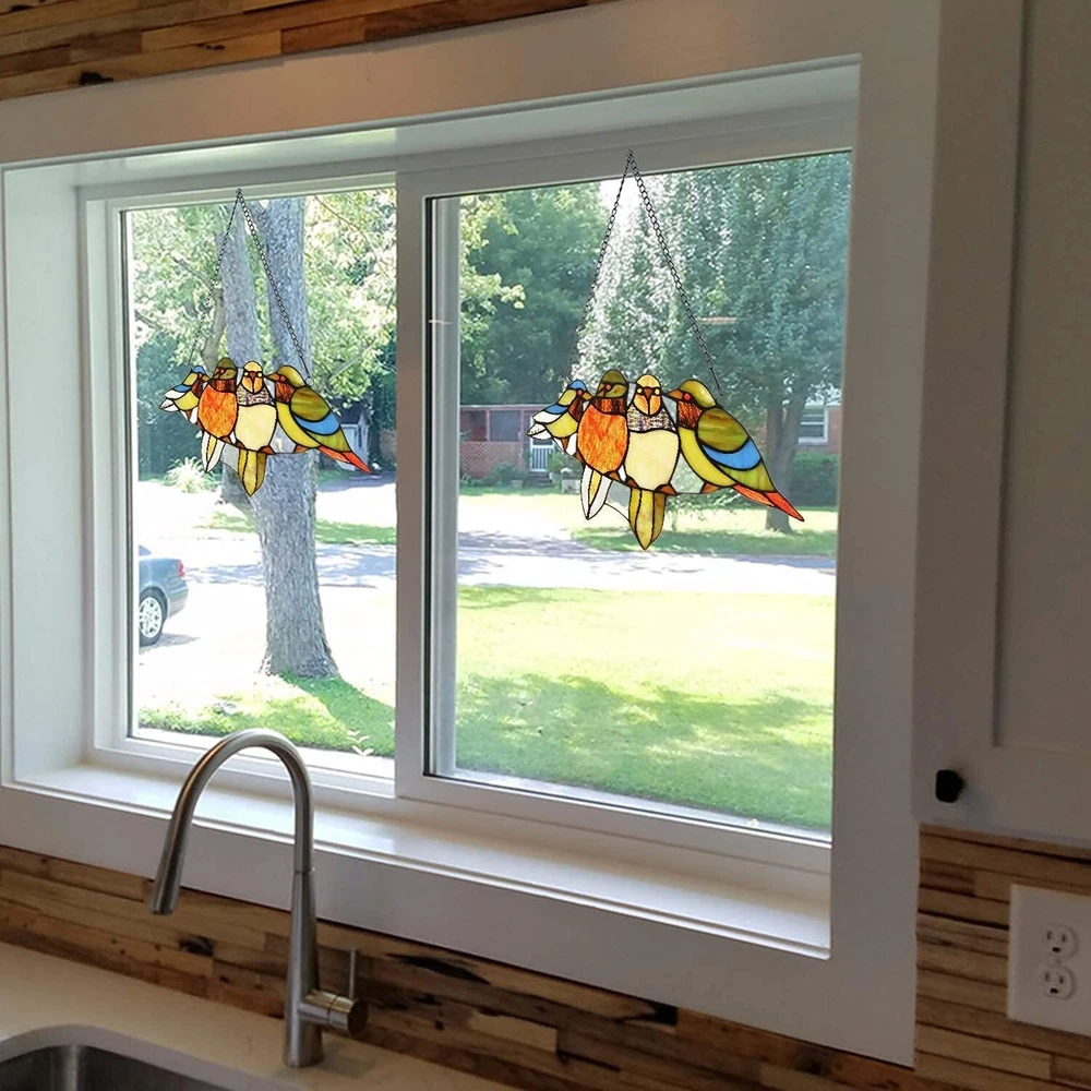 as a Tiffany Stained glass Professional Manufacturer since 2005. Abstract art is all about geometric shapes and design. It’s Picasso, Matisse, and Mondrian, a style that takes rudimentary forms and converts them into something extraordinary. Contemporary stained glass takes this classic form of art and design, allowing it to work with today’s architecture. When we think of contemporary art, we think of shapes, geometry, and city-centric appeal. With contemporary stained glass designs, you can have the best of a classic art form with a futuristic feel, it’s multi-functional for art and lighting. Tiffany glass is flexible when it comes to decor. Any type of style is accepting to accent that stained glass can offer. Kitchens, dens, bedrooms are favorite spots for an uplifting sun catcher. What types of glass are used in stained glass? Color glass provides the color and texture that is seen in every detail of the work. The exquisite finished product takes much time to make colors, textures and hues work together. Dimensions and Weight 14.3" wide x 7.7" height, 1.5 lbs. How to clean stained glass sun catchers? Care must be taken when cleaning stained glass. Minimal dusting is recommended. If the piece requires further care, use distilled water in a spray bottle to loosen any dirt and wipe with a lint free towel. Keep away from areas where grease can build up on the stained glass for best results. How to stained glass? Use bubble wrap or newspapers to provide a soft and non-shifting environment for stained glass panels. Pack in a dry carton or other container and in an area where it stays above freezing. Have something else in mind for an abstract design? us and we can create exactly what you envision Four Birds Stained Glass Window Hangings: The stained glass window panel features colorful birds perched on a branch, creating a vibrant and whimsical scene. It measures 7.7 inches in height and 14.3 inches in width, making it a perfect size for any window. Handcrafted with care: Each stained glass panel is handcrafted by skilled artisans, ensuring attention to detail and quality. The vibrant colors and intricate design make it a stunning addition to any home decor. Stained glass Crafts product: Design with 4 birds in stained glass, vividly presents the frolicking of birds. This stained glass art panels is marveled every time when the sunshine comes through window. Fusion of sunlight,art,birds: Because of the stained glass's opacity, when light is illuminated from behind, the stained glass is given activity and life.It is a wonderful way to enjoy the morning sun Perfect gift: If you're looking for a special and meaningful gift, the Tiffany Glass Style Window hangings birds is undoubtedly the perfect choice as it exudes elegance and sophistication!