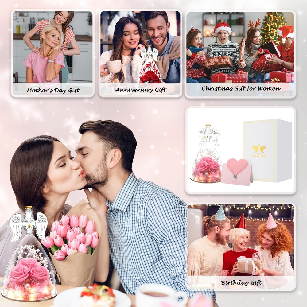 Valentines Day Gits for Her Preserved Real Rose in Angel Glass Preserved Flowers Birthday Gifts for Mom, Angel Gifts for Best Friend, Rose Gift for Her, Valentines DESIGNED FOR LOVE - Angel statue made of clear glass with golden outline drawing wings, halo and folded palms. Preserved flower is made of natural Japanese rose with unique preservation process, most keep the same color, shape and feeling of fresh cut flower, which can last 3-5 year, you just need to put the angel gifts in a cool place. Do not place in direct sunlight and humid places. Unique Preserved Rose Flower Gifts For Her - The upgraded angel rose has an LED light embedded in the center of the rose, full of a romantic atmosphere. Our angel figure preserved flowers are handmade, with a variety of flowers, combined with the unique appearance of angels, delicate and surprise.It is the perfect decoration for candlelight dinners, weddings, parties, living rooms, bedrooms, offices, coffee shops. LARGE SIZE & WHAT IS INCLUDED - The diameter of the angel is 4.10 inches and the height is 6.40 inches. The packaging contained a glass angel figurine, a angel i Love You Necklace, a beautiful gift box, and a great greeting card. Our three sunflower roses guardian angel figurines come with everything needed to present it as a gift, you don't have to buy wrapping paper or a card. I Love You Angel Pendant Necklace - The projection necklace uses the latest nano-projection technology to express "I love you" in 100 different languages, illuminating the angel pendant with light, mapping out 100 languages of I love you, which is romantic and can show your lover how much you love her. Unique Gift Ideas for Women - Beautifully Packaged. Arrives completely assembled in a high quality, reusable gift box, with a Delicate heart greeting card. You do not have to worry about a thing! We make gift giving fun and easy! Elegantly designed and filled with thoughtful gifts! Make Her Feel Pampered on Christmas, her birthday, or anniversary with this three roses guardian angel figurines luxury gift box for women!