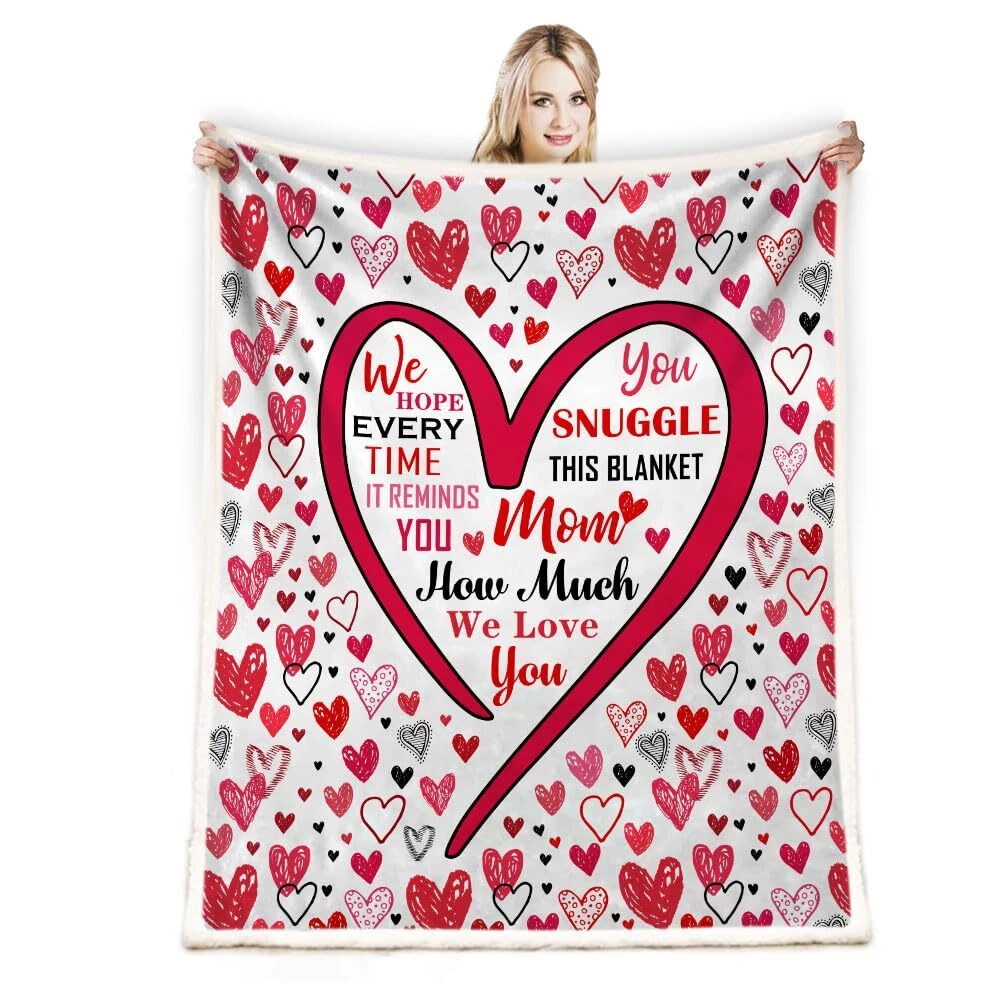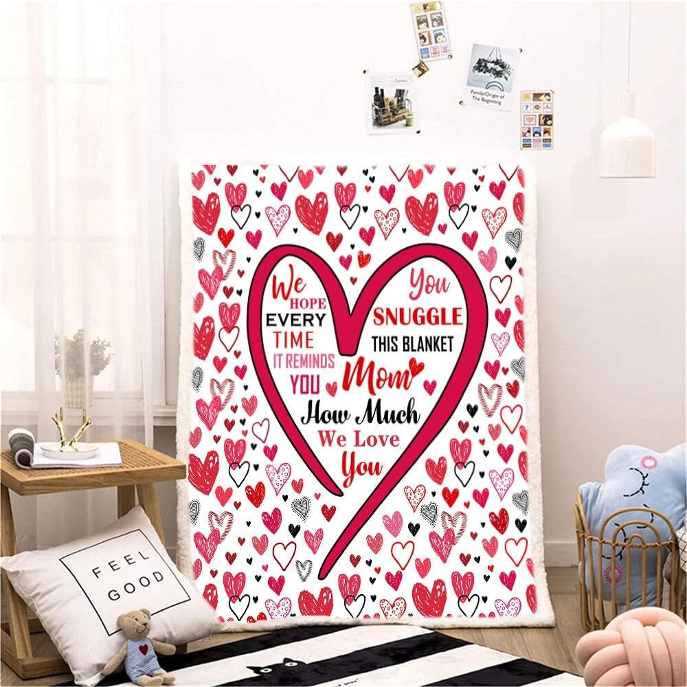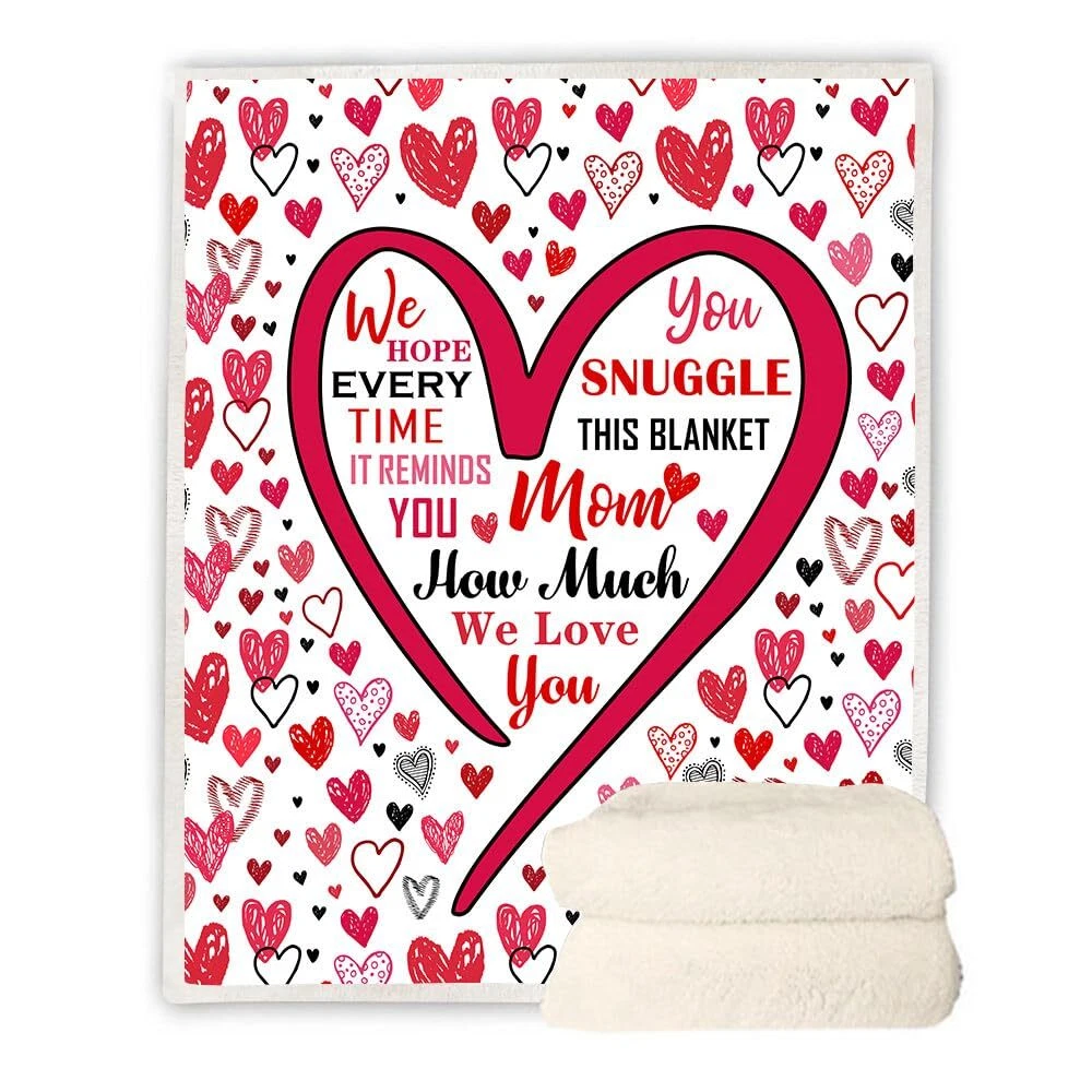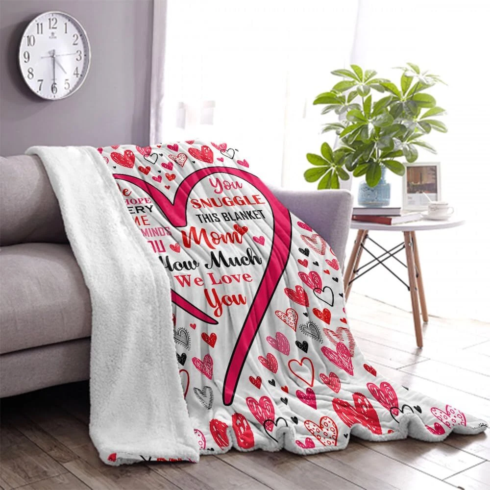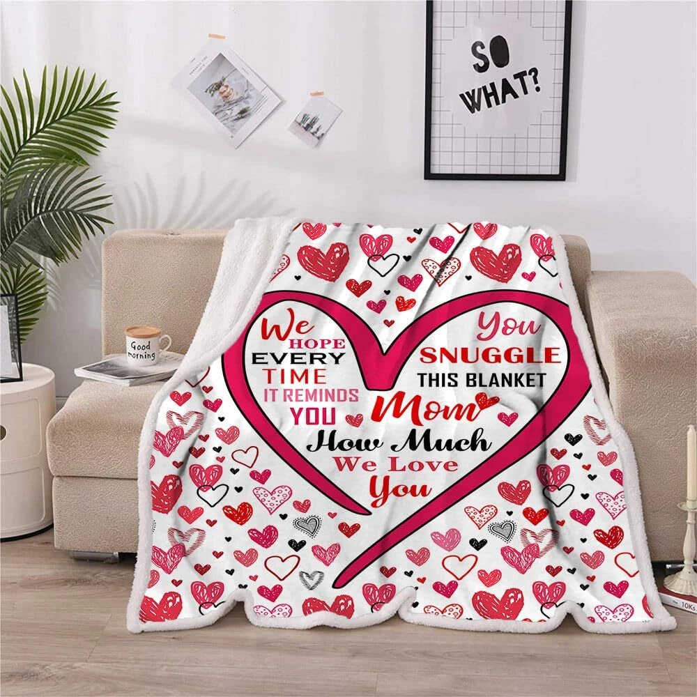 Gifts for Mom Christmas Mothers Day Gifts for Mom Blanket,Mom Gifts,Mom Birthday Valentines Gifts, Mom Gifts from Daughter Son,New Mom Gifts for Women Birthday Gifts for Mom Throw Blanket Description: Pattern : Microfiber 3D Print Gifts for Mom Theme Material Type : Microfiber,Plush : High Quality Advantages : Comfortable,Soft Throw Blanket Sizes: 130cm ×150cm (50inches × 60 inches) . 150cm ×200cm (60 inches × 80inches) . 1. Please purchase the correct size as needed. 2.There is an error of 1-3 cm in manual measurement Q&A: Q: Can this Gifts for Mom throw blanket be washed in a washing machine? A:Yes! It can be washed in a washing machine, but care must be taken not to wash it with water above 140°F.Because it is a thermal transfer, there may be a smell of ink, which will disappear after washing or drying! Can be heated to dry but the temperature should not be too high Q: Is this Gifts for Mom blanket free returnable? A: Yes! It's free returnable. Also if you have any question about this blanket please us and we will answer all the questions you may have. Q:Will it fade after washing?How is it packaged? A:No! It's digital printing. Won't fade after long term use.The blankets were vacuum packaged for better shipment. Q: Is this blanket thick? A: This blanket is not very thick but it's fluffy enough for better warmth. But since they are vacuum packaged. Please wait a few minutes and let them restore to best status. MOM GIFTS: Give MOM the appreciation her deserves with this special gift for MOM, that lovingly lets her know, all the ways she is loved and cherished. The unique I Love You MOM Blanket is personalized with all the words we wish we could say to our MOM every day to thank them for all that they do. Our MOM is kind, brave, hard-working, devoted, loving, generous, giving, adored, blessed, amazing, caring, strong, and inspiring. Remember we love you MOM GIFTS for MOM:Comfortable Blanket. durable fabric, handcrafted to the highest quality standards, is thick and luxurious, suitable for all seasons. It boasts a flannel fleece & Sherpa. Perfect for MOM’s lap when snuggling on the couch, for travel or warmth in a hospital bed OCCASIONS: This original sherpa throw blanket for women is a good gift to celebrate your MOM for her birthday, Valentine’s Day, Anniversary, Christmas, Thanksgiving, or just a simple gift for any time of the year. It would also make the best MOM gift for a milestone birthday like a 30th, 40th, 50th, 60th, 70th, 80th, or any birthday in between LOVE and CARE: These are perfects presents for MOM. From expectant new MOM, for a baby shower, or MOM of young children and teenagers, or an elderly MOM that is going through cancer, therapy, or post-surgery and needs a compassionate, caring, thoughtful gift. The best MOM birthday gifts from daughter or son or all of the family’s children Celebrate the Reasons We Love Our MOM: Looking for gifts for MOM who have everything? The MOM Blankets make beautiful, practical and meaningful happy birthday gifts for MOM. Rather than sending a gift that only lasts a few days or is used occasionally, the MOM Blanket is a special I Love You gift for MOM that will be her daily reminder that she is loved and adored. It will become her most treasured gift