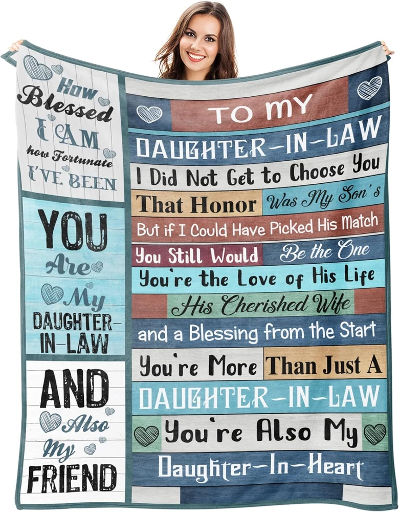 ❉Perfect Gift to Daughter-in-law: This super-soft flannel blanket is designed for a thoughtful caring personal gift for a daughter-in-law from the mother-in-law. The intent of this blanket is not only to bring warmth but also to bring a smile, courage, and a feeling of love. You can use it as a Birthday Engagement Christmas wedding Valentine's Day Gifts for Daughter-in-law ☃Material and Size: This daughter-in-law blanket height:60 inch width:50 inch. Blanket features a premium ultra-soft polyester fabric, It retains its beautiful color even after washing. Suitable for use all year round ♨Applicable Scene: Suitable for all seasons, indoor and outdoor use.Ideal for airplane, camping, sofa, bed, outdoors and car. Give this blanket as a gift to Christmas, daughter's-in-law birthday, and other family holidays, which is the best choice. ☀Ideal Gift of Holiday: This beautiful blanket is printed with a special meaning message and is perfect for a mother's gift to her daughter-in-law on birthdays, Valentine's Day, Christmas, anniversaries, weddings, and more ☽Easy Wash & Care: this flannel blanket is made of polyester fabric that you can wash with a washing machine, but you should notice that do not use bleach and avoid direct heat, please dry it on low heat. Product Description Luxury Flannel A lightweight blanket has just the right weight. It's light and breathable to keep you warm and cozy but won't be too hot. Premium microfiber that is silky smooth to touch, perfect for all-season use. Caring Words Inspiring words like a warm embrace that delivers your love and caring support to your Daughter-IN-LAW, soothing her soul, bringing her a beautiful mood, and recharging her spirit Exquisite Edges Every detail of the flannel blanket is perfect, double-stitched are neat and strong, making the bed blanket more beautiful and practical, and will hold up nicely after every wash. No pilling, fading, or shrinking. Multi Purpose Blanket This soft flannel blanket is a thoughtful personal gift from a mother-in-law to her daughter-in-law to provide warmth in all seasons and can be used as a bed blanket, bedroom, dormitory, sofa, picnic, beach, camping, travel, snuggle while watching TV or reading, or nap on the sofa. Mother-in-law to daughter-in-law perfect gift, for Birthday gift, Anniversary gift, Christmas gift, Wedding gift, Valentine's Day gift, Mother's Day gift, holiday gift, etc.