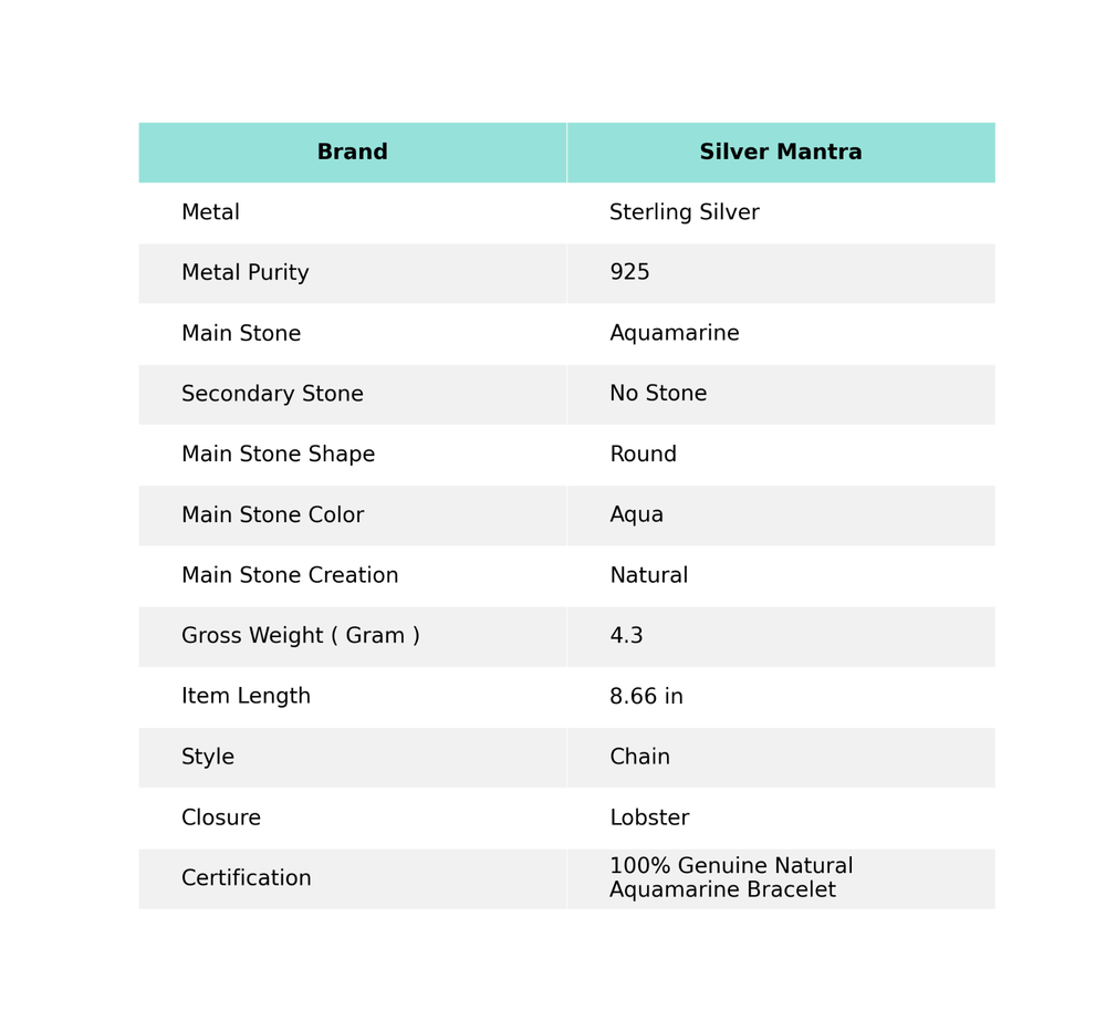 Welcome to Silvermantra2016 Womens day Sale Aquamarine Gemstone 925 Solid Silver Chain Boho Bracelet Jewelry This aquamarine bracelet is handmade in India with sterling silver. Featuring a round aquamarine stone, it has a lobster closure and measures 8.66 inches in length. The bracelet is nickel-free and engraved, with a bezel setting style. Ideal for special occasions like engagements, birthdays, or weddings, it comes with a seller warranty and is signed by the maker. Why silvermantra2016 ? Pure 925 Sterling Silver Jewelry. No alloy and brass nothing. We do not use any type of chemical in our plating process to enhance the shine & luster of the metal which are harmful to your skin. We use high quality stones which gives even better radiance than real gemstones. Customization We offer customization on each product at reasonable price. If you have a design in mind, we can manufacture customized products as well. Gemstone Elegance Choose from a dazzling array of gemstones, including Turquoise, Garnet, Tourmaline, Black Onyx, Tiger Eye, Onyx, Lapis Lazuli, Rainbow Moonstone, Labradorite, Amethyst, Citrine, Cubic Zirconia, Amber, Aquamarine, Rhodochrosite, Amazonite, Aventurine, Azurite, Malachite, Opal, Carnelian, Chalcedony, Chrysoprase, Jasper, Agate, Iolite, Topaz, Larimar, Peridot, Pearl, Prehnite, Ruby, Emerald, Smoky Quartz, Coral, Rutile Quartz and more. Each gemstone boasts unique beauty and energy to enhance your aura. Exquisite Designs Choose from an array of captivating designs, including intricate nature-inspired motifs, timeless classics, and modern interpretations. Our women's gemstone Bracelet cater to your unique style preferences. Diverse Gemstone Selection Explore a vast range of gemstones, each connected to specific birth months and symbolic meanings. Versatile Elegance Whether you're dressing up for a special event or elevating your daily attire, our gemstone Bracelet effortlessly transition from day to night, ensuring you shine in every moment. Value and Quality As proud manufacturers, we prioritize offering premium women's Sterling Silver Bracelet with gemstones at the most affordable prices. Our commitment to value means you can indulge in exceptional jewelry without breaking the bank. ShippingPolicy We do ship worldwide by Registered & Express mail with tracking number. Shipping time takes up to 10 - 14 business days depending on location. All additional payments such as duties & taxes are the buyer's responsibility. We ship only to the approved address that registered in Payoneer. Note: In some cases delay your parcel as per our eBay global shipping partner conveyed us, that shipments may take 25 to 30 days also to reach you due to cross border and customs, delaying clearance of shipments. Note: All Jewelry photos are taken by professional’s photographers. They use many photo equipments, like Flash, Day Light etc. Brightness and contrast are also used in photo editing. So gemstones color can be little dark or light. Handling Time : 2 Business Days Return Policy We Deals in Handmade 925 Sterling Silver Gemstone Jewelry. In any case, if you are not satisfied with the product first, please contact us and we will try to satisfy you by resolving your concern. We only accept returns if product is having any manufacturing defect. If buyer open return request with these reasons like: don't like the item or changed mood, then buyer will have to pay return shipping charges. We didn't accept return of broken piece and stone. If buyer want to return, then return shipping charges will be paid by buyer. Feedback We give immediate positive feedback to our buyers as soon as payment is received in Payoneer. In any case of any problem contact us right away before leaving any Negative or Neutral feedback. We will do our best to resolve any problem and to make you satisfied. Thank you for shopping!