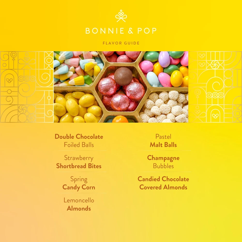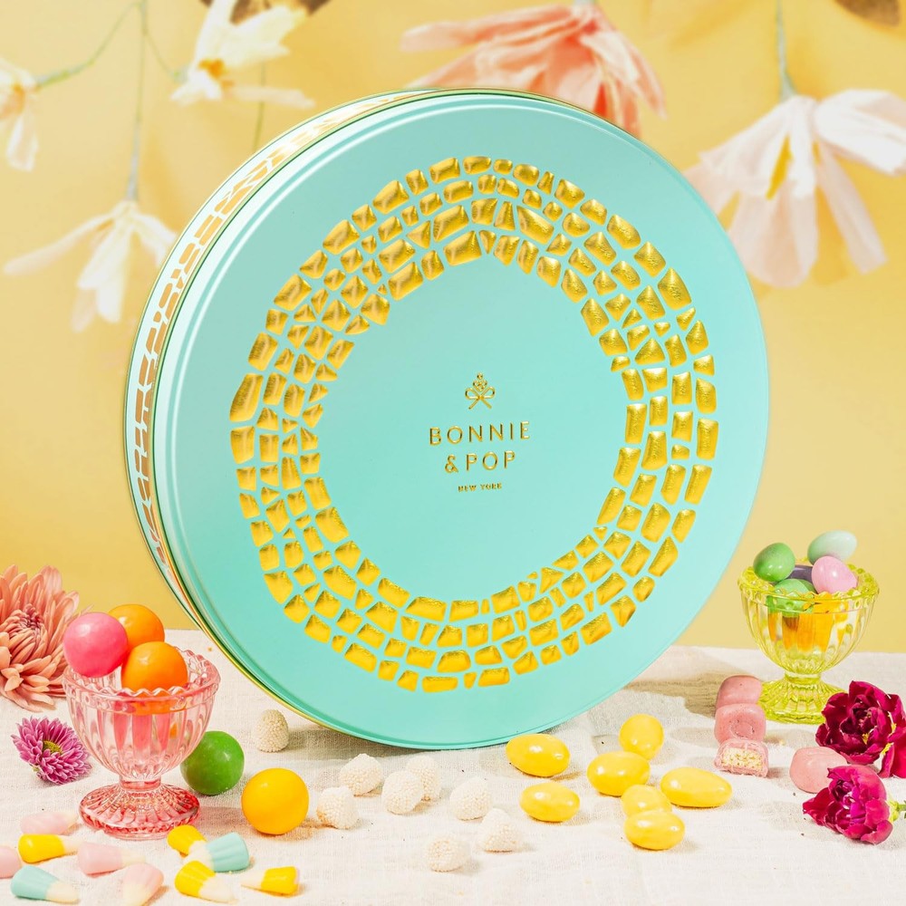 CELEBRATE sweetness with our delightful gift tin. Adorned in soft light blue, this round tin harbors a scrumptious assortment of seasonal favorites. Perfect for holiday gifting or indulging in the joyous spirit of Easter celebrations. CELEBRATE sweetness with our delightful gift tin. Adorned in soft light blue, this round tin harbors a scrumptious assortment of seasonal favorites. Perfect for holiday gifting or indulging Mom. GREAT GIFT: Arrives in an elegant keepsake tin packed with Candy Corn, Malt Balls, Strawberry Shortbread, Candy Champagne Gummies, Colorful Chocolate Almonds and Pink Foiled Chocolate Balls SAFE AND CONVENIENT PACKAGING: Each snack section arrives INDIVIDUALLY WRAPPED to promote hygiene safety, freshness and cleanliness for sharing. Keepsake tin is a remembrance long after the occasion and snacks are gone - send one to yourself! SAY IT SWEETLY: Great gift for families and corporate gifting alike. The right choice for multiple holidays like Mother’s Day, Father’s Day, Summer Cheer, Christmas, Valentine’s Day, Easter, Hanukkah, Birthdays, Sympathy, Condolence, to say Thank You, I Love You, and everything in between. ELEGANT GIFTING: Our Bonine and Pop embellished tin makes this an elegant gift that will be a keepsake long after the occasion and snacks are gone.