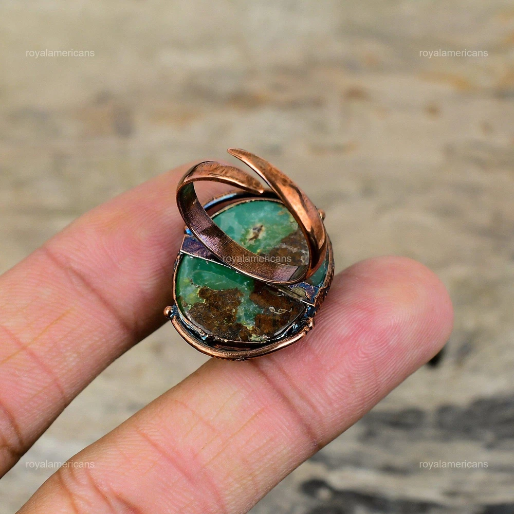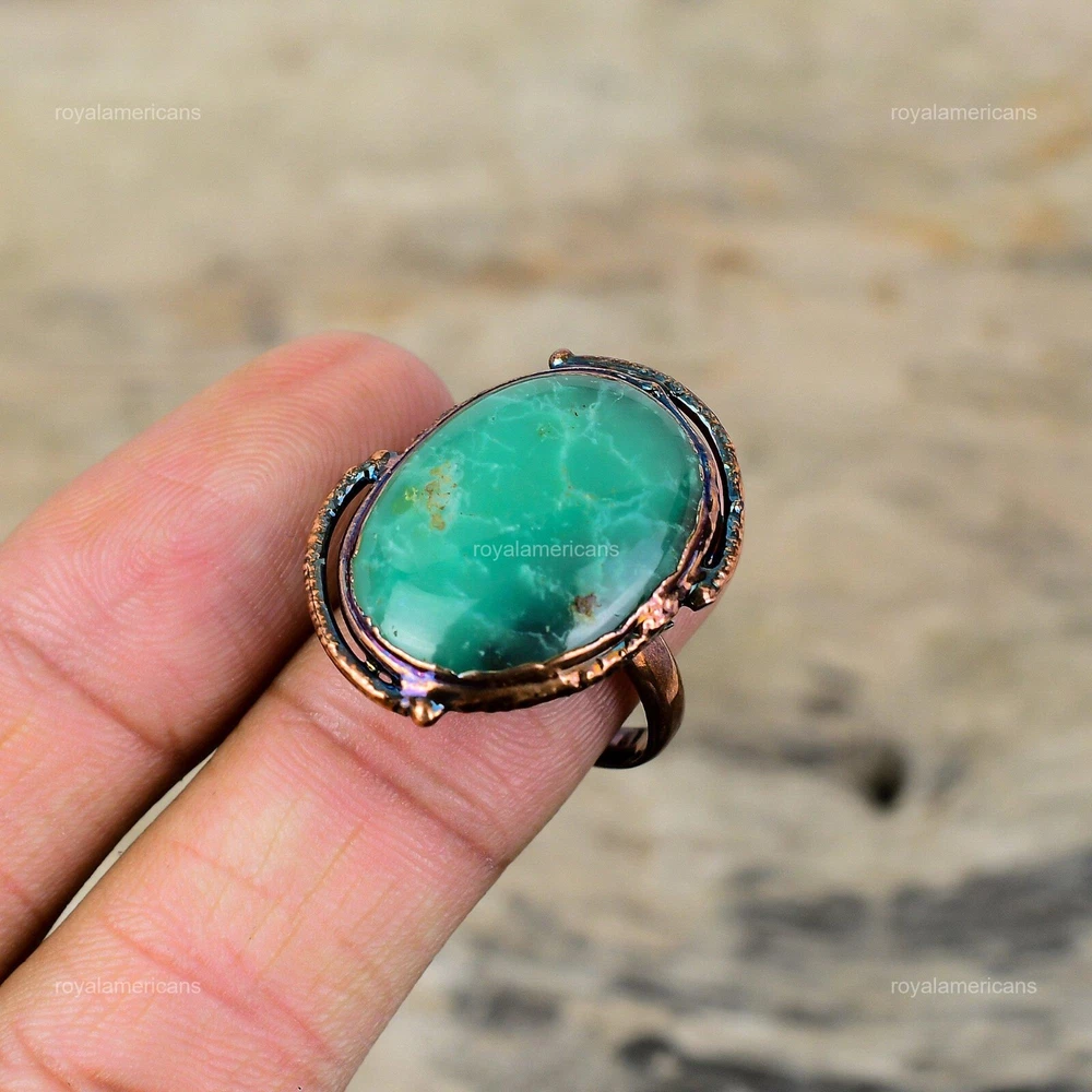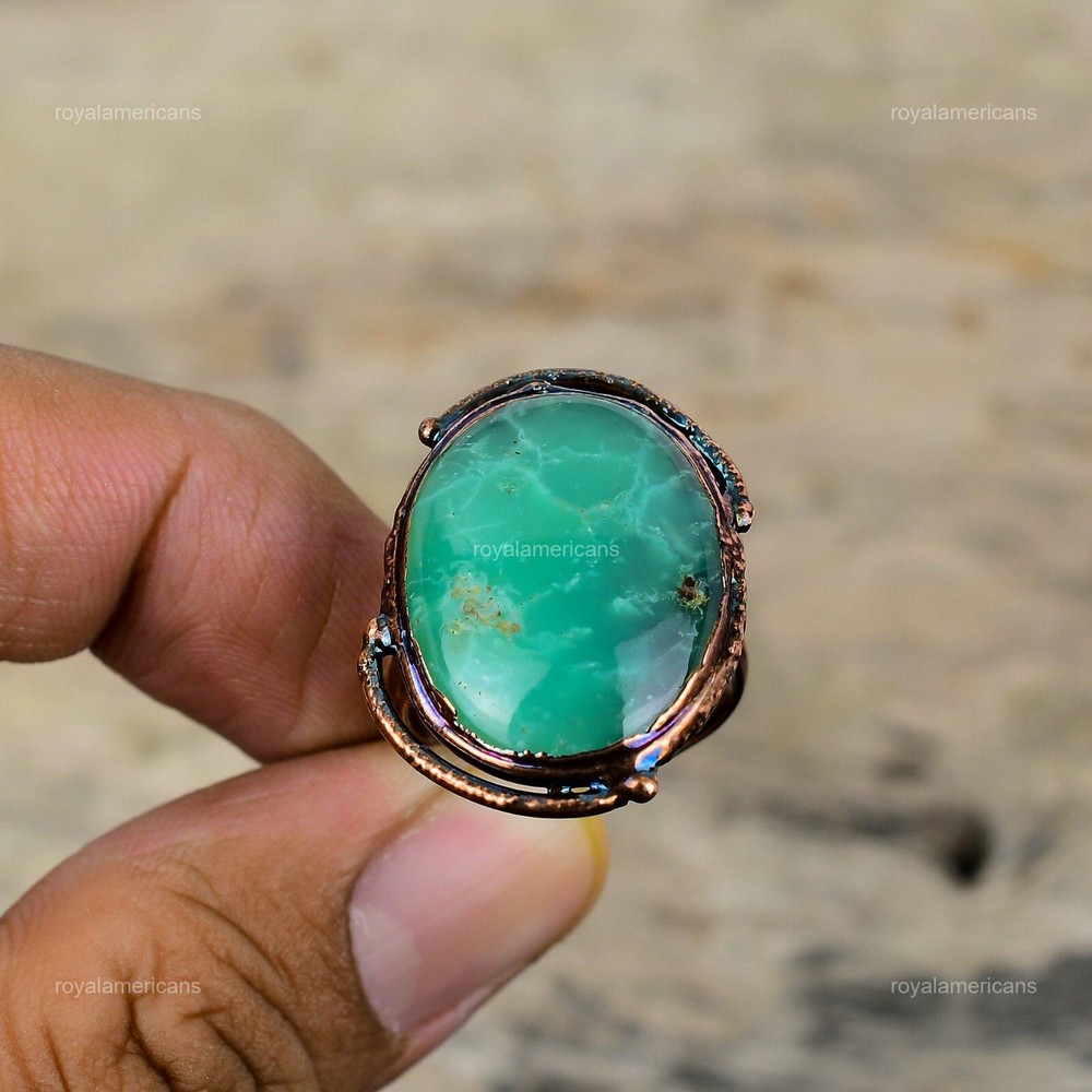 Note : Due to the natural formation of this gemstone. Slight variation in design and color are to be expected. Welcome to Royalamericans Mothers day Deal Copper Chrysoprase Stone Electroformed Solitaire Ring Jewelry Handmade Ring, Wire Wrapped Ring, Wire Wrapped Jewelry, Copper Pendant, Copper Wire Ring, Wrapped Jewelry, Wire Wrap Ring, Wire Wrap Jewelry SKU : UZR-69 Gemstone : Chrysoprase Stone Shape : Oval Metal Purity : Unknown Copper Ring Size : Adjustable US Adjustable : Yes Copper has been used for jewelry making for thousands of years, dating back to ancient civilizations such as the Egyptians, Romans, and Aztecs. Copper was valued for its beauty, versatility, and durability, and was often used to make everything from jewelry and coins to cookware and tools. In addition to its historical significance, copper jewelry also offers several benefits. Copper is a natural conductor of heat and electricity, which makes it ideal for energy healing and therapeutic purposes. Wearing copper jewelry is believed to have various health benefits, such as improving circulation, reducing inflammation, and boosting the immune system. Some people also believe that copper jewelry has the ability to balance energy and improve mood. For Mother's Day Gift For Father's Day Gift For Promise For Valentine's Day For Halloween Party For Christmas Day Gift For New Year Party For Mom For Her If you can't find the information you need or need some advice for your design? Feel free to contact us. We are fast to reply :) All our work is made by hand with Love and Care in our workshop Thank you so much for visiting and hope you enjoy shopping with us Royalamericans is committed to delivering the best quality sterling silver jewelry to customers. As a handmade jewelry manufacturer, we offer an extensive selection of copper gemstone jewelry that showcases the brilliance of our craftsmanship. We are an experienced handmade jewelry supplier with expertise in embellishing gemstones to suit every style. We offer you the liberty to create your jewelry ensemble with sparkling, earthy, and pure gemstones. Our Talented artisans masterfully handcraft each piece of jewelry you see here. Our pieces are made with genuine gemstones.