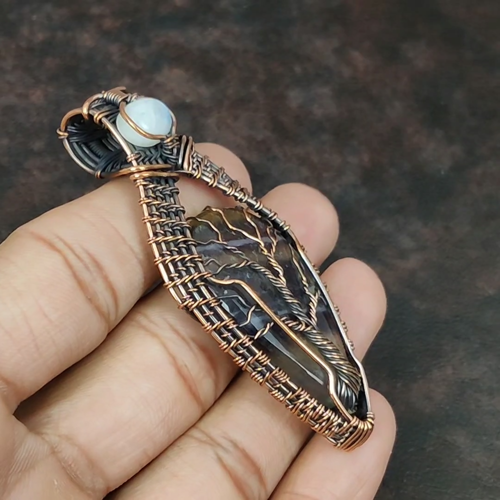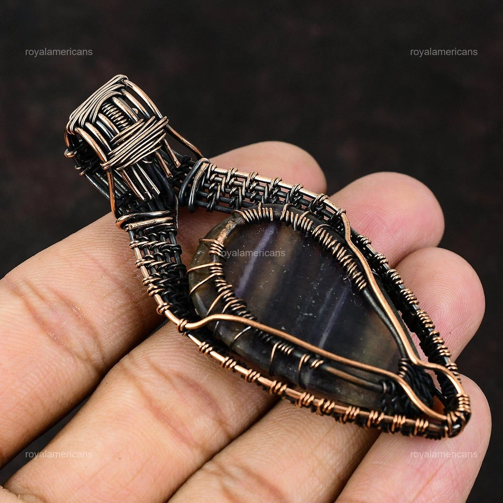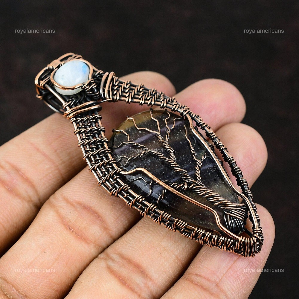Note : Due to the natural formation of this gemstone. Slight variation in design and color are to be expected. Welcome to Royalamericans Mothers day Deal Copper Multi Fluorite Stone Rainbow Moonstone Birthday Pendant Handmade Pendant, Wire Wrapped Pendant, Wire Wrapped Jewelry, Copper Pendant, Copper Wire Pendant, Wrapped Jewelry, Wire Wrap Pendant, Wire Wrap Jewelry SKU : UWP-113 Gemstone : Multi Fluorite Stone Shape : Pear Metal Purity : Unknown Copper Length : 75 Millimeters Width : 30 Millimeters Copper has been used for jewelry making for thousands of years, dating back to ancient civilizations such as the Egyptians, Romans, and Aztecs. Copper was valued for its beauty, versatility, and durability, and was often used to make everything from jewelry and coins to cookware and tools. In addition to its historical significance, copper jewelry also offers several benefits. Copper is a natural conductor of heat and electricity, which makes it ideal for energy healing and therapeutic purposes. Wearing copper jewelry is believed to have various health benefits, such as improving circulation, reducing inflammation, and boosting the immune system. Some people also believe that copper jewelry has the ability to balance energy and improve mood. For Mother's Day Gift For Father's Day Gift For Promise For Valentine's Day For Halloween Party For Christmas Day Gift For New Year Party For Mom For Her If you can't find the information you need or need some advice for your design? Feel free to contact us. We are fast to reply :) All our work is made by hand with Love and Care in our workshop Thank you so much for visiting and hope you enjoy shopping with us Royalamericans is committed to delivering the best quality sterling silver jewelry to customers. As a handmade jewelry manufacturer, we offer an extensive selection of copper gemstone jewelry that showcases the brilliance of our craftsmanship. We are an experienced handmade jewelry supplier with expertise in embellishing gemstones to suit every style. We offer you the liberty to create your jewelry ensemble with sparkling, earthy, and pure gemstones. Our Talented artisans masterfully handcraft each piece of jewelry you see here. Our pieces are made with genuine gemstones.