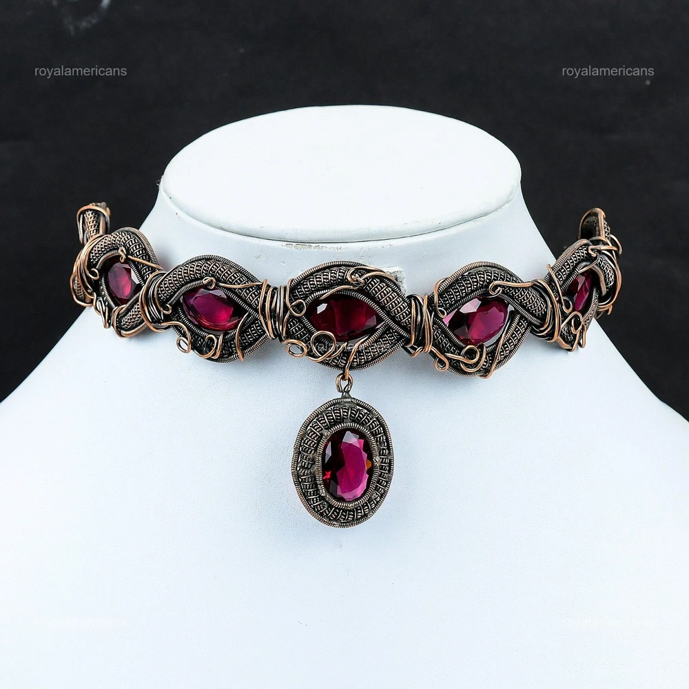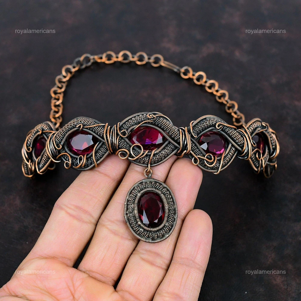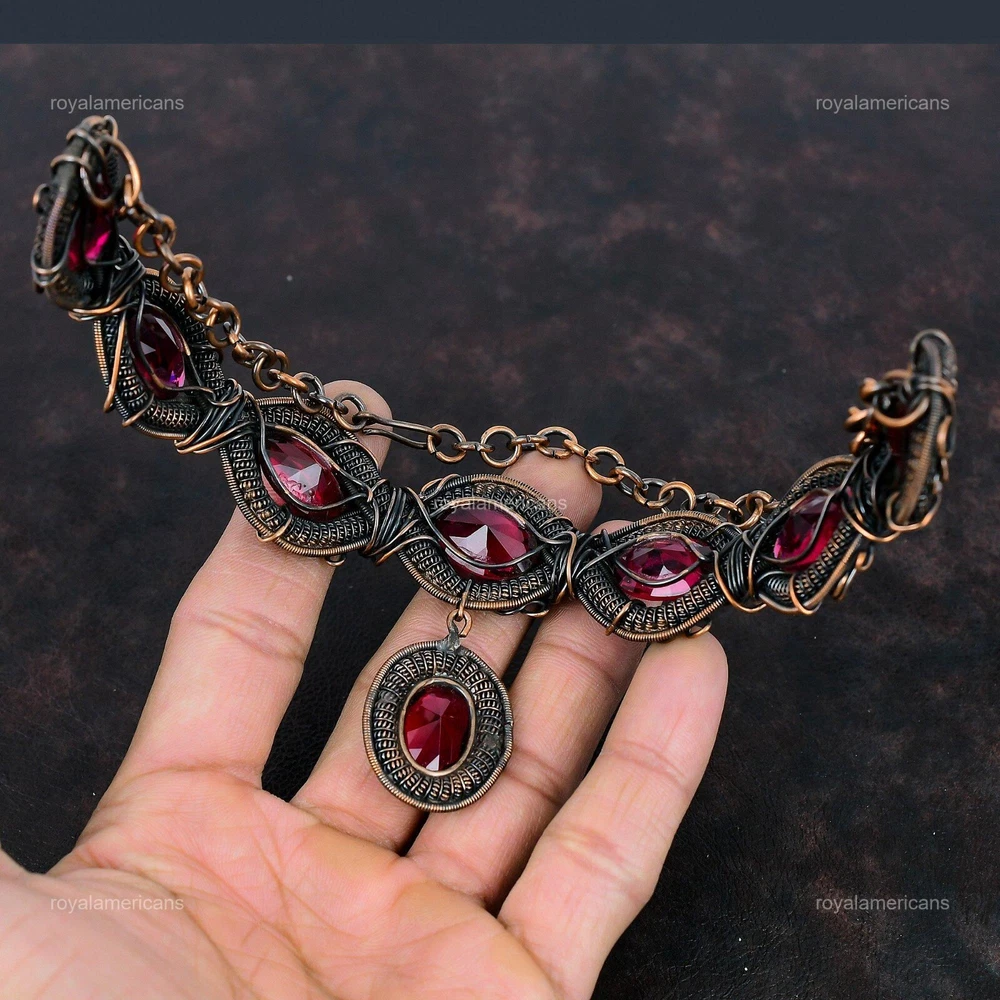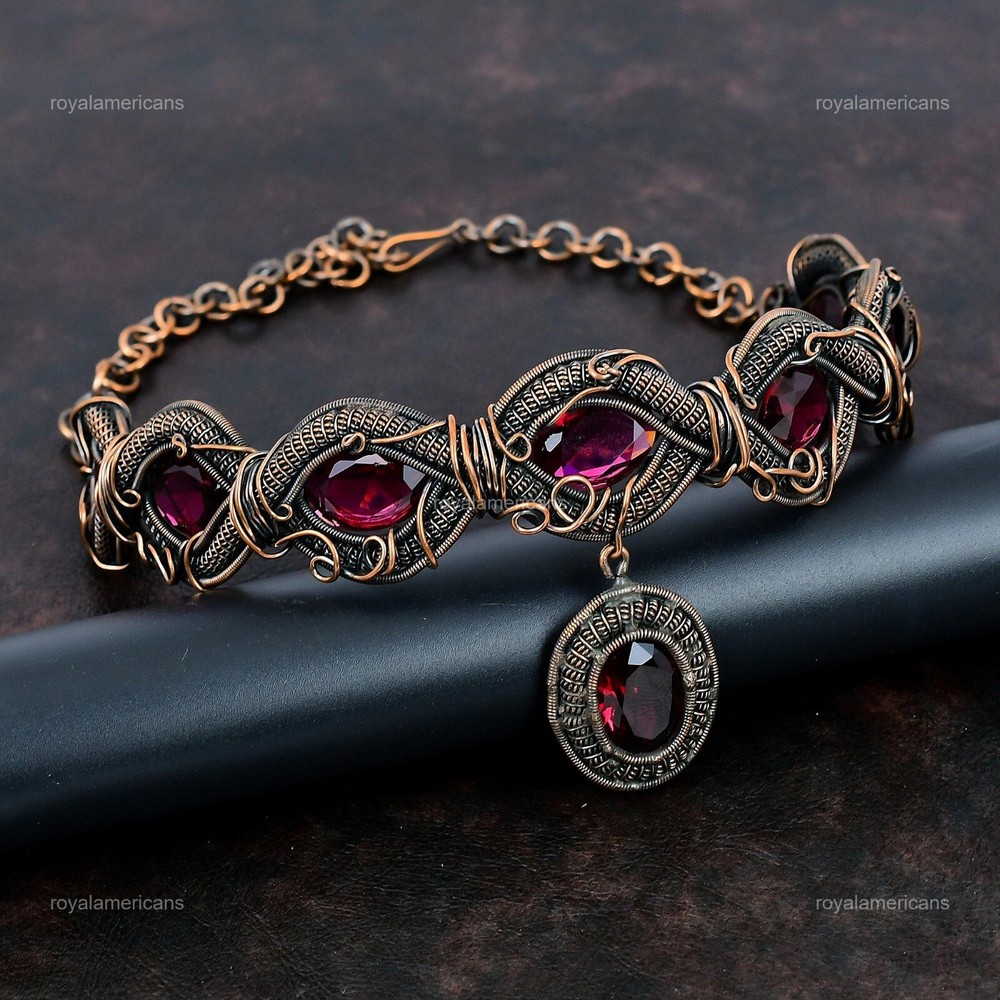 Note : Due to the natural formation of this gemstone. Slight variation in design and color are to be expected. Welcome to Royalamericans Mothers day Sale Copper Oval Rubellite Stone Wife Chain Wedding Necklace Jewelry Handmade Necklace, Wire Wrapped Necklace, Wire Wrapped Jewelry, Copper Pendant, Copper Wire Necklace, Wrapped Jewelry, Wire Wrap Necklace, Wire Wrap Jewelry SKU : UFWN-328 Gemstone : Rubellite Stone Shape : Oval Metal Purity : Unknown Copper Length : 18 Inches Width : Inches Copper has been used for jewelry making for thousands of years, dating back to ancient civilizations such as the Egyptians, Romans, and Aztecs. Copper was valued for its beauty, versatility, and durability, and was often used to make everything from jewelry and coins to cookware and tools. In addition to its historical significance, copper jewelry also offers several benefits. Copper is a natural conductor of heat and electricity, which makes it ideal for energy healing and therapeutic purposes. Wearing copper jewelry is believed to have various health benefits, such as improving circulation, reducing inflammation, and boosting the immune system. Some people also believe that copper jewelry has the ability to balance energy and improve mood. For Mother's Day Gift For Father's Day Gift For Promise For Valentine's Day For Halloween Party For Christmas Day Gift For New Year Party For Mom For Her If you can't find the information you need or need some advice for your design? Feel free to contact us. We are fast to reply :) All our work is made by hand with Love and Care in our workshop Thank you so much for visiting and hope you enjoy shopping with us Royalamericans is committed to delivering the best quality sterling silver jewelry to customers. As a handmade jewelry manufacturer, we offer an extensive selection of copper gemstone jewelry that showcases the brilliance of our craftsmanship. We are an experienced handmade jewelry supplier with expertise in embellishing gemstones to suit every style. We offer you the liberty to create your jewelry ensemble with sparkling, earthy, and pure gemstones. Our Talented artisans masterfully handcraft each piece of jewelry you see here. Our pieces are made with genuine gemstones.