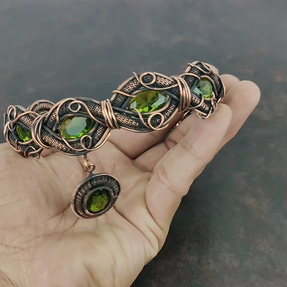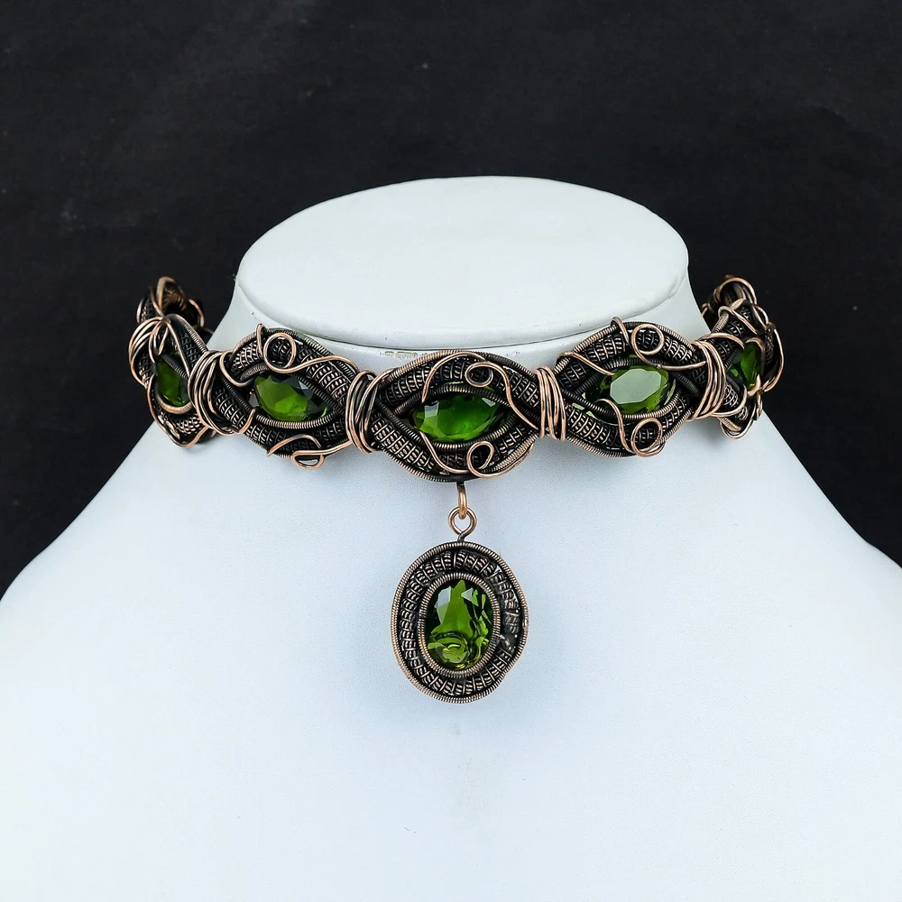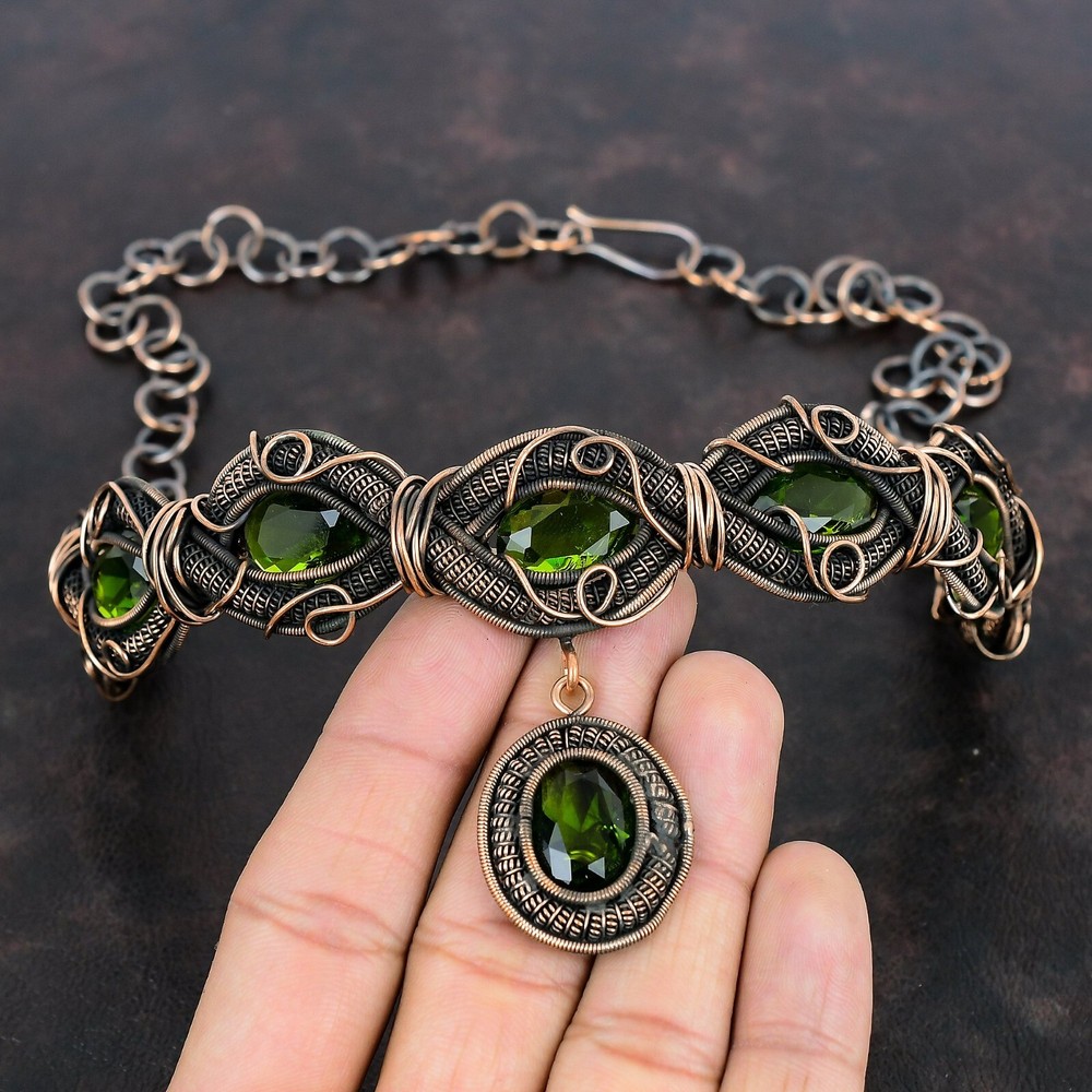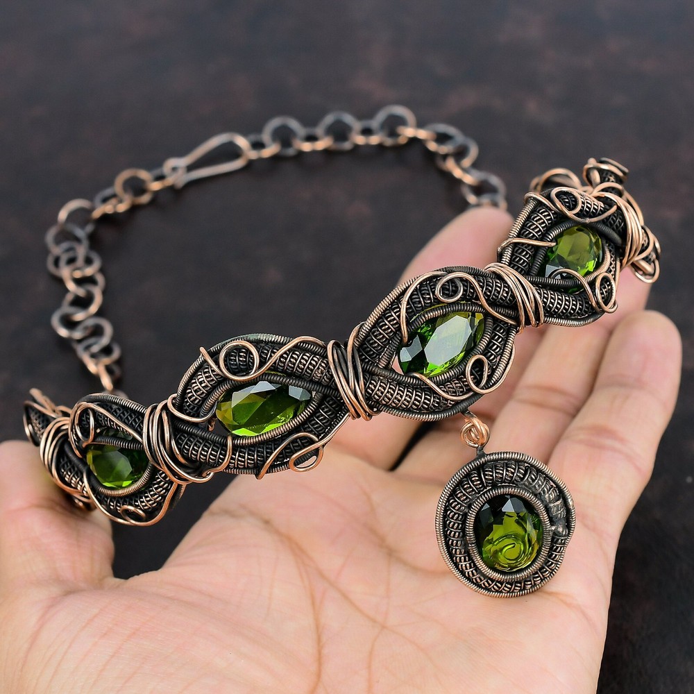 Note : Due to the natural formation of this gemstone. Slight variation in design and color are to be expected. Welcome to Silver Creation Mothers day Deal Copper Peridot Gemstone Wedding Wire Wrapped Chain New Necklace Handmade Necklace, Wire Wrapped Necklace, Wire Wrapped Jewelry, Copper Pendant, Copper Wire Necklace, Wrapped Jewelry, Wire Wrap Necklace, Wire Wrap Jewelry SKU : VFWN-335 Stone Shape : Oval Metal Purity : Unknown Copper Length : 18 Inches Width : Inches Copper has been used for jewelry making for thousands of years, dating back to ancient civilizations such as the Egyptians, Romans, and Aztecs. Copper was valued for its beauty, versatility, and durability, and was often used to make everything from jewelry and coins to cookware and tools. In addition to its historical significance, copper jewelry also offers several benefits. Copper is a natural conductor of heat and electricity, which makes it ideal for energy healing and therapeutic purposes. Wearing copper jewelry is believed to have various health benefits, such as improving circulation, reducing inflammation, and boosting the immune system. Some people also believe that copper jewelry has the ability to balance energy and improve mood. For Mother's Day Gift For Father's Day Gift For Promise For Valentine' Day For Halloween Party For Christmas Day Gift For New Year Party For Mom For Her If you can't find the information you need or need some advice for your design? Feel free to contact us. We are fast to reply :) All our work is made by hand with Love and Care in our workshop Thank you so much for visiting and hope you enjoy shopping with us Silvercreations is committed to delivering the best quality sterling silver jewelry to customers. As a handmade jewelry manufacturer, we offer an extensive selection of copper gemstone jewelry that showcases the brilliance of our craftsmanship. We are an experienced handmade jewelry supplier with expertise in embellishing gemstones to suit every style. We offer you the liberty to create your jewelry ensemble with sparkling, earthy, and pure gemstones. Our Talented artisans masterfully handcraft each piece of jewelry you see here. Our pieces are made with genuine gemstones.