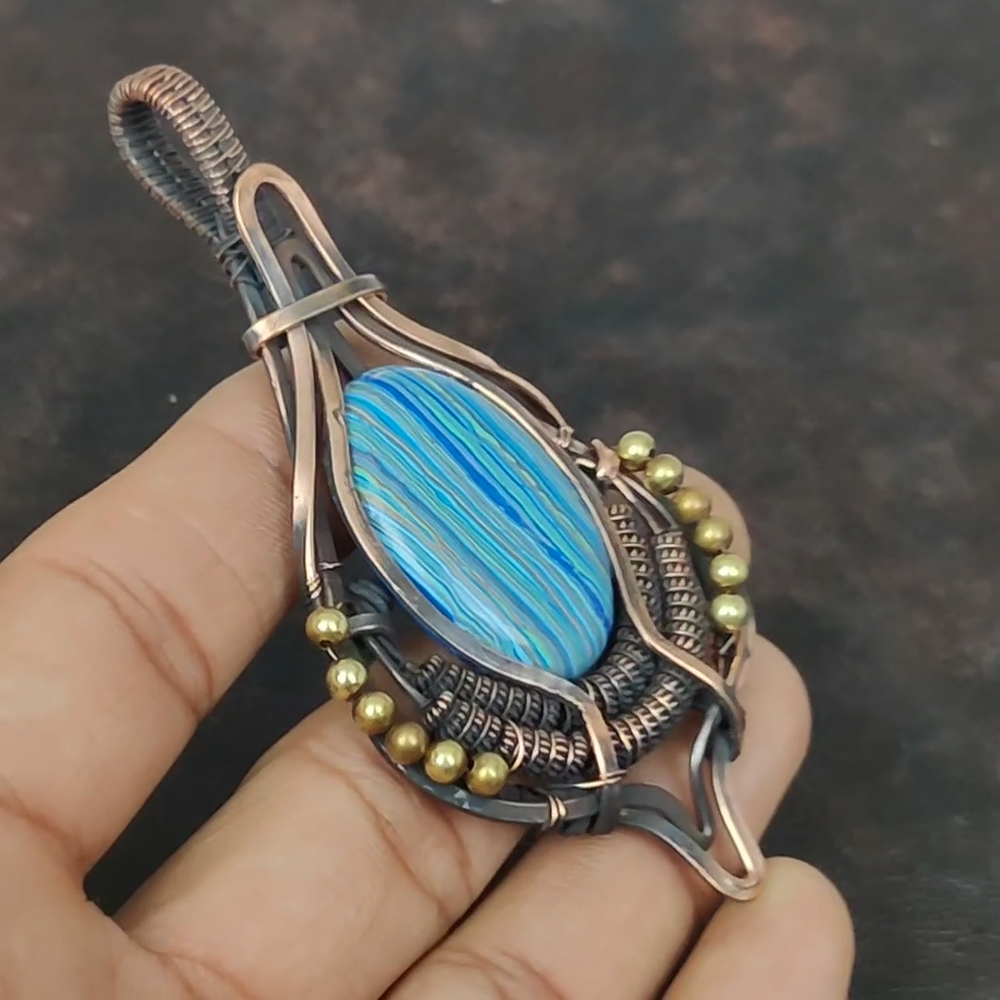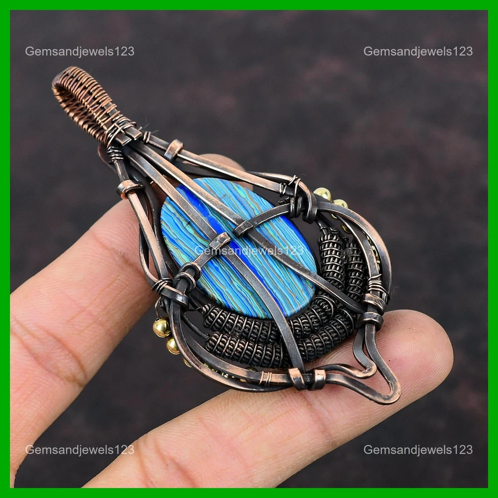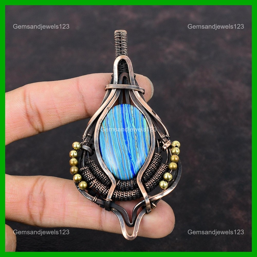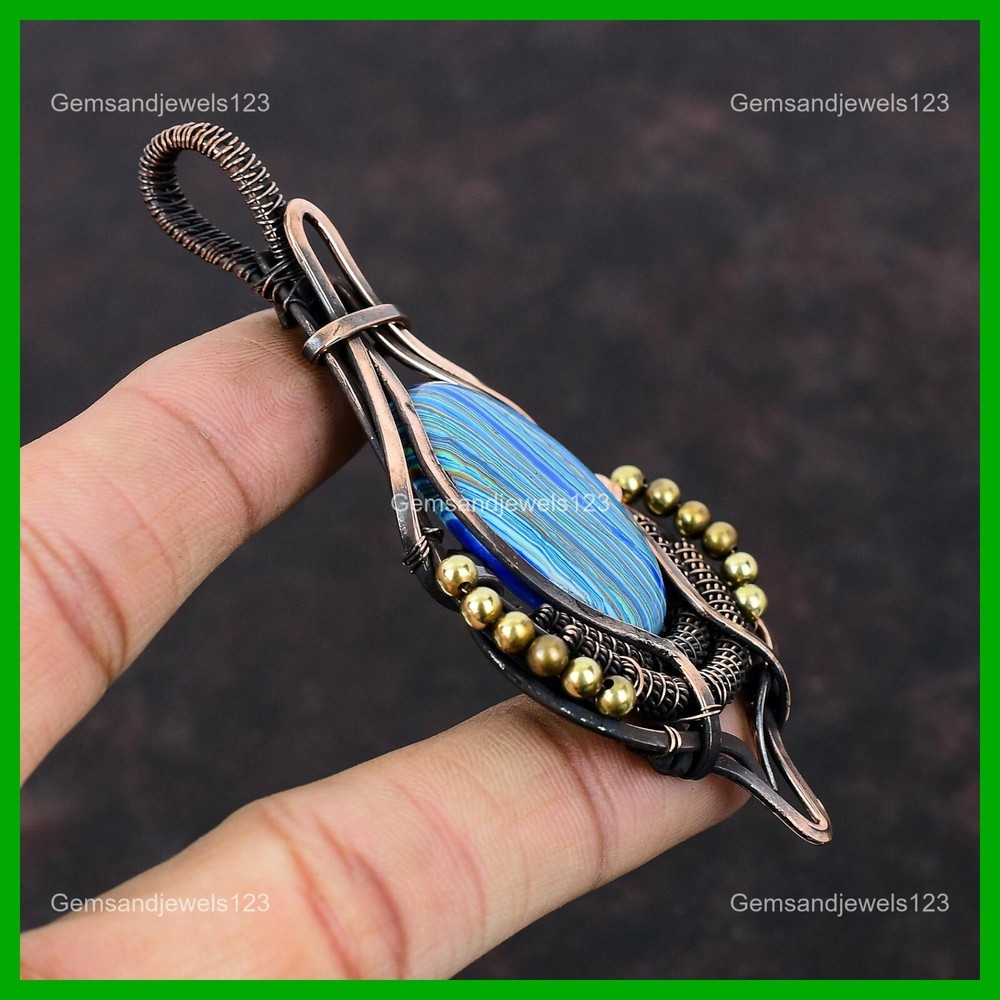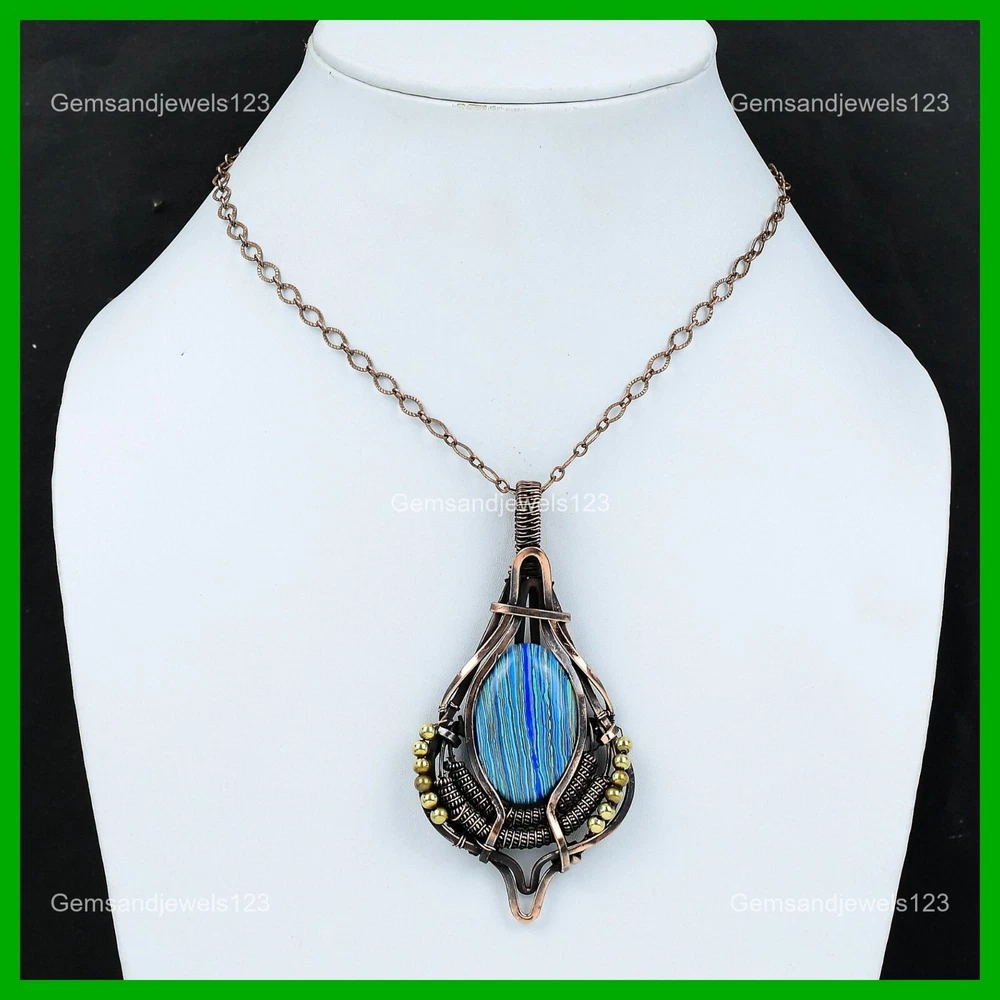 Note : Due to the natural formation of this gemstone. Slight Variation in design and color are to be expected. Welcome to gemsandjewels123 Mothers day Sale Copper Rainbow Calsilica Gemstone Wire Wrapped Pendant Jewelry Handmade Pendant, Wire Wrapped Pendant, Wire Wrapped Jewelry, Copper Pendant, Copper Wire Pendant, Wrapped Jewelry, Wire Wrap Pendant, Wire Wrap Jewelry SKU : VFWP-1357 Gemstone : Rainbow Calsilica Stone Shape : Oval Metal Purity : Unknown Copper Length : 95 Millimeters Width : 50 Millimeters Copper has been used for jewelry making for thousands of years, dating back to ancient civilizations such as the Egyptians, Romans, and Aztecs. Copper was valued for its beauty, versatility, and durability, and was often used to make everything from jewelry and coins to cookware and tools. In addition to its historical significance, copper jewelry also offers several benefits. Copper is a natural conductor of heat and electricity, which makes it ideal for energy healing and therapeutic purposes. Wearing copper jewelry is believed to have various health benefits, such as improving circulation, reducing inflammation, and boosting the immune system. Some people also believe that copper jewelry has the ability to balance energy and improve mood. For Mother's Day Gift For Father's Day Gift For Promise For Valentine's Day For Halloween Party For Christmas Day Gift For New Year Party For Mom For Her If you can't find the information you need or need some advice for your design? Feel free to contact us. We are fast to reply :) All our work is made by hand with Love and Care in our workshop Thank you so much for visiting and hope you enjoy shopping with us gemsandjewels123 is committed to delivering the best quality sterling silver jewelry to customers. As a handmade jewelry manufacturer, we offer an extensive selection of copper gemstone jewelry that showcases the brilliance of our craftsmanship. We are an experienced handmade jewelry supplier with expertise in embellishing gemstones to suit every style. We offer you the liberty to create your jewelry ensemble with sparkling, earthy, and pure gemstones. Our Talented artisans masterfully handcraft each piece of jewelry you see here. Our pieces are made with genuine gemstones. The one-of-a-kind piece you see here is the same exact piece you will receive.