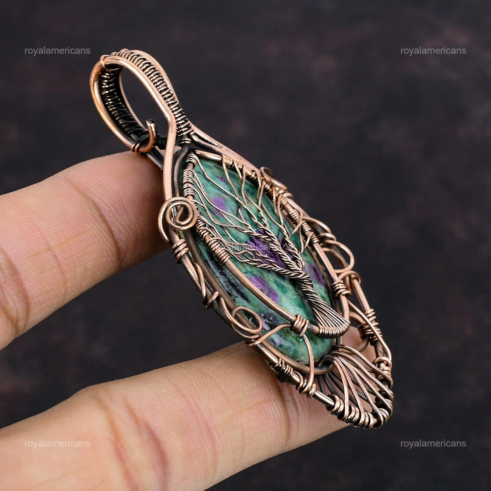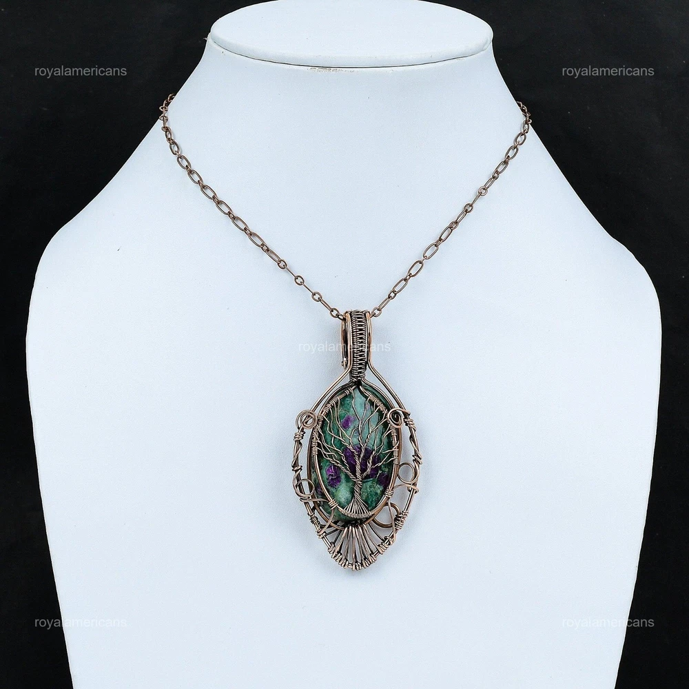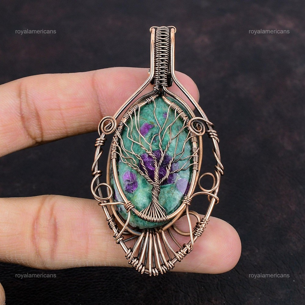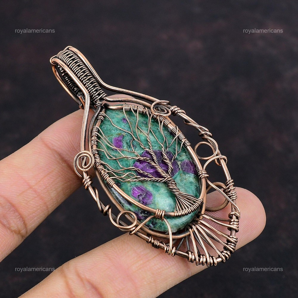 Note : Due to the natural formation of this gemstone. Slight variation in design and color are to be expected. Welcome to Royalamericans Mothers day Sale Copper Ruby Fuchsite Gemstone Wife Tree Of Life Pendant Jewelry Handmade Pendant, Wire Wrapped Pendant, Wire Wrapped Jewelry, Copper Pendant, Copper Wire Pendant, Wrapped Jewelry, Wire Wrap Pendant, Wire Wrap Jewelry SKU : UFWP-931 Gemstone : Ruby Fuchsite Stone Shape : Oval Metal Purity : Unknown Copper Length : 78 Millimeters Width : 40 Millimeters Copper has been used for jewelry making for thousands of years, dating back to ancient civilizations such as the Egyptians, Romans, and Aztecs. Copper was valued for its beauty, versatility, and durability, and was often used to make everything from jewelry and coins to cookware and tools. In addition to its historical significance, copper jewelry also offers several benefits. Copper is a natural conductor of heat and electricity, which makes it ideal for energy healing and therapeutic purposes. Wearing copper jewelry is believed to have various health benefits, such as improving circulation, reducing inflammation, and boosting the immune system. Some people also believe that copper jewelry has the ability to balance energy and improve mood. For Mother's Day Gift For Father's Day Gift For Promise For Valentine's Day For Halloween Party For Christmas Day Gift For New Year Party For Mom For Her If you can't find the information you need or need some advice for your design? Feel free to contact us. We are fast to reply :) All our work is made by hand with Love and Care in our workshop Thank you so much for visiting and hope you enjoy shopping with us Royalamericans is committed to delivering the best quality sterling silver jewelry to customers. As a handmade jewelry manufacturer, we offer an extensive selection of copper gemstone jewelry that showcases the brilliance of our craftsmanship. We are an experienced handmade jewelry supplier with expertise in embellishing gemstones to suit every style. We offer you the liberty to create your jewelry ensemble with sparkling, earthy, and pure gemstones. Our Talented artisans masterfully handcraft each piece of jewelry you see here. Our pieces are made with genuine gemstones.