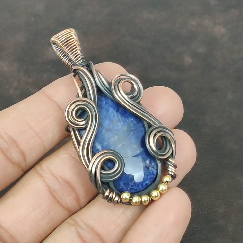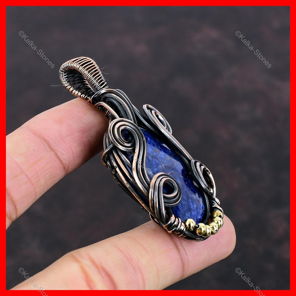 Note : Due to the natural formation of this gemstone. Slight variation in design and color are to be expected. Welcome to Kalka Stones Mothers day Sale Copper Natural Sodalite Wedding New Wire Wrapped Wife Pendant Handmade Pendant, Wire Wrapped Pendant, Wire Wrapped Jewelry, Copper Pendant, Copper Wire Pendant, Wrapped Jewelry, Wire Wrap Pendant, Wire Wrap Jewelry SKU : VFWP-3756 Gemstone : Sodalite Stone Shape : Oval Metal Purity : Unknown Copper Length : 68 Millimeters Width : 34 Millimeters Copper has been used for jewelry making for thousands of years, dating back to ancient civilizations such as the Egyptians, Romans, and Aztecs. Copper was valued for its beauty, versatility, and durability, and was often used to make everything from jewelry and coins to cookware and tools. In addition to its historical significance, copper jewelry also offers several benefits. Copper is a natural conductor of heat and electricity, which makes it ideal for energy healing and therapeutic purposes. Wearing copper jewelry is believed to have various health benefits, such as improving circulation, reducing inflammation, and boosting the immune system. Some people also believe that copper jewelry has the ability to balance energy and improve mood. For Mother's Day Gift For Father's Day Gift For Promise For Valentine's Day For Halloween Party For Christmas Day Gift For New Year Party For Mom For Her If you can't find the information you need or need some advice for your design? Feel free to contact us. We are fast to reply :) All our work is made by hand with Love and Care in our workshop Thank you so much for visiting and hope you enjoy shopping with us Kalka Stones is committed to delivering the best quality jewelry to customers. As a handmade jewelry manufacturer, we offer an extensive selection of copper gemstone jewelry that showcases the brilliance of our craftsmanship. We are an experienced handmade jewelry supplier with expertise in embellishing gemstones to suit every style. We offer you the liberty to create your jewelry ensemble with sparkling, earthy, and pure gemstones. Our Talented artisans masterfully handcraft each piece of jewelry you see here. Our pieces are made with genuine gemstones.