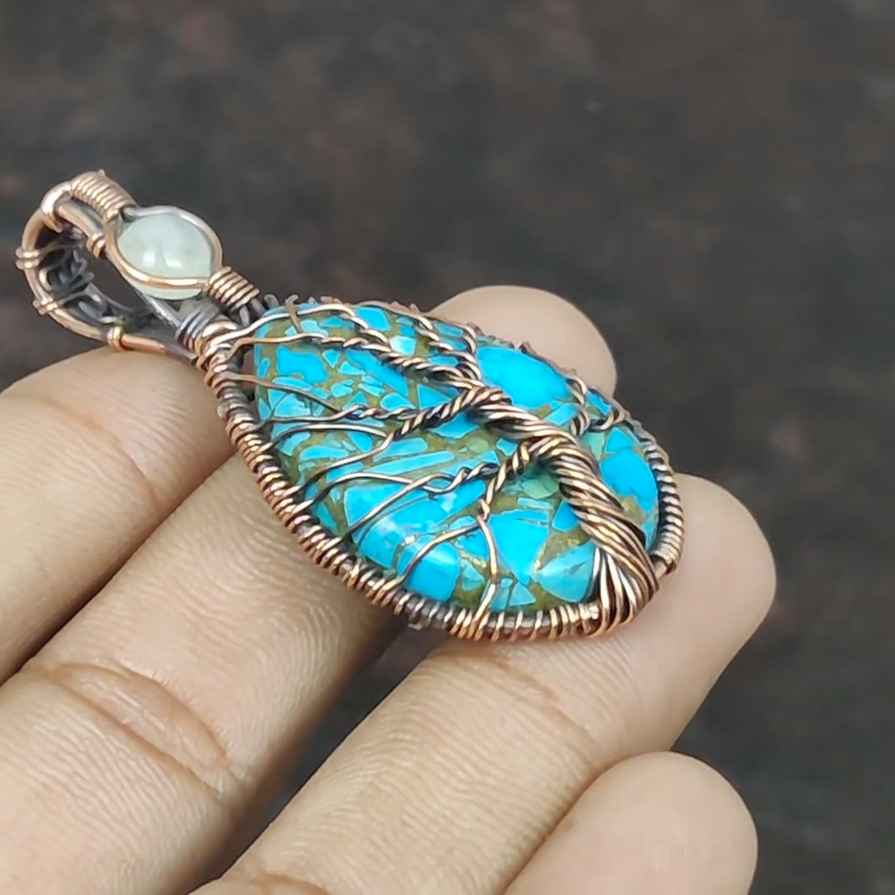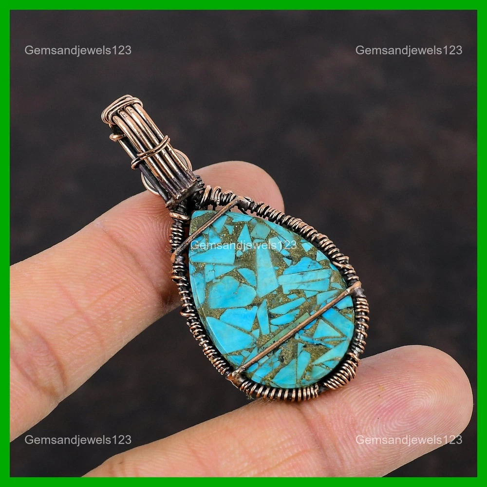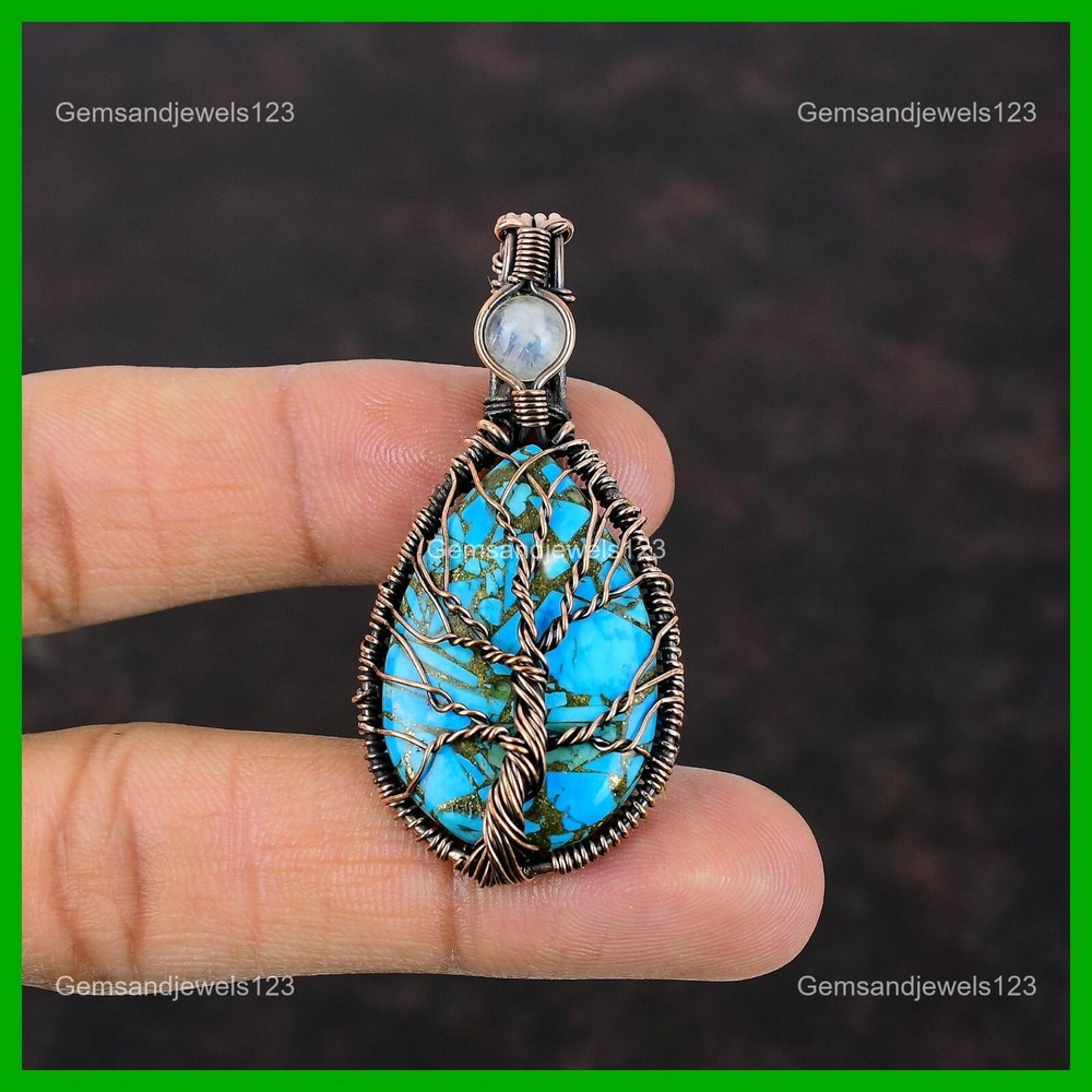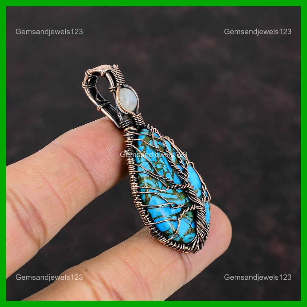 Note : Due to the natural formation of this gemstone. Slight Variation in design and color are to be expected. Welcome to gemsandjewels123 Mothers day Deal Copper Blue Turquoise Stone Rainbow Moonstone Pendant Copper Handmade Pendant, Wire Wrapped Pendant, Wire Wrapped Jewelry, Copper Pendant, Copper Wire Pendant, Wrapped Jewelry, Wire Wrap Pendant, Wire Wrap Jewelry SKU : VFWP-1027 Gemstone : Copper Blue Turquoise Stone Shape : Pear Metal Purity : Unknown Copper Length : 59 Millimeters Width : 28 Millimeters Copper has been used for jewelry making for thousands of years, dating back to ancient civilizations such as the Egyptians, Romans, and Aztecs. Copper was valued for its beauty, versatility, and durability, and was often used to make everything from jewelry and coins to cookware and tools. In addition to its historical significance, copper jewelry also offers several benefits. Copper is a natural conductor of heat and electricity, which makes it ideal for energy healing and therapeutic purposes. Wearing copper jewelry is believed to have various health benefits, such as improving circulation, reducing inflammation, and boosting the immune system. Some people also believe that copper jewelry has the ability to balance energy and improve mood. For Mother's Day Gift For Father's Day Gift For Promise For Valentine's Day For Halloween Party For Christmas Day Gift For New Year Party For Mom For Her If you can't find the information you need or need some advice for your design? Feel free to contact us. We are fast to reply :) All our work is made by hand with Love and Care in our workshop Thank you so much for visiting and hope you enjoy shopping with us gemsandjewels123 is committed to delivering the best quality sterling silver jewelry to customers. As a handmade jewelry manufacturer, we offer an extensive selection of copper gemstone jewelry that showcases the brilliance of our craftsmanship. We are an experienced handmade jewelry supplier with expertise in embellishing gemstones to suit every style. We offer you the liberty to create your jewelry ensemble with sparkling, earthy, and pure gemstones. Our Talented artisans masterfully handcraft each piece of jewelry you see here. Our pieces are made with genuine gemstones. The one-of-a-kind piece you see here is the same exact piece you will receive.