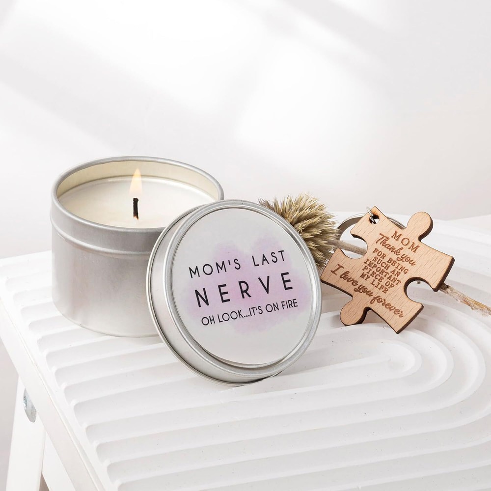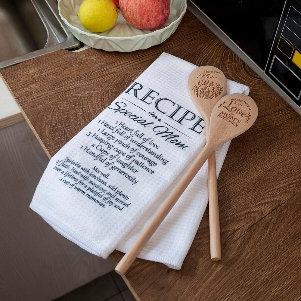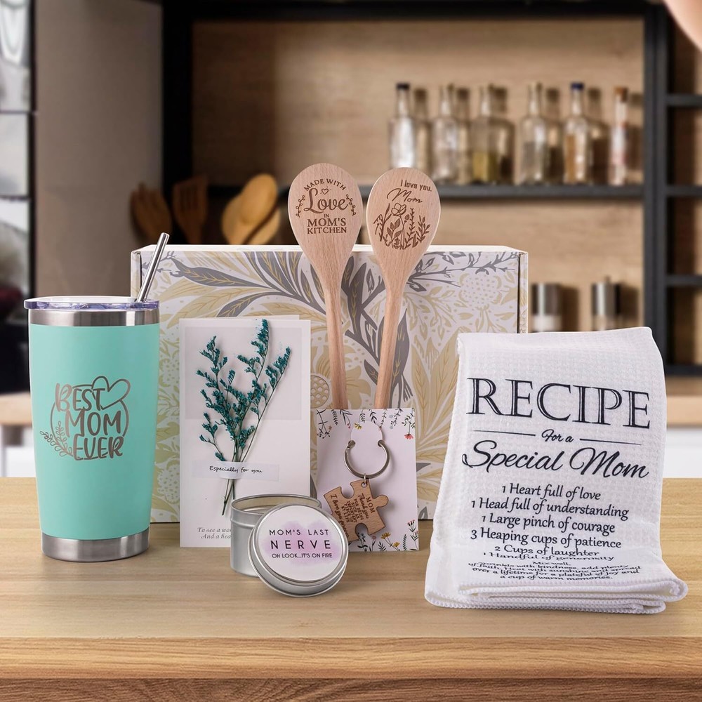 Gifts for the Mom Who Has Everything: Moms hold a special place in our hearts; they give the best hugs and make the most delicious food. Give her a gift that will remind her of your affection every time she uses it. Whether it's her birthday, Mother's Day, or Christmas, you can send these delightful presents to your mom. It's a ready-to-gift package, no wrapping required; you can send it directly as is. Contents of the Gift Basket: Inside this thoughtful gift basket, you'll discover: 1 x 20 oz insulated stainless steel travel cup with a straw, 1 x wooden puzzle-shaped keychain, 1 x lavender-scented candle, 1 x Mom recipe kitchen towel, 2 x adorable cooking spoons, and 1 x Gift Box with paper filler and card. Laser Engraved "Best Mom Ever" Travel Tumblers with Lid and Straw: This personalized Mom travel tumbler features charming laser engraved artwork that will never fade or wear off. Crafted from high-quality 304 Grade stainless steel (18/8), these Vacuum Tumblers feature Insulated Double-Wall Technology keep beverages cold for over 9 hours and hot for more than 3 hours. This Tumbler holds 20 oz of liquid. Cooking Spoons and Recipe Kitchen Towel for a Special Mom: Mom's cooking is truly unbeatable. Remind her of your love with every stir of the pot! These cooking spoons have heartfelt engravings on the back, a touching gesture from you. Each spoon measures 11" long and 1.9" wide at the top, and they are made from beechwood. The waffled microfiber dishtowel carries a recipe-like message, describing a special mom with admiration and gratitude. The kitchen towel measures 23.6'' by 15.7'' . Mom Definition Candle and Puzzle-Shaped Keychain: This humorous scented candle is handcrafted from natural soy wax infused with premium lavender fragrances. Each candle has a net weight of 4 oz. The puzzle-shaped keychain is engraved with warm words, expressing the deep importance of Mom in your life.