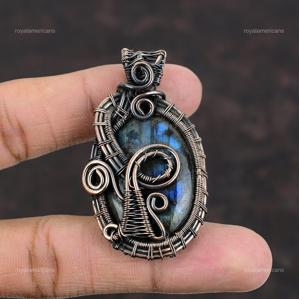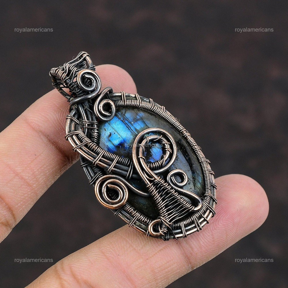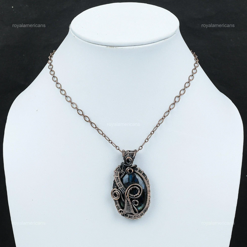 Note : Due to the natural formation of this gemstone. Slight variation in design and color are to be expected. Welcome to Royalamericans Mothers day Deal Natural Labradorite Copper Handmade Engagement Pendant Jewelry Handmade Pendant, Wire Wrapped Pendant, Wire Wrapped Jewelry, Copper Pendant, Copper Wire Pendant, Wrapped Jewelry, Wire Wrap Pendant, Wire Wrap Jewelry SKU : UFWP-360 Gemstone : Labradorite Stone Shape : Oval Metal Purity : Unknown Copper Length : 56 Millimeters Width : 31 Millimeters Copper has been used for jewelry making for thousands of years, dating back to ancient civilizations such as the Egyptians, Romans, and Aztecs. Copper was valued for its beauty, versatility, and durability, and was often used to make everything from jewelry and coins to cookware and tools. In addition to its historical significance, copper jewelry also offers several benefits. Copper is a natural conductor of heat and electricity, which makes it ideal for energy healing and therapeutic purposes. Wearing copper jewelry is believed to have various health benefits, such as improving circulation, reducing inflammation, and boosting the immune system. Some people also believe that copper jewelry has the ability to balance energy and improve mood. For Mother's Day Gift For Father's Day Gift For Promise For Valentine's Day For Halloween Party For Christmas Day Gift For New Year Party For Mom For Her If you can't find the information you need or need some advice for your design? Feel free to contact us. We are fast to reply :) All our work is made by hand with Love and Care in our workshop Thank you so much for visiting and hope you enjoy shopping with us Royalamericans is committed to delivering the best quality sterling silver jewelry to customers. As a handmade jewelry manufacturer, we offer an extensive selection of copper gemstone jewelry that showcases the brilliance of our craftsmanship. We are an experienced handmade jewelry supplier with expertise in embellishing gemstones to suit every style. We offer you the liberty to create your jewelry ensemble with sparkling, earthy, and pure gemstones. Our Talented artisans masterfully handcraft each piece of jewelry you see here. Our pieces are made with genuine gemstones.